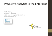 Predictive Analytics in the Enterprise Carlos Bossy Principal Consultant CBIP, Data Mining, MCTS, MCITP BI Quanta Intelligence Introduction Experience o o o 10 years Business Intelligence Consultant Data Warehouse, Integration, Data Mining, Predictive Models 15 years Software Development as Programmer thru CTO Speaker/Author • Speaker at PASS Summit in October • Local and Nationwide Events and Users Groups • Published Chapter on Big Data for Pro SQL Server 2012 Practices Contact Info o o o Email: cbossy@quantaintelligence.com Blog: www.carlosbossy.com Twitter: @carlosbossy Today’s Session Early Morning Late Morning Predictive Modeling Overview Tools and Algorithms SQL Server Data Mining After Lunch Use Models with DMX – C#, SSIS, SSRS Mid Afternoon Late Afternoon Demo – Text Mining with SVM Exercise 1 Demo - Neural Network Code Case Studies Predictive Model by Class Demo\Lab 1 Model Development Demo\Lab 2 – Model Development Exercise 2 Demo 3 – R, WEKA, RapidMiner Introduction Predictive Analytics Predictive Analytics Data Mining Predictive Modeling Math! Just a little…. Predictive Analytics Defined Predictive Analytics is the discovery of predictive information, sometimes hidden, from databases (often large) using related and unrelated data attributes by applying algorithmic analysis, and the creation of models that generate predictive results. Predictive Modeling is the process of creating a model to best predict the probability of an outcome. Data Scientist A Data Scientist incorporates techniques and theories from many fields, including mathematics, statistics, data engineering, pattern recognition and learning, advanced computing, visualization, uncertainty modeling, data warehousing, and high performance computing with the goal of extracting meaning from data. Data science: a novel term used interchangeably with competitive intelligence or business analytics. Predictive Analytics Gartner Hype Cycle The End What do we want to Achieve? Model • Enterprise • Embedded • Demo Data Prediction Predictive Analytics A vital component in the BI Data Architecture and available in real-time to Applications, Reports, ETL Measures (past) Predict (unknown) ROI of Business Analytics Projects when Incorporating Predictive Analytics (Source: IDC) 145% vs 89% Yesterday <-----> Today Legacy o Manageable Volumes of Data Today o The ease and power of SQL o Domain Experts could grasp and analyze a complete Database o Limited CPU Horsepower o Finite Data Explosion of Data doubles every 3 years (Moore’s Law) Data Volumes can’t be comprehended by humans Uncover complex and difficult to find patterns for competitive edge Improve professional judgment of Domain Expert (small but valuable) Knowledge Discovery Converting Data to Information N --> Infinity Applications o o o o o o o o o Credit Risk Analysis Churn Analysis Customer Retention Targeted Marketing Market Basket Analysis Sales Forecasting Stock Predictions Medical Diagnosis Bioscience Research o o o o o o o o o Surveys Insurance Rate Quotes Credit Card Fraud Web Site Events Loan Applications Hiring and Recruiting Cross-Marketing Attendance Anything! Terms to Know Class Variable is the data we are predicting. Instance and Attribute is similar to a row and column used as input to a predictive model. Support refers to the number of instances of a particular pattern. Overfitting (Overtraining) is a flaw in a predictive model where the model reflects the training data too closely. Confusion Matrix (Classification Matrix) is a table showing predicted values and their accuracy. Cross Validation is a way to develop and test a model by using a percentage of the data to test and another . Modeling Methodology / Approach Methodology / Approach Problem Statement What do you want to predict? Is data available? Set a Target Improve on current results Develop Solution Integrate into Applications or Reports Methodology / Approach Gather Data Explore Data Monitor Prepare Data Deploy Training / Test Sets Test Train Choose Algorithms Event Management Model How many people will register for an Event? • • • Simultaneous events managed: > 100 Mean Error: 15% Target Error: 5% Pass 1: 60 days Pass 2: 30 days Pass 3: 7 days Medical Case Management Workplace Injuries Can a case benefit from Nurse Case Management intervention? 95% of Claims < $2500 1% > $10,000 Predict Cost at Intake Gather Data Predictive Analytics DB • Data Warehouse • OLTP • Cube • External • User Data Prepare Data • Transform the data to fit the Problem/Algorithm/Solutions • Get derivations from SMEs, Data Analysis, Groupings • Discrete vs. Continuous • Bins and Buckets (discretize) • Analyze Quantities: logarithmic, binary, linear • Moving Averages: simple, exponential, convergence, divergence • Input to Algorithm in Tabular Form Select Training and Testing Sets Training Testing Choose Algorithm(s) o Time Series o Random Forest o Naïve Bayes o Model Tree o Association o Genetic o Clustering o Support Vector Machine o Regression Tree o Many more … o Logistic Regression o Clustering o Sequence Clustering o Neural Networks Choose Algorithms Clustering Classification Regression Association Decision Tree Yearly Income = 64,387.383+5,984.161*(Cars-2.125)+9,372.900*(Age-60.313)+0.763*(ID17,759.125)+20,740.055*(Children-0.125) Model Training and Testing Apply Algorithms to Training Dataset Test Model using Test Dataset Iterate Model Training and Testing Predictive Model Applications SQL Server Data Mining SQL Server 2005 and 2008 • Analysis Services SQL Server 2012 • Analysis Service Multi-Dimensional Development • Business Intelligence Development Studio • Excel Data Mining Add-in Event Registrations Model Development 7 year record of every individual registration transaction Best Algorithm Decision Tree Daily DW ETL Predicts each Event and Stores Result Personal Business Account/Payment Other Events Transformed data to daily tabular snapshot for