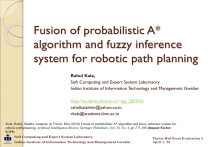Fusion of probabilistic A* algorithm and fuzzy inference system for robotic path planning Rahul Kala, Soft Computing and Expert System Laboratory Indian Institute of Information Technology and Management Gwalior http://students.iiitm.ac.in/~ipg_200545/ rahulkalaiiitm@yahoo.co.in, rkala@students.iiitm.ac.in Kala, Rahul, Shukla, Anupam, & Tiwari, Ritu (2010) Fusion of probabilistic A* algorithm and fuzzy inference system for robotic path planning, Artificial Intelligence Review, Springer Publishers, Vol. 33, No. 4, pp 275-306 (Impact Factor: 0.119) Soft Computing and Expert System Laboratory Indian Institute of Information Technology and Management Gwalior Thesis Mid-Term Evaluation 3 April 1, ‘10 The Problem Inputs ◦ Robotic Map ◦ Location of Obstacles ◦ All Obstacles Static Output ◦ Path P such that no collision occurs Constraints ◦ Time Constraints ◦ Dimensionality of Map ◦ Non-holonomic constraints Soft Computing and Expert System Laboratory Indian Institute of Information Technology and Management Gwalior Thesis Mid-Term Evaluation 3 April 1, ‘10 Approach Path Planning A* Algorithm (Coarser Level) FIS (Finer Level) Soft Computing and Expert System Laboratory Indian Institute of Information Technology and Management Gwalior Thesis Mid-Term Evaluation 3 April 1, ‘10 The two algorithms Path Optimality Non-holonomic Constraints Deadlocks Time Complexity Non-holonomic Constraints Input Size Time Complexity Path Optimality Input Size Deadlocks Soft Computing and Expert System Laboratory Indian Institute of Information Technology and Management Gwalior Disadvantages Disadvantages FIS Advantages Advantages A* Algorithm Thesis Mid-Term Evaluation 3 April 1, ‘10 General Algorithm Training Generate initial FIS Optimize FIS parameters by GA Trained Testing FIS Generate Uncertain Map P ← Path by A* algorithm For all points pi in the solution by A* (i≥2) Use FIS planner using pi as goal and add result to path Stop Soft Computing and Expert System Laboratory Indian Institute of Information Technology and Management Gwalior Thesis Mid-Term Evaluation 3 April 1, ‘10 The 2 level map Map Level 1 Level 2 Soft Computing and Expert System Laboratory Indian Institute of Information Technology and Management Gwalior Thesis Mid-Term Evaluation 3 April 1, ‘10 Lower Resolution Map (xi,yi) (xi+a,yi) (xi+a/2,yi+b/2) (xi,yi+b) (xi+a,yi+b) Soft Computing and Expert System Laboratory Indian Institute of Information Technology and Management Gwalior Thesis Mid-Term Evaluation 3 April 1, ‘10 A* Guidance Soft Computing and Expert System Laboratory Indian Institute of Information Technology and Management Gwalior Thesis Mid-Term Evaluation 3 April 1, ‘10 FIS Planner Angle to goal (α) Distance from goal (dg ) Outputs Turn Angle (β) Distance from obstacle (do) Turn to avoid obstacle (to) Inputs Soft Computing and Expert System Laboratory Indian Institute of Information Technology and Management Gwalior Thesis Mid-Term Evaluation 3 April 1, ‘10 Angle to Goal (α) Goal α= θ- φ θ φ Soft Computing and Expert System Laboratory Indian Institute of Information Technology and Management Gwalior Thesis Mid-Term Evaluation 3 April 1, ‘10 Turn to avoid obstacle (to) Obstacle a b c Robot Soft Computing and Expert System Laboratory Indian Institute of Information Technology and Management Gwalior Thesis Mid-Term Evaluation 3 April 1, ‘10 Membership Functions Angle to goal. Distance to goal. Turn to avoid obstacle Distance from obstacle. Turn (Output) Soft Computing and Expert System Laboratory Indian Institute of Information Technology and Management Gwalior Thesis Mid-Term Evaluation 3 April 1, ‘10 Rules Rule1: If (α is less_positive) and (do is not near) then (β is less_right) (1) Rule2: If (α is zero) and (do is not near) then (β is no_turn) (1) Rule3: If (α is less_negative) and (do is not near) then (β is less_left) (1) Rule4: If (α is more_positive) and (do is not near) then (β is more_right) (1) Rule5: If (α is more_negative) and (do is not near) then (β is more_left) (1) Rule6: If (do is near) and (to is left) then (β is more_right) (1) Rule7: If (do is near) and (to is right) then (β is more_left) (1) Rule8: If (do is far) and (to is left) then (β is less_right) (1) Rule9: If (do is far) and (to is right) then (β is less_left) (1) Rule10: If (α is more_positive) and (do is near) and (to is no_turn) then (β is less_right) (0.5) Rule11: If (α is more_negative) and (do is near) and (to is no_turn) then (β is less_left) (0.5) Soft Computing and Expert System Laboratory Indian Institute of Information Technology and Management Gwalior Thesis Mid-Term Evaluation 3 April 1, ‘10 A* Nodal Cost f(n) = h(n) + g(n) C(n) = f(n)* Grey(P) +(1-Grey(P)) If Grey(P) is 0, it means that the path is not feasible. The fitness in this case must have the maximum possible value i.e. 1 If Grey(P) is 1, it means that the path is fully feasible. The fitness in this case must generalize to the normal total cost value i.e. f(n) All other cases are intermediate Soft Computing and Expert System Laboratory Indian Institute of Information Technology and Management Gwalior Thesis Mid-Term Evaluation 3 April 1, ‘10 A* Nodal Cost - 2 To control ‘grayness’ contribution C(n) = f(n)* Grey’(P) +(1-Grey`(P)) Grey’(P) = 1, if Grey(P) > β Grey(P) otherwise Soft Computing and Expert System Laboratory Indian Institute of Information Technology and Management Gwalior Thesis Mid-Term Evaluation 3 April 1, ‘10 Fitness Function Plots Modified Original Soft Computing and Expert System Laboratory Indian Institute of Information Technology and Management Gwalior Thesis Mid-Term Evaluation 3 April 1, ‘10 Genetic Optimizations Maximize Performance for small sized benchmark Maps Benchmark Maps Used Soft Computing and Expert System Laboratory Indian Institute of Information Technology and Management Gwalior Thesis Mid-Term Evaluation 3 April 1, ‘10 Fitness Function Fi = Li * (1-Oi) * Ti Li : Total