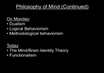 Philosophy of Mind (Continued) On Monday: • Dualism • Logical Behaviorism • Methodological behaviorism Today: • The Mind/Brain Identity Theory • Functionalism The Mind/Brain Identity Theory Water = H2O Mind = Brain The Mind/Brain Identity Theory Water = H2O Mind = Brain This is a conclusion reached by science. You can’t tell what the mind is just by thinking really hard, as Descartes’ and Ryle’s arguments assumed. The Mind/Brain Identity Theory Materialism: All physical events have physical explanations, including human behavior. The Materialist Slogan: No mental difference without a physical difference The Materialist Slogan: No mental difference without a physical difference Materialism: There must be some physical difference between someone who loves jazz and someone who hates jazz. Dualism: Someone who loves jazz could be physically identical to someone who hates jazz. The Materialist Slogan: No mental difference without a physical difference According to Identity Theory: Dualism gets more and more implausible as we learn more about the nervous system. The Materialist Slogan: No mental difference without a physical difference According to Identity Theory: Dualism gets more and more implausible as we learn more about the nervous system. Dualism made sense before we had any way of knowing which physical differences correlated with loving jazz. Now we know. 2,000 years ago, Lucretius was a materialist before it was cool. He believed that the mind is part of the body, so when the body dies, the mind does too. But Lucretius thought the mind was more like a hormone—a chemical substance. 2,000 years ago, Lucretius was a materialist before it was cool. He believed that the mind is part of the body, so when the body dies, the mind does too. But Lucretius thought the mind was more like a hormone—a chemical substance. Since then, the materialist account of the mind has gotten much better. In the same manner, the materialist account of lightning has also improved. In Lucretius’s time, many seriously believed that lightning was made by Zeus. This was not just a cute story. In the same manner, the materialist account of lightning has also improved. In Lucretius’s time, many seriously believed that lightning was made by Zeus. This was not just a cute story. At the time, this was literally the best explanation for lightning and thunder. According to Identity Theory: The materialist account of the mind has gotten a lot better, just as the materialist account of lightning has gotten a lot better. According to Identity Theory: The materialist account of the mind has gotten a lot better, just as the materialist account of lightning has gotten a lot better. Indeed, materialism is now the best explanation for both kinds of events. Like Lucretius, we may not know exactly which physical event correlates with each and every mental event, but we can safely conclude that some physical event correlates with each and every mental event. Like Lucretius, we may not know exactly which physical event correlates with each and every mental event, but we can safely conclude that some physical event correlates with each and every mental event. Identity between mind and brain is offered as the best explanation for these correlations. The best explanation for correlations between mental events and neurological events is identity: The best explanation for correlations between mental events and neurological events is identity: Why is activity in a specific part of the brain always correlated with the enjoyment of jazz? Because that’s what it is to enjoy jazz: activity in that part of the brain just is the enjoyment of jazz. The best explanation for correlations between mental events and neurological events is identity: Why is activity in a specific part of the brain always correlated with the enjoyment of jazz? Because that’s what it is to enjoy jazz: activity in that part of the brain just is the enjoyment of jazz. Do you agree with this? activity in that part of the brain just is the enjoyment of jazz. According to Identity Theory: Dualism is like Vitalism. Both theories posit some special substance as the best explanation for something, but we can now explain those same observations without positing that substance. Vitalism: There is a physical substance—a “vital fluid”— found only in living things. It is the best explanation for what living things all share, and for the differences between living and non-living things. Vitalism: There is a physical substance—a “vital fluid”— found only in living things. It is the best explanation for what living things all share, and for the differences between living and non-living things. Dualism: There is a non-physical substance—a “soul”— found only in humans. It is the best explanation for mental events. Vitalism posits a physical substance, while Dualism posits non-physical substance. Vitalism posits a physical substance, while Dualism posits non-physical substance. Still, Identity Theory says, both posits are superfluous. Identity Theory: The concept of a soul does no explanatory work. (Like the concept of “vital fluid”) Identity Theory: The concept of a soul does no explanatory work. (Like the concept of “vital fluid”) We need a materialist theory anyway, to explain physical things. This same theory can now explain everything Dualism was supposed to explain, but without positing any special substances. Identity Theory: The materialist theory of the mind is a better explanation for mental events than dualism. Identity Theory: The materialist theory of the mind is a better explanation for mental events than dualism. What makes it better? Identity Theory: The materialist theory of the mind is a better explanation for mental events than dualism. What makes it better? Parsimony. We need a materialist theory anyway. We need to explain physical phenomena regardless of what we say about mental phenomena. If this same theory can
