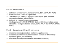 Part 1 - Transcriptomics 1. Definitions (transcriptome, transcriptomics, EST, cDNA, RT-PCR) 2. Transcriptomics – what is it good for? 3. Overview about transcript regulation (eukaryotic gene structure, transcription factors, micro-RNAs) 4. Methods for measuring gene expression (single genes with qPCR, RT-PCR, Northern blotting, multiple genes with cDNA- or oligonucleotide arrays, cDNA-AFLP, DD-RTPCR, SAGE, MPSS) Part 2 – Expression profiling with microarrays 1. Microarray basics (procedure, platforms, applications) 2. Microarray bioinformatics (normalization, analysis of differentially expressed genes, visualization) 3. Microarray stories (examples from microarray research) Part 1 – Transcriptomics (Gene Expression Profiling) The Language Of Transcriptomics Genome = entire DNA sequence of an organism Transcriptome = percentage of the genetic code that is transcribed into RNA molecules (depends on development, environment, time of the day, tissue) = collection of all gene transcripts present in a given cell/tissue at a given time (“snapshot”) Transcriptomics = global analysis of gene expression = genome-wide expression profiling cDNA = complementary DNA synthesized from mature mRNA by the enzyme reverse transcriptase cDNA library = a population of bacterial transformants or phage lysates in which each mRNA isolated form an organism or tissue is represented as its cDNA insertion in a plasmid or a phage vector The Language Of Transcriptomics RT-PCR = a one or two-step process for converting mRNA to cDNA and the subsequent amplifcation of the reversely-transcribed DNA by PCR EST (Expressed Sequence Tag) = small pieces of DNA (200 - 500 bp) generated by sequencing either one or both ends (5’EST and 3’EST) of an expressed gene (cDNA) = can be used to identify unknown genes and to map their positions within a genome Hybridization = based on complementary molecules, sequences that are able to basepair with one another. Adenine is the complement of thymine, guanine is the complement of cytosine. Therefore, the complementary sequence to GT-C-C-T-A will be C-A-G-G-A-T. When two complementary sequences find each other, they will lock together, or hybridize. The Language Of Transcriptomics PCR (Polymerase chain reaction) = technique that results in the exponential amplification of almost any region of a selected DNA molecule = repeated cycles of denaturation, annealing and extension with the amount of DNA template doubling during each cycle The –omics World Genomics (Genome) DNA Genotype Transcription mRNA Transcriptomics (Transcriptome) Translation Protein provide structure & drive metabolism substrate product Proteomics (Proteome) Metabolomics (Metabolome) Phenotype morphology physiology behaviour ecology Common to all -omics: global (often genome-wide) approaches What Can We Learn From Transcriptomics? get an understanding of genes and pathways involved in biological processes (“guilt by association”: genes with similar expression may be functionally related and under the same genetic control mechanism) help elucidating the function of unknown genes based on their spatial and temporal expression identifies marker genes for diagnosis of diseases gene expression is a proxy for cis- and trans- regulation (allows indirect inferences about genetic differences) may be a proxy for changes in the proteome and metabolome Transcriptomics – Regulation of Transcription Structure Of A Eukaryotic Gene Transcribed region 5’ end of gene Upstream regulatory region 5’ untranslated region of mRNA 3’ end of gene Coding sequence ORF (open reading frame) 3’ untranslated region of mRNA Promoter +1 enhancers e.g. ERE CAAT TATA Transcription start AUG Exon Intron Exon Intron Exon Ter Initiator Terminator codon codon UGA, UAA or UAG Basic promoter sequence motifs such as TATA and CAAT, additional promoter elements such as ERE (ethylene response element, in some plant genes) and up- or downstream regulatory regions on the same strand as the coding region are called cis-elements. Before the RNA transcript (mRNA) serves as a template for protein biosynthesis, noncoding sequences (introns) are eliminated, coding sequences (exons) are fused (referred to as ‘splicing’) and the 5‘ and 3‘ untranslated regions (UTRs) are post-transcriptionally modified. Open reading frames (ORFs) that are translated into a protein always start with the initiator codon AUG and end with one of the terminator codons UGA,UAA or UAG. Regulation Of Transcript Abundance By … …transcription factors Close-up of the promoter of the plant gene strictosidine synthase (alkaloid synthesis) Cis - acting elements -339 -208 BA -108 -103 -100 G-Box CrBPF1 -58 JERE CrMyc2 CrGBFs ORCAs +1 TATA STR gene RNA polymerase II Trans - acting factors (= transcription factors) DNA binding proteins that activate or suppress transcription and thus modulate transcript abundance Regulation Of Transcript Abundance By MicroRNAs = miRNAa = small, single-stranded RNA molecules (~21-mer) that bind to complementary of one or more mRNAs (often transcription factor mRNAs) miRNA – RISC complex binding to complementary mRNA Mature miRNA within RNA-induced silencing complex (RISC) miRNAs either degrade or impair the translation of their target mRNAs! Taken from http://www.ambion.com/techlib/resources/miRNA/index.html 4 Hypothetical Scenarios Of Gene Regulation activator act suppressor + red gene sup microRNA gene red gene transcript X act act X red gene red gene cis-mutation X trans-mutation activator cis-mutation in activator red gene sup X cis-mutation in miRNA microRNA gene microRNA transcript activator activator transcript degradatin of activator transcript activator missing red gene Transcriptomics – Methods For Measuring Gene Expression Methods To Detect Single Gene Transcriptional Changes Northern Blotting transcript-specific radioactive probes are used to identify a target mRNA species within an immobilized RNA sample PCR-based based on t