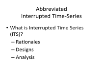 Abbreviated Interrupted Time-Series • What is Interrupted Time Series (ITS)? – Rationales – Designs – Analysis What is ITS? • A series of observations on the same dependent variable over time • Interrupted time series is a special type of time series where treatment/intervention occurred at a specific point and the series is broken up by the introduction of the intervention. • If the treatment has a causal impact, the postintervention series will have a different level or slope than the pre-intervention series The effect can be a change in intercept Number of Calls The effects of charging for directory assistance in Cincinnati 1000 900 800 700 600 500 400 300 200 100 0 1962 Intervention 1964 1966 1968 1970 Year 1972 1974 1976 The effect can be a change in slope Canada Sexual Assault Law Reform 3000 Rape Reform Law Number of Assaults 2500 2000 1500 1000 500 0 1981 1982 1983 1984 1985 Year 1986 1987 1988 The effect can be delayed in time. The effects of an alcohol warning label on prenatal drinking 0.8 prenatal drinking 0.6 Label Law Date 0.4 0.2 0 -0.2 Impact Begins -0.4 -0.6 86 -8 7 -87 -87 -8 8 -88 -88 -8 9 -89 -89 -9 0 -90 -90 -9 1 -91 -91 y y y y y n n n n n p p p p p p J a Ma Se J a Ma Se J a Ma Se J a Ma Se J a Ma Se Se Month of First Prenatal Visit Interrupted Time Series Can Provide Strong Evidence for Causal Effects • Clear Intervention Time Point • Huge and Immediate Effect • Clear Pretest Functional Form + many Observations • No alternative Can Explain the Change How well are these Conditions met in Most Ed Research? • The Box & Jenkins tradition require roughly 100 observations to estimate cyclical patterns and error structure, but • This many data points is rare in education, and so we will have to deviate (but borrow from) the classical tradition. • Moreover,… Meeting ITS Conditions in Educational Research • Long span of data not available and so the pretest functional form is often unclear • Implementing the intervention can span several years • Instantaneous effects are rare • Effect sizes are usually small • And so the need arises to develop methods for abbreviated time series and to supplement them with additional design features such as a control series to help bolster the weak counterfactual associated with a short pretest time series Abbreviated Interrupted Time Series • We use abbreviated ITS loosely – series with only 6 to 50 time points • Pretest time points are important – valuable for estimating pre-intervention growth (maturation) – control for selection differences if there is a comparison time series • Posttest for identifying nature of the response, especially its temporal persistence Theoretical Rationales for more Pretest Data Points in SITS • OXO • Describes starting level/value - yet fallibly so because of unreliability • But pre-intervention individual growth is not assessed, and this is important in education OOXO • Describes initial standing more reliably by averaging the two pretest values • Describes pre-intervention growth better, but even so it is still only linear growth • Cannot describe stability of this individual linear growth estimate OOOXO • Initial standing assessed even more reliably • Individual growth model can be better assessed—allow functional form to be more complex, linear and quadratic • Can assessed stability of this individual growth model (i.e., variation around linear slope) Generalizing to 00000000X0 • Stable assessment of initial mean and slope and cyclical patterns • Estimation of reliability of mean and slope • Help determine a within-person counterfactual • Check whether anything unusual is happening before intervention Threats to Validity: History • With most simple ITS, the major threat to internal validity is history—that some other event occurred around the same time as the intervention and could have produced the same effect. • Possible solutions: – Add a control group time series – Add a nonequivalent dependent variable – The narrower the intervals measured (e.g., monthly rather than yearly), the fewer the historical events that can explain the findings within that interval. Threats to Validity: Instrumentation • Instrumentation: the way the outcome was measured changed at the same time that the intervention was introduced. – In Chicago, when Orlando Wilson took over the Chicago Policy Department, he changed the reporting requirements, making reporting more accurate. The result appeared to be an increase in crime when he took office. – It is important to explore the quality of the outcome measure over time, to ask about any changes that have been made to how measurement is operationalized. Threat to SCV • When a treatment is implemented slowly and diffusely, as in the alcohol warning label study, the researcher has to specify a time point at which the intervention “took effect” – Is it the date the law took effect? – Is it a later date (and if so, did the researcher capitalize on chance in selecting that date)? – Is it possible to create a “diffusion model” instead of a single date of implementation? Construct Validity • Reactivity threats (due to knowledge of being studied) are often less relevant if archival data are being used. • However, the limited availability of a variety of archival outcome measures means the researcher is often limited to studying just one or two outcomes that may not capture the real outcomes of interest very well External Validity • The essence of external validity is exploring whether the effect holds over different units, settings, outcome measures, etc. • In ITS, this is only possible if the time series can be disaggregated by such moderators, which is often not the case. Adding a Control Group Time Series OXO O O • Now we add a comparison group that did not receive treatment and we can • Assess how the two groups differ at one pretest • But only within limits 