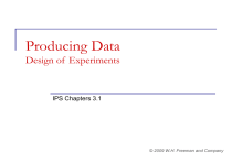 Producing Data Design of Experiments IPS Chapters 3.1 © 2009 W.H. Freeman and Company Objectives (IPS Chapters 3.1) Design of experiments Anecdotal and available data Comparative experiments Randomization Randomized comparative experiments Cautions about experimentation Matched pairs designs Block designs Obtaining data Available data are data that were produced in the past for some other purpose but that may help answer a present question inexpensively. The library and the Internet are sources of available data. Government statistical offices are the primary source for demographic, economic, and social data (visit the Fed-Stats site at www.fedstats.gov). Beware of drawing conclusions from our own experience or hearsay. Anecdotal evidence is based on haphazardly selected individual cases, which we tend to remember because they are unusual in some way. They also may not be representative of any larger group of cases. Some questions require data produced specifically to answer them. This leads to designing observational or experimental studies. Population versus sample Population: The entire group of individuals in which we are interested but can’t usually assess directly. Sample: The part of the population we actually examine and for which we do have data. How well the sample represents the population depends on the sample design. Example: All humans, all working-age people in California, all crickets Population Sample A parameter is a number describing a characteristic of the population. A statistic is a number describing a characteristic of a sample. Observational study: Record data on individuals without attempting to influence the responses. Example: Based on observations you make in nature, you suspect that female crickets choose their mates on the basis of their health. Observe health of male crickets that mated. Experimental study: Deliberately impose a treatment on individuals and record their responses. Influential factors can be controlled. Example: Deliberately infect some males with intestinal parasites and see whether females tend to choose healthy rather than ill males. Observational studies vs. Experiments Observational studies are essential sources of data on a variety of topics. However, when our goal is to understand cause and effect, experiments are the only source of fully convincing data. Two variables are confounded when their effects on a response variable cannot be distinguished from each other. Example: If we simply observe cell phone use and brain cancer, any effect of radiation on the occurrence of brain cancer is confounded with lurking variables such as age, occupation, and place of residence Well designed experiments take steps to defeat confounding. Terminology The individuals in an experiment are the experimental units. If they are human, we call them subjects. In an experiment, we do something to the subject and measure the response. The “something” we do is a called a treatment, or factor. The factor may be the administration of a drug. One group of people may be placed on a diet/exercise program for six months (treatment), and their blood pressure (response variable) would be compared with that of people who did not diet or exercise. If the experiment involves giving two different doses of a drug, we say that we are testing two levels of the factor. A response to a treatment is statistically significant if it is larger than you would expect by chance (due to random variation among the subjects). We will learn how to determine this later. In a study of sickle cell anemia, 150 patients were given the drug hydroxyurea, and 150 were given a placebo (dummy pill). The researchers counted the episodes of pain in each subject. Identify: • The subjects • (patients, all 300) • The factors / treatments • (hydroxyurea and placebo) • And the response variable • (episodes of pain) Comparative experiments Experiments are comparative in nature: We compare the response to a treatment to: Another treatment, No treatment (a control), A placebo Or any combination of the above A control is a situation where no treatment is administered. It serves as a reference mark for an actual treatment (e.g., a group of subject does not receive any drug or pill of any kind). A placebo is a fake treatment, such as a sugar pill. This is to test the hypothesis that the response to the actual treatment is due to the actual treatment and not the subject’s apparent treatment. About the placebo effect The “placebo effect” is an improvement in health not due to any treatment, but only to the patient’s belief that he or she will improve. The “placebo effect” is not understood, but it is believed to have therapeutic results on up to a whopping 35% of patients. It can sometimes ease the symptoms of a variety of ills, from asthma to pain to high blood pressure, and even to heart attacks. An opposite, or “negative placebo effect,” has been observed when patients believe their health will get worse. The most famous, and maybe most powerful, placebo is the “kiss,” blow, or hug—whatever your technique. Unfortunately, the effect gradually disappears once children figure out that they sometimes get better without help and vice versa. Caution about experimentation The design of a study is biased if it systematically favors certain outcomes. The best way to exclude biases from an experiment is to randomize the design. Both the individuals and treatments are assigned randomly. Other ways to remove bias: A double-blind experiment is one in which neither the subjects nor the experimenter know which individuals got which treatment until the experiment is completed. The goal is to avoid forms of placebo effects and biases based on interpretation. The best way to make sure your conclusions are robust is to replicate your experiment—do it over. Replication ensures that particular results are not due to uncontrolled factors or errors of manipulation. Lack of realism Lack o