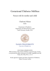 Gestational Diabetes Mellitus Future risk for mother and child Charlotta Nilsson M.D. Department of Paediatrics Department of Clinical Sciences, Lund Lund University, Sweden, 2013 DOCTORAL DISSERTATION With permission of the Faculty of Medicine, Lund University, Sweden, to be presented for public examination at the BMC Segerfalk lecture hall Friday 3th of May 2013, at 13.15 Faculty opponent: Professor Jan Åman, Department of Paediatrics, Örebro University, Sweden 1 Organization LUND UNIVERSITY Faculty of Medicine Department of Paediatrics Department of Clinical Sciences Document name DOCTORAL DISSERATION Date of issue May 3, 2013 Sponsoring organization Author Charlotta Nilsson Title and subtitle Gestational Diabetes Mellitus- Future risk for mother and child Abstract Gestational diabetes mellitus (GDM) occurs as a complication in 2% of all pregnancies in Sweden. Women with GDM have a substantial risk of developing type 2 diabetes later in life, but the risk of developing type 1 diabetes is also increased. GDM increases the risk for macrosomia and caesarean delivery. However, long term prognosis and eventual future risks for children born to mothers with a previous GDM are less well studied. In this thesis women who had GDM during 1995-2010 and their children were investigated. Aims Paper I-III: Determine how many women with GDM that have beta-cell specific autoantibodies such as glutamic acid decarboxylase antibodies (GADA), tyrosine phosphatase antibodies (IA-2A) and zink transporter 8 antibodies (ZnT8A) during pregnancy, and follow these women after delivery to estimate the risk for later development of type 1 diabetes. Evaluate C-peptide levels in women with GDM as a predictor for future development of diabetes. Aims Paper IV: Investigate the effects of maternal GDM on childhood body mass index (BMI) compared to the age-specific reference values in Sweden and to their siblings born after a non-GDM pregnancy. Results Paper I-III: Up to 8% of women with GDM had GADA or IA-2A during pregnancy, and 50% of these women developed type 1 diabetes later in life. GADA was the most frequent autoantibody. When adding ZnT8A as an autoimmune marker in GDM, the number of autoantibody positive women increased by 2%. C-peptide analyses did not add any valuable information for development of either type 1 or type 2 diabetes. Results Paper IV: BMI for boys was higher at ages 7-10 and for girls at birth and ages 4-12 compared to Swedish reference values. The same BMI pattern was found in siblings born after a non-GDM pregnancy. Conclusions Paper I-III: Since 50% of women with autoantibodies during GDM develop type 1 diabetes later in life, at least GADA analyses should be performed in all women with GDM by routine. Conclusions Paper IV: Children to women with a prior GDM have a high risk for overweight and obesity. This is thought to be due to life style habits in the family rather than prenatal factors, even if genetic factors could not be tested in this study, since similar BMI pattern was found in siblings. Early life style intervention is therefore very important in these families. Key words Gestational Diabetes Mellitus, autoantibody, GADA, ZnT8A, C-peptide, overweight, offspring Classification system and/or index terms (if any) Supplementary bibliographical information Language English ISSN and key title 1652-8220, Lund University, Faculty of Medicine Doctoral Dissertation Series 2013:42 Recipient’s notes Number of pages 120 ISBN 978-91-87449-12-3 Price Security classification Distribution by (name and address) Charlotta Nilsson, Dep Paediatrics, Helsingborg Hospital, 251 87 Helsingborg I, the undersigned, being the copyright owner of the abstract of the above-mentioned dissertation, hereby grant to all reference sources permission to publish and disseminate the abstract of the above-mentioned dissertation. Signature 2 Date Mars 26, 2013 Gestational Diabetes Mellitus Future risk for mother and child Charlotta Nilsson M.D. Department of Paediatrics Department of Clinical Sciences Lund University Sweden 2013 3 Cover picture from Wikipedia, created by Isaac Yonemoto, showing six insulin molecules assembled in a hexamer. Copyright © Charlotta Nilsson Lund University, Faculty of Medicine Doctoral Dissertation Series 2013:42 ISBN 978-91-87449-12-3 ISSN 1652-8220 Printed in Sweden by Media-Tryck, Lund University Lund 2013 A part of FTI (the Packaging and Newspaper Collection Service) 4 To my wonderful parents 5 6 Table of contents Original papers 9 Abbreviations 11 Background 13 History of diabetes mellitus 13 History of gestational diabetes mellitus 14 History of autoantibodies 15 History of C-peptide 17 Classification of diabetes mellitus Type 1 diabetes Type 2 diabetes Gestational diabetes mellitus 19 19 19 20 Epidemiology of diabetes mellitus 20 Diagnostic criteria for diabetes mellitus 21 Diagnostic criteria for gestational diabetes mellitus 22 Changes during pregnancy with gestational diabetes mellitus Metabolism Insulin resistance 23 23 24 Future risk for the mother 24 Future risk for the child 25 Aims 27 Materials and Methods 29 Subjects Paper I Paper II Paper III Paper IV 29 30 30 30 31 Analyses 31 7 Islet cell antibodies (ICA) Glutamic acid decarboxylase antibodies (GADA) Tyrosine phosphatase antibodies (IA-2A) Zink transporter 8 antibodies (ZnT8A) C-peptide Statistical methods Paper I Paper II Paper III Paper IV Results 31 31 32 32 32 33 33 33 33 34 35 Paper I Follow-up 35 36 Paper II C-peptide 39 39 Paper III C-peptide in relation to later development of diabetes C-peptide correlations in women with GDM Follow-up of the autoantibody positive women with GDM 40 40 41 41 Paper IV 44 Discussion 51 Paper I-III Key points in Paper 1, Paper II and Paper III 51 53 Paper IV Key points in Paper IV 54 56 Conclusions 57 Future research 59 Svensk sammanfattning Studiedesign Metod Resultat Slutsats 61 62 62 62 63 Acknowledgements 65 References 67 8 Original papers This thesis is based on the following