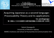 10 July, 2014 シドニー日本語教育国際研究大会 International Conference on Japanese Language Education Acquiring Japanese as a second language: Processability Theory and its applications to pedagogy 第二言語としての日本語習得:処理可能性理論とその教育分野への応用 Satomi Kawaguchi University of Western Sydney MARCS Institute and School of Humanities & Communication Arts 1 Outline 1. Introduction & some background 2. Processability Theory (PT) 3. Developmental stages (PT) in Japanese L2 Morphology Syntax: the Prominence Hypothesis the Lexical Mapping Hypothesis 4. Promoting higher structures (beyond intermediate level) 5. Emergence of a structure and its automatization 6. Digital technologies & evaluation of language development using PT 7. Concluding remarks 2 Introduction • Processability Theory (Pienemann 1998): A theory of SLA focusing on L2 development • Theory-Practice-Evaluation link in teaching and learning Japanese L2 3 Short history of Processability Theory (PT) PT originates in the ZISA (Zweitsprachenwerb Italianisher und Spanisher Arbeiter) project • It produced ‘one of the most important bodies of SLA research to date’ Larsen-Freeman & Long (1991, p. 270) in terms of: data, methodology and SLA theory development When: late Seventies ~ early Eighties Who directed by Jurgen Meisel, with Harald Clahsen and Manfred Pienemann (1983); see also Meisel, Clahsen and Pienemann (1981) Informants: ZISA studied Italian and Spanish adult guest workers acquiring German as a second language. Where: mainly at the University of Hamburg (Germany) under the direction of Jurgen Meisel, supported by the Volkswagen Foundation. 4 ZISA: findings • After an initial period of production, characterised by single words and formulaic expressions, learners did not abandon one rule for the next but accumulated rules, adding new ones while retaining the old ones. • All learners followed the same five-stage developmental sequence (despite individual differences and different language background) • All learners acquired these five rules in the same sequence. These rules formed an implicational scale: which means that the acquisition of a rule implies the acquisition of the earlier rule(s). They were called (shorthand name): SVO > ADV > SEP > INV > V-END 5 Was this sequence replicated in other studies? • And indeed, YES, this basic sequence of acquisition of GSL word order, was also confirmed for immigrant children and in studies of acquisition of German (GFL) in formal contexts (Eubank 1986, 1987; Jansen 1991; Pienemann 1980, 1981, 1984). • • GSL=German as a Second Language GFL = German as a Foreign Language 6 Teachability Hypothesis (Pienemann, 1984; 1988; 1998) This hypothesis addresses the influence of formal instruction on L2 acquisition, i.e., What to teach When. There is a fixed path in L2 acquisition. This sequence should be implicational: Stage 1 < Stage 2 < Stage 3, etc., 7 Pienemann’s study (1984) Stage of acquisition Informants’ stage BEFORE instruction Informants’ stage AFTER instruction Teach Mimmo Stage 4 INV INV (Stage 4) ----- Giovanni, SEP (Stage 3) Giovanni, Mimmo -------- ADV (Stage 2) Teresa, Monica Teresa, Monica SVO (Stage 1) Carmine Carmine INV=Inversion, SEP = Verb separation, ADV = Adverb fronting 8 Stage of acquisition Informants’ stage BEFORE instruction Informants’ stage AFTER instruction INV (Stage 4) ----- Giovanni, Mimmo SEP (Stage 3) Giovanni, Mimmo -------- ADV (Stage 2) Teresa, Monica Teresa, Monica SVO (Stage 1) Carmine Carmine INV=Inversion, SEP = Verb separation, ADV = Adverb fronting 9 Findings from the teachability experiment • Stages cannot be skipped, despite focused instruction, because the cognitive processing of one stage is the prerequisite for the subsequent one. • Instruction will be beneficial if it focuses on structures for which the learner is “developmentally ready” (cf. Corder 1967) 10 ZISA downunder. The empirical basis for English developmental stages: the SAMPLE project (Johnston 1985) • The empirical basis was provided by an extensive Australian project carried out by Malcolm Johnston, at the NSW Institute of Technology, supported by the AMES (Dept of Immigration) in the midSeventies to mid Eighties. • Johnston studied, cross-sectionally 12 Polish and 12 Vietnamese immigrants at a range of times after their arrival in Australia. the SAMPLE report = Syntactic and Morphological Progressions in Learners’ English (1984) 11 Pieneman working with Johnston, adapted the ZISA Strategies framework to the interpretation of the ESL data collected through SAMPLE and expanded the framework to include English morphological sequences as well as Syntax. Pienemann and Johnston brought about what Michael Long called The Predictive Framework (Larsen-Freeman & Long 1991) that is a framework for SLA which was capable of making predictions to be tested empirically. 12 Table 1: POLISH ADULT LEARNERS OF ESL (Johnston 1997, 2000) Table 3: VIETNAMESE ADULT LEARNERS OF ESL (Johnston 1997, 2000) 13 Limitations Problems of ZISA The “strategies” as an explanatory principle are not plausible for the human mind. So, Processability Theory adopts processing prerequisites that is, the learner builds up additional processing resources in order to process the L2 and gradually deploys these in an automatic way. 14 2. Processability Theory (Pienemann 1998) 処理可能性理論 • Processability Theory (PT) is a theory of second language processing that formally predicts syntactic & morphological ‘developmental trajectories’ for any given L2 (so it is assumed to work universally). • Processability relates to how the L2 is acquired under real-time constraints of speech production, given the limited capacity of the human language processor. 15 PT key principle • The key to predicting which grammatical structures are processable - and in which sequence - is which pieces of grammatical information c