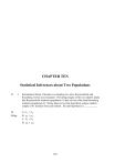 CHAPTER TEN Statistical Inferences about Two Populations D M BApp 1. Restaurateur Denny Valentine is evaluating two sites, Raymondville and Rosenberg, for his next restaurant. Prevailing images of the two suburbs imply that Raymondville residents (population 1) dine out less often than Rosenberg residents (population 2). Denny plans to test this hypothesis using a random sample of 81 families from each suburb. His null hypothesis is __________. A. 1 < 2 B. 1 > 2 C. P1 = P2 D. 1 2 303 304 Test Bank B 2. A. 1 < 2 B. 1 > 2 C. P1 = P2 D. 1 2 M BApp D 3. M BCalc A M BCalc Restaurateur Denny Valentine is evaluating two sites, Raymondville and Rosenberg, for his next restaurant. Prevailing images of the two suburbs imply that Raymondville residents (population 1) dine out less often than Rosenberg residents (population 2). Denny plans to test this hypothesis using a random sample of 81 families from each suburb. His alternate hypothesis is __________. Restaurateur Denny Valentine is evaluating two sites, Raymondville and Rosenberg, for his next restaurant. Prevailing images of the two suburbs imply that Raymondville residents (population 1) dine out less often than Rosenberg residents (population 2). Denny commissions a market survey to test this hypothesis. The market researcher used a random sample of 64 families from each suburb, and reported the following: x 1 = 15 times per month, x 2 = 14 times per month, S1 = 2, and S2 = 3. Assuming = .01, the critical Z value is _________________. A. B. C. D. 4. -1.96 1.96 -2.33 2.33 Restaurateur Denny Valentine is evaluating two sites, Raymondville and Rosenberg, for his next restaurant. Prevailing images of the two suburbs imply that Raymondville residents (population 1) dine out less often than Rosenberg residents (population 2). Denny commissions a market survey to test this hypothesis. The market researcher used a random sample of 64 families from each suburb, and reported the following: x 1 = 15 times per month, x 2 = 14 times per month, S1 = 2, and S2 = 3. Assuming = .01, the calculated Z value is _________________. A. 2.22 B. 12.81 C. 4.92 D. 3.58 Chapter 10: Statistical Inferences for Two Populations 305 D 5. H BCalc D A. B. C. D. 6. H BCalc B H BCalc Restaurateur Denny Valentine is evaluating two sites, Raymondville and Rosenberg, for his next restaurant. Prevailing images of the two suburbs imply that Raymondville residents (population 1) dine out less often than Rosenberg residents (population 2). Denny commissions a market survey to test this hypothesis. The market researcher used a random sample of 64 families from each suburb, and reported the following: x 1 = 15 times per month, x 2 = 14 times per month, S1 = 2, and S2 = 3. Assuming = .01, the appropriate decision is _________________. reject the null hypothesis 1 < 2 accept the alternate hypothesis 1 > 2 reject the alternate hypothesis n1 = n2 = 64 do not reject the null hypothesis 1 2 Restaurateur Denny Valentine is evaluating two sites, Raymondville and Rosenberg, for his next restaurant. Prevailing images of the two suburbs imply that Raymondville residents (population 1) dine out less often than Rosenberg residents (population 2). Denny commissions a market survey to test this hypothesis. The market researcher used a random sample of 64 families from each suburb, and reported the following: x 1 = 16 times per month, x 2 = 14 times per month, S1 = 4, and S2 = 3. Assuming = .01, the calculated Z value is _________________. A. 18.29 B. 6.05 C. 5.12 D. 3.20 7. Restaurateur Denny Valentine is evaluating two sites, Raymondville and Rosenberg, for his next restaurant. Prevailing images of the two suburbs imply that Raymondville residents (population 1) dine out less often than Rosenberg residents (population 2). Denny commissions a market survey to test this hypothesis. The market researcher used a random sample of 64 families from each suburb, and reported the following: x 1 = 16 times per month, x 2 = 14 times per month, S1 = 4, and S2 = 3. Assuming = .01, the appropriate decision is _____. A. reject the null hypothesis 1 < 2 B. accept the alternate hypothesis 1 > 2 C. reject the alternate hypothesis n1 = n2 = 64 306 Test Bank D. do not reject the null hypothesis 1 2 A 8. E BApp C American First Banks' policy requires consistent, uniform training of employees at all banks. Consequently, David Desreumaux, VP of Human Resources, is planning a survey of mean employee training time in the Southeast region (population 1) and the Southwest region (population 2). His null hypothesis is ___________. A. B. C. D. 9. American First Banks' policy requires consistent, uniform training of employees at all banks. Consequently, David Desreumaux, VP of Human Resources, is planning a survey of mean employee training time in the Southeast region (population 1) and the Southwest region (population 2). His alternate hypothesis is _______. E BApp A. B. C. D. B American First Banks' policy requires consistent, uniform training of employees at all banks. Consequently, David Desreumaux, VP of Human Resources, orders a survey of mean employee training time in the Southeast region (population 1) and the Southwest region (population 2). His staff randomly selected personnel records of 81 employees from each region, and reported the following: x 1 = 30 hours, x 2 = 27 hours, S1 = 6, and S2 = 6. Assuming a two-tail test and = .05, the critical Z values are _________________. 10. E BCalc A. B. C. D. -1.64 and 1.64 -1.96 and 1.96 -1.64 and 1.96 -2.33 and 2.33 Chapter 10: Statistical Inferences for Two Populations 307 C 11. American First Banks' policy requires consistent, uniform training of employees at all banks. Consequently, David Desreumaux, VP of Human Resources, orders a survey of mean employee training time in the Southeast region (population 1) and the Southwest region (population 2). His staff randomly selected personnel records of 81 employees from each region, and reported the following: x 1 = 30 hours, x 2