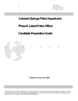 . . . . . . . . . . Colorado Springs Police Department SHL USA, Inc. Public Safety Division 300 South Burrowes Street State College, PA 16801 Phase II: Lateral Police Officer Candidate Preparation Guide . . . . . . . . . . Updated January 29, 2008 Copyright © by the SHL Public Safety Division. All rights reserved. No part of this guide may be reproduced or utilized in any form or by any means, electronic or mechanical, including photocopying, recording, or by any information storage and retrieval system, without permission in writing from the SHL Public Safety Division. TABLE OF CONTENTS INTRODUCTION ............................................................................................................................ 1 PART I: PHYSICAL ABILITY TEST (PAT) ..................................................................................... 2 SECTION I: SUMMARY OF PAT ....................................................................................... 2 A. General Description ................................................................................................. 2 B. Lateral Police Officer PAT ........................................................................................ 2 SECTION II: PREPARING TO BEGIN A FITNESS PROGRAM ....................................... 4 A. Medical and General Health Factors ....................................................................... 4 B. Principles of Training.............................................................................................. 12 C. Assessing Your Current Level of Fitness .............................................................. 15 SECTION III: FITNESS PROGRAM................................................................................. 19 A. B. C. D. E. F. General Directions for Fitness Program ................................................................ 19 Warm-Up ................................................................................................................ 20 Calisthenics ............................................................................................................ 26 Weight Training ...................................................................................................... 29 Aerobic Training Program ...................................................................................... 37 Cool-Down .............................................................................................................. 38 SECTION IV: WEEKLY LOG PAGES .............................................................................. 39 A. Weekly Log: Calisthenics and Aerobic Exercises ................................................ 39 B. Weekly Log: Weight Training and Aerobic Exercises .......................................... 40 SECTION V: APPLICATION OF THE FITNESS PROGRAM TO POLICE OFFICER TASKS AND THE PAT .............................................. 41 SECTION VI: REFERENCES USED IN THE PAT SECTION OF THIS GUIDE ............. 45 PART II: COMMUNITY POLICING EXERCISE ............................................................................ 46 SECTION I: GENERAL DESCRIPTION .......................................................................... 46 A. Content ................................................................................................................... 46 B. Participation ............................................................................................................ 47 C. Evaluation .............................................................................................................. 47 SECTION II: TEST-TAKING AND PREPARATION STRATEGIES ................................ 50 A. Specific Test-Taking Strategies ............................................................................. 50 B. Preparation Strategies ........................................................................................... 50 CONCLUSION............................................................................................................................... 53 ii INTRODUCTION This Candidate Preparation Guide has been distributed to help you prepare for Phase II of the Colorado Springs Police Department (CSPD) Lateral Police Officer Examination. We are providing this information in recognition of the fact that a considerable amount of the anxiety associated with participation in examinations is related to the novelty of the procedures that candidates encounter. This guide covers the Physical Ability Test, and the Community Policing Exercise of the CSPD Lateral Police Officer Examination. The overall examination for Lateral Police Officers in the CSPD consists of five test components: the Ability Test, the Work Styles Questionnaire, the Life Experience Survey, the Physical Ability Test, and the Community Policing Exercise. The Lateral Police Officer Examination is being administered in two phases. As part of Phase I, candidates were asked to participate in the Law Enforcement Aptitude Battery which consisted of the three written test components (e.g. Ability Test, Work Styles Questionnaire, and Life Experience Survey). Phase II consists of the Physical Ability Test and Community Policing Exercise. The top performing candidates on Phase I will be invited to participate in Phase II of the Lateral Police Officer Examination. Only those candidates who complete both phases will receive a final score for the examination. The Physical Ability Test is designed to assess a candidate’s capacity to perform the tasks ordinarily performed by a police officer while on the job. This is accomplished by requiring candidates to perform a series of events that simulate activities police officers perform on the job in order to measure the physical abilities required to perform the police officer’s job. The Physical Ability Test measures cardiovascular fitness, muscle strength, muscular endurance and flexibility. The Community Policing Exe