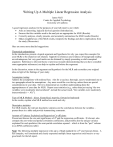 Writing Up A Multiple Linear Regression Analysis James Neill Centre for Applied Psychology University of Canberra A good regression analysis for the purposes of your lab report is one which: Asks an interesting, logically derived question (Introduction), Ensures that the variables used in the analysis are appropriate for MLR (Results) Correctly analyses, clearly presents, and accurately summarises the MLR results (Results) Makes insightful use of the MLR results, interprets the findings and draws implications from the study (Discussion) Here are some more detailed suggestions: Theoretical underpinning: In the introduction, present a logical argument and hypothesis for why you expect the concepts (for your MLR) to be related (or not related). Supportive references and evidence of background reading are advantageous, but very good marks can be obtained by simply presenting a solid conceptual argument. Reference to relevant theory or previous research (demonstrating that you have consulted some appropriate references) can help to explain and bolster the argument. In the discussion, return to the argument and hypothesis for the MLR and reconsider your original ideas in light of the findings of your study. Assumption testing: Address the assumptions with minimal fuss. Aim for a succinct, thorough, easy-to-understand one to two paragraphs about the assumptions. Any more would be over the top, unless there are special considerations in your data. Strive to demonstrate an excellent understanding about the appropriateness of your data for MLR. Report exact statistics (e.g., rather than just saying “the two variables were moderately intercorrelated”, include the actual result, “the variables were moderately intercorrelated (r = .43)”). Type of MLR Method – direct, hierarchical, stepwise, forward or backward: In the results, explain what MLR method was used and why. Descriptive statistics: For MLR results, the relevant descriptive statistics are the correlations between the variables – present these in a table and provide summarising comments. Amount of Variance Explained and Regression Co-efficients: Present and discuss the size and significance of R2 and the regression coefficients. If relevant, also compare the zero-order and partial correlation coefficients, and possibly also the unique variance explained for each predictor (the semi-partial correlation squared – which is from the “part” column in an SPSS coefficients table) Note: The following multiple regression write-up is of high standard for a 4th year honours thesis. A less complex, well conducted and clearly expressed multiple linear regression could receive a very good mark for the lab report. SAMPLE MULTIPLE LINEAR REGRESSION ANALYSIS WRITE-UP Use of Non-Productive Coping Strategies Predicts Adolescents’ Psychological Distress During Outdoor Education Programs James Neill Centre for Applied Psychology University of Canberra May, 2007 Introduction When faced with problems or concerns, people would ideally cope in ways that alleviated their psychological distress. However, people often also cope in ways that exacerbate their problems and cause more psychological distress. Previous research has identified some coping strategies as being associated with worse outcomes. This has been demonstrated in studies in which participants rate the effectiveness of their various coping strategies (Abello-Rodriguez, 2000; Balgir, 2000; Gibson, 2000) and in studies of academic achievement (Parsons, Frydenberg, & Poole, 1996). In a previous study, Neill and Heubeck (1997) found that use of non-productive strategies (a composite variable consisting of Ignore, Self-Blame, Worry, Tension Reduction, Wishful Thinking, Keep to Self, and Not Coping) was a significant predictor of adolescents’ mental health during outdoor education programs. However, this study did not identify which of the non-productive strategies were most important in predicting psychological distress. It would seem logical, for example, that a strategy such as ignoring a problem or concern during a challenging outdoor education experience would contribute to more problems as the program continues, thus increasing the levels of psychological distress. Likewise, but for different reasons, worrying about a problem would seem likely to contribute to further psychological distress because it doesn’t directly solve a problem and the worry itself indicates a state of psychological distress. In addition, use of coping strategies such as self-blaming, reducing tension through acting out, displacing the tension into somatic symptoms, and wishful thinking also seem likely to contribute to psychological distress. In the current study, six non-productive coping strategies were used as predictors of psychological distress. Each strategy was hypothesised to be a useful predictor of adolescents’ level of psychological distress experienced during a challenging outdoor education program. In other words, higher usage of these coping strategies was hypothesised to be associated with greater levels of psychological distress. Method Participants Data was collected from 224 Year 9 and Year 10 participants (122 males; 102 females) with an average age of 14.4 years. Participants were from four different high schools and were involved in 9 day Outward Bound Australia programs during 1994 which were made compulsory by their high school. Materials Composite scores for six coping scales – Not Coping, Wishful Thinking, Worry, Not Coping, SelfBlame, and Somatic Coping -- were computed based on the means of target items identified in a factor analysis of the 32 non-productive Adolescent Coping Scale items (ACS; Frydenberg & Lewis, 1993) by Neill (2001a). Fourteen items were used to compute the six scales, with one scale indicated by only one item (Tension Reduction) and the other scales indicated by two to four items used for Not Coping. These coping factors exhibited moderate to good internal 