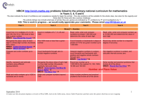 NRICH http://nrich.maths.org problems linked to the primary national curriculum for mathematics in Years 3, 4, 5 and 6 The stars indicate the level of confidence and competence needed to begin the activity. One star problems will be suitable for the whole class, two stars for the majority and three stars for those who like a serious challenge. The activity listings now include what type of activity they are: games are indicated by ‘G’, problems by ‘P’ and investigations by ‘I’. N.B. This is work in progress – we would really appreciate your comments. Please email emp1001@cam.ac.uk Year 3 Year 4 Year 5 Year 6 Strand 1 – Number Count from 0 in multiples of 4, 8, 50 and 100; find 10 or 100 more or less than a given number NRICH: How Would We Count? * P Count in multiples of 6, 7, 9, 25 and 1000 Read, write, order and compare numbers to at least 1 000 000 and determine the value of each digit Read, write, order and compare numbers up to 10 000 000 and determine the value of each digit Recognise the place value of each digit in a three-digit number (hundreds, tens, ones) NRICH: Coded Hundred Square * P NRICH: Which Scripts? * P Find 1000 more or less than a given number Count forwards or backwards in steps of powers of 10 for any given number up to 1 000 000 Round any whole number to a required degree of accuracy Compare and order numbers up to 1000 Count backwards through zero to include negative numbers Interpret negative numbers in context, count forwards and backwards with positive and negative whole numbers through zero NRICH: Tug Harder! * G Use negative numbers in context, and calculate intervals across zero Identify, represent and estimate numbers using different representations Recognise the place value of each digit in a four-digit number (thousands, hundreds, tens and ones) NRICH: Some Games That May Be Nice or Nasty * G NRICH: The Deca Tree * P Round any number up to 1 000 000 to the nearest 10, 100, 1000, 10 000 and 100 000 Solve number and practical problems that involve all of the above NRICH: Round the Four Dice * P I Order and compare numbers beyond 1000 Solve number problems and practical problems that involve all of the above Read and write numbers up to 1000 in numerals and in words Number and Place Value September 2014 To make sure this document displays correctly in Word 2000, click on the Table menu, choose Table Properties and then select the option which has no text wrapping 1 Solve number problems and practical problems involving these ideas NRICH: Take Three Numbers * I NRICH: Three Neighbours ** I NRICH: Prison Cells ** G P NRICH: Spot Thirteen * G P NRICH: Square Subtraction *** I NRICH: Planning a School Trip * p NRICH: Magic Vs ** P NRICH: Number Differences * G P NRICH: Sitting Round the Party Tables * P NRICH: Dotty Six * G NRICH: Nim-7 * G NRICH: Number Match * G NRICH: Cubes Here and There * I NRICH: A Mixed-up Clock * P Identify, represent and estimate numbers using different representations Read Roman numerals to 1000 (M) and recognise years written in Roman numerals Round any number to the nearest 10, 100 or 1000 Solve number and practical problems that involve all of the above and with increasingly large positive numbers Read Roman numerals to 100 (I to C) and know that over time, the numeral system changed to include the concept of zero and place value Add and subtract numbers mentally, including: a three-digit number and ones a three-digit number and tens a three-digit number and hundreds NRICH: How Do You See it? * P NRICH: Swimming Pool* P NRICH: First Connect Three * G P NRICH: Sea Level * P I Add and subtract numbers with up to 4 digits using the formal written methods of columnar addition and subtraction where appropriate Add and subtract whole numbers with more than 4 digits, including using formal written methods (columnar addition and subtraction) Addition and Subtraction September 2014 To make sure this document displays correctly in Word 2000, click on the Table menu, choose Table Properties and then select the option which has no text wrapping 2 NRICH: A Bit of a Dicey Problem *** P NRICH: Totality * G Add and subtract numbers with up to three digits, using formal written methods of columnar addition and subtraction Estimate and use inverse operations to check answers to a calculation Add and subtract numbers mentally with increasingly large numbers Estimate the answer to a calculation and use inverse operations to check answers Solve addition and subtraction two-step problems in contexts, deciding which operations and methods to use and why NRICH: The Puzzling Sweet Shop ** P NRICH: Money Bags ** P NRICH: Amy’s Dominoes ** P NRICH: Escape from the Castle ** P NRICH: Fifteen Cards * P I NRICH: Sealed Solution ** P NRICH: Roll These Dice ** I Use rounding to check answers to calculations and determine, in the context of a problem, levels of accuracy Solve problems, including missing number problems, using number facts, place value, and more complex addition and subtraction NRICH: A Square of Numbers * G P NRICH: Buying a Balloon * P NRICH: GOT IT ** G NRICH: Make 37 ** P NRICH: Consecutive Numbers ** P I NRICH: Super Shapes * P NRICH: Strike it Out * G NRICH: Dice in a Corner *** P I NRICH: Domino Square ** P Solve addition and subtraction multi-step problems in contexts, deciding which operations and methods to use and why NRICH: Twenty Divided Into Six ** P NRICH: Reach 100 *** P NRICH: Two and Two *** P I NRICH: Journeys in Numberland * I NRICH: Maze 100 ** P September 2014 To make sure this document displays correctly in Word 2000, click on the Table menu, choose Table Properties and then select the option which has no text wrapping 3 Recall and use multiplication and division facts for the 3, 4 and 8 multiplication tables NRICH: Ordering Cards * G P NRICH: Music to My Ears * P I Recall multiplication and division facts for multiplication tables up to 12x12 NRICH: Multiplication Square Jigsaw *GP NRICH: Shape Times Shape