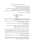 Palestinian Environmental Law The Chairman of PLO Executive Committee, President of the Palestinian Authority, After having consulted resolution no. (7) regarding The Ministry, And based on the requirements of public interest, After approval of the Palestinian Legislative Council in its session on 6 / 7 /1999, The following law was enacted: Title I Definitions and General Provisions Chapter 1 (Definitions) Article (1) In applying the provisions of this law, the following words and terms shall have their specified definitions below, unless otherwise is provided: Environment: the vital surroundings with all forms of life, including air, water, land, the facilities and the reactions among them. Air: the mixture of gases, which compose the air with its natural characteristics and defined concentrations. Soil: the surface crust of the Earth on which there can be activities of agriculture, construction, and digging, that includes all types of land. Drifting: sweeping away any part of the land surface. Water: Includes surface and underground water in all forms, fresh, saline or semi-saline. Environmental Pollution: Any direct or indirect changes in the characteristics of the environment, that may cause harm to any of its components or disrupts its natural balance. Air Pollution: Any change in the characteristics or components of the natural air, which may cause harm to the environment. Water Pollution: Any change in the characteristics or components of water, which may cause harm to the environment. Pollutant Substance and Agents: Any substance in the forms of gas, liquid, solid agents, noise, aerosol, vapor, odor, noise, radiation, heat or vibrations which may result in the pollution or deterioration of the environment. 1 Hazardous Substance: Any substance or compound, which because of its hazardous characteristics poses a danger on the environment as toxic, radioactive, biologically infectious, explosive or flammable substances. Hazardous Waste: waste generated by the various activities and operations or the ash thereof, which preserve the characteristics of hazardous substance which have no uses, such as atomic waste, medical waste, or refuse emanating from manufacturing of pharmacological products, medicines, organic solvents, dyes, painting, pesticides or any other similar substance. Solid Waste: Any non-hazardous waste, or garbage, generated by the deferent activities: household, commercial, agricultural, constructional, industrial waste and the sludge generated by waste treatment plants. Waste Water: Water polluted by solid, liquid, gas energy or microorganisms’ matters generated or resulted from homes, buildings or the variant facilities. Underground Water: Any floods, running or stagnant water in the underground. Facility: Any land, building, structure, or equipment, that constitute the facility. Facility Owner: Any natural or juridical person, who may own or lease a facility or responsible for operating and managing it. Environmental Harm: Any harm generated by the exercise of any activity which may cause harms to public health, public welfare and environment. License: An official document issued by the specialized body authorizing the establishment and operation of the facility, and determining governing specific rules and restrictions thereof. Environmental Impact: Any negative or positive outcome generated by the different activities from the facility or project which affect the different elements of the environment. Pollution Prevention: measures and procedures taken to prevent any pollution. Pollution Control: measures and procedures taken to reduce or eliminate the emission of pollutants. Environmental Protection: includes preserving the elements of the environment, preventing or reducing the pollution and degrading thereof as well as upgrading these elements. Dumping: discharge of variant pollutants generated by all types of facilities or transportation facilities in inland, and territorial or free economic zone. 2 Ship: Any marine unit, floating on or plunged in the water, whether it is civil or military one. Marine Installations: Any stationary or mobile facility built on or under water for commercial, industrial, touring, military or scientific purposes. Public Areas: Areas designated to receive the public at large or any definite group for whatever purpose. Standards: Percentages, quantities or norms as established by specialized agencies to define the environmental pollutants and their harmful impacts. Waste Management: Collection of the different wastes and the transportation thereof to specified zones for recycling, treatment or disposal. Environmental Disaster: Any event generated by natural or human action, which results in severe harm to the environment, the combat of which requires possibilities exceed local capabilities. Compensation: For harms caused by the variant pollutants as a result of an act or more performed by natural, or juridical persons affecting the environmental components, pursuant to an administrative or judicial orders, or in the implementation of provisions stipulated in international conventions. Environmental Nuisance: The harm or material damage caused by the generation of noise, vibration, radiation, or irritations; the release of smells which result from any activity of humans, facilities, transportation facilities or any other agent in a manner that affects properties or the human (exercise of natural)1 life. Environmental monitoring: procedures initiated by specialized agencies, to ensure that all persons and agencies abide to the environmental standards and instructions prescribed to ensure that they are not violated or surpassed. Environmental Control: Activities meant to monitor the quality of the environment. Environmental Deterioration: Any impact on the environment or its components that may cause harms which degrades the environment or depletes its resources and harms living organisms. Ministry: Ministry of Environmental Affairs. Mi