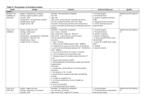 Table A. Description of included studies Study Esteem Barbara et al (2009)(1) & (2011)(2) Design Design: retrospective, pre/post Setting: single academic center Country: Italy Comparator: preoperative unaided Modifications: None Length of F/U: NR Chen et al (2004)(3) Design: single arm trial Setting: multicenter Country: USA Comparator: preoperative unaided & the patient’s “best-fit” HA Modifications: None Length of F/U: 2 months Kraus et al (2011)(4) Design: single arm trial Setting: multicenter (3 centers) Country: USA Patients Number: 18 entered & completed Sex: NR Age: NR Type of HL: sensorineural, moderate to severe Pre-op unaided threshold: mean AC 70dB Inclusion: consecutive patients with moderate to severe sensorineural hearing loss implanted with the Esteem Number: 7 entered & completed Sex: 5 male, 2 female Age: mean 64.4, range 42 – 88 years Type of HL: sensorineural, mild to severe Pre-op unaided threshold: NR Inclusion: 1. age > 18 years 2. mild to severe SNHL between 500 – 4000Hz 3. implanted ear equal or worse than contralateral 4. pure tone AC thresholds between 35 – 85 dB form 500 – 4000Hz 5. use of best fit HA for 4 hrs/day x 3 months 6. normal middle ear & Eustachian tube 7. adequate space for implant, determined by CT scan 8. speech discrimination ≥60% 9. psychologically & emotionally stable with realistic expectations Exclusion: 1. conductive, retrocochlear or central auditory disorders 2. fluctuation in HL > 15 dB 3. physical &/or emotional disorders prohibiting testing 4. unable to complete F/U 5. hx of post-adolescent chronic middle ear infections 6. inner ear disorders 7. hx of otitis externa or eczema Number: 57 entered & completed Sex: 38 male, 19 female Age: mean 52.9, range 18-77.2 years Outcome Measures Quality 1. Functional gain 2. Threshold levels 3. Speech recognition @ 60 or 75dB 4. Glasgow Benefit Inventory 5. Client Oriented Scale of Improvement Oxford level of evidence: IV 1. Functional gain 2. Threshold levels 3. Speech reception 4. Speech recognition - in quiet using CID-W22 word lists @ 50dB - in quiet & in 65dB noise using HINT 5. APHAB 6. Adverse events Oxford level of evidence: IV 1. Functional gain 2. Threshold levels using warble tones & pure tones Oxford level of evidence: IV Comparator: preoperative unaided, patients “walk-in” HA Modifications: None Length of F/U: 12 months Maurer & Savvas Design: single arm trial Setting: single academic center Type of HL: sensorinueral, mild to severe Pre-op unaided threshold: mean AC 63dB Inclusion: 1. age ≥18 years 2. stable bilateral mild to severe SNHL 3. thresholds from 30-100dB from 0.5 – 4kHz 4. ABG ≤10dB @ 4/5 frequencies 5. word recognition ≥40% @ SRT +40dB 6. normal tympanic membrane, middle ear anatomy & Eustachian tube 7. appropriately fitted HA use for ≥4hrs/day x 3 months or 1 month for adjusted aid 8. CT showing adequate space for implant 9. English speaking 10. ability to undergo general anesthetic 11. ability & willingness to comply with study protocol Exclusion: 1. pregnancy 2. chronic staphylococcal skin infection 3. history of post-adolescent chronic middle ear infections, inner ear disorders, vertigo, mastoiditis, or endolymphatic hydrops 4. fluctuating AC or BC thresholds >15dB in either direction in past 2 years @ ≥2 frequencies between 0.5 – 4kHz 5. cholesteatoma or other destructive middle ear disease 6. retrocochlear or central auditory disorders 7. psychological, developmental or physical/emotional disorder preventing F/U 8. disabling tinnitus requiring treatment 9. history of keloid formation 10. hypersensitivity to silicone, polyurethane, stainless steel, titanium or gold 11. pre-existing medical conditions such as diabetes mellitus that is not well controlled or life expectancy ≤2 years 12. small mastoid of narrow facial recess 13. unable to adequately preform audiometric testing 14. history of sudden onset HL of unknown cause Number: 10 entered & completed Sex: NR 3. Speech reception threshold using CD spondee word list 4. Speech recognition @ 50dB 5. Self-assessment QoL questionnaire 6. Adverse events 1. Functional gain 2. Speech recognition using Oxford level of evidence: IV (2010)(5) Country: Germany Comparator: hearing aids Modifications: None Length of F/U: 3-40 months Age: NR Type of HL: sensorineural & mixed Pre-op unaided threshold: NR Inclusion: consecutive patients implanted with the Esteem monosyllabic words @ 65dB (reports range only) 3. APHAB 4. Adverse events Memari et al (2011)(6) Design: single arm trial Setting: single academic center Country: Iran Comparator: preoperative unaided Modifications: None Length of F/U: mean 29.4, range 19-40 months 1. Threshold levels 2. Speech recognition 3. Self-assessment QoL questionnaire 4. Adverse events Oxford level of evidence: IV Murali et al (2009)(7) Design: retrospective case series Setting: single academic center Country: India Comparator: preoperative unaided Modifications: None Length of F/U: NR Number: 10 entered & completed Sex: 3 male, 7 female Age: mean 32.7 years Type of HL: sensorineural, moderate to severe Pre-op unaided threshold: mean AC 65.6dB Inclusion: 1. age ≥18 years 2. moderate to severe nonfluctating SNHL from 0.5 – 4kHz 3. better or equal hearing in non-implanted ear 4. healthy middle ear with normal anatomy 5. speech discrimination score >50% 6. stable psychological & emotional condition Exclusion: diabetes mellitus, connective tissue disorders, chronic otitis media & external otitis Number: 3 entered & completed Sex: 2 male, 1 female Age: mean 28.7, range 22-38 years Type of HL: sensorineural, postlingual Pre-op unaided threshold: mean AC 67dB Inclusion: 1. age ≥ 18 years 2. willing & able to comply with F/U for 1 year, understand test procedures & use of Esteem 3. mild to severe SNHL 4. Pure tone thresholds from 25 – 90dB @ 0.5- 4kHz 5. ABG ≤10dB @ 4/5 frequencies from 0.5-4kHz 6. unaided word recognition ≥60% @ SRT + 40dB 7. current user of proper