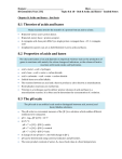 Nomen: _________________________________________ Dies:_______________ IB Chemistry Year 2 HL Topic 8 & 18 - Unit 8 Acids and Bases – Guided Notes Chapter 8: Acids and bases – fast facts 8.1 Theories of acids and bases Many reactions involve the transfer of a proton from an acid to a base. Brønsted–Lowry acid = proton donor. Brønsted–Lowry base = proton acceptor. A conjugate acid–base pair differ by a single proton: conjugate base + H+ ⇌ conjugate acid Amphiprotic species can act as both Brønsted–Lowry acids and bases. 8.2 Properties of acids and bases The characterization of an acid depends on empirical evidence such as the production of gases in reactions with metals, the colour changes of indicators, or the release of heat in reactions with metal oxides and hydroxides. acid + metal salt + hydrogen acid + base salt + water + carbon dioxide acid + carbonate salt + water + carbon dioxide Soluble bases are called alkalis. The reaction between an acid and a base to produce a salt is known as neutralization. Neutralization reactions are exothermic. Titration is a technique used to deliver precise volumes of acid and base in a neutralization reaction. It is often used to determine the concentration of a solution. 8.3 The pH scale The pH scale is an artificial scale used to distinguish between acid, neutral, and basic/alkaline solutions. The pH scale is a convenient measure of the [H+] in a solution, which enables different solutions to be compared. pH = –log10 [H+]; [H+] = 10–pH At 25 C: pH < 7 [H+] > [OH–] = acidic pH = 7 [H+] = [OH–] = neutral pH > 7 [H+] < [OH–] = basic A change of one pH unit = a ten-fold change in [H+]. pH can be determined using universal indicator and pH meters. The ionic product constant of water, Kw, has a fixed value at a fixed temperature. Nomen: _________________________________________ Dies:_______________ IB Chemistry Year 2 HL Topic 8 & 18 - Unit 8 Acids and Bases – Guided Notes Kw = [H+] [OH–] The concentrations of H+ and OH– are inverse in an aqueous solution. 8.4 Strong and weak acids and bases The pH depends on the concentration of the solution. The strength of acids or bases depends on the extent to which they dissociate in aqueous solution. Strong acids and bases dissociate almost completely in solution. Weak acids and bases dissociate only partially in solution. Strong acids are good proton donors and form weak conjugate bases. Strong bases are good proton acceptors and form weak conjugate acids. Strong acids: HCl, H2SO4, HNO3 Strong bases: LiOH, NaOH, KOH, Ba(OH)2 Weak acids: CH3COOH, H2CO3 Weak bases: NH3, C2H5NH2 Comparisons of the strength of acids and bases must use solutions of equal concentration. Strong and weak acids and bases can be distinguished by: i pH measurement/indicator ii conductivity iii rate of reaction with metals, metal oxides, metal hydroxides, metal hydrogencarbonates and metal carbonates. 18.1 Lewis acids and bases The acid–base concept can be extended to reactions that do not involve proton transfer. Lewis acid = lone pair acceptor. Lewis base = lone pair donor. Lewis acid/base reactions lead to coordinate bonds. A nucleophile is an electron-rich species that donates an electron pair – it is a Lewis base. An electrophile is an electron-deficient species that accepts an electron pair – it is a Lewis acid. 18.2 Calculations involving acids and bases Nomen: _________________________________________ Dies:_______________ IB Chemistry Year 2 HL Topic 8 & 18 - Unit 8 Acids and Bases – Guided Notes The equilibrium law can be applied to acid–base reactions. Numerical problems can be simplified by making assumptions about the relative concentrations of the species involved. The use of logarithms is also significant here. pH = –log10 [H+]; [H+] = 10–pH pOH = –log10 [OH–]; [OH–] = 10–pOH Kw = [H+] [OH–] = 1.00 10–14 at 25 °C 10–pH 10–pOH = 1.00 10–14 at 25 °C pH + pOH = 14.00 at 25 °C pKw = –log10 (Kw); Kw = 10-pKw pH + pOH = pKw The value of Kw, and therefore of pH, is temperature dependent. For strong acids and strong bases, pH can be calculated from the concentration because full dissociation is assumed. Weak acids and weak bases, pH cannot be calculated from the concentration because full dissociation is not assumed. For weak acids and weak bases, the acid and base dissociation constants, Ka and Kb, give a measure of the relative strengths of the acid and base. Higher values for Ka and Kb represent stronger acids and bases. Ka = Kb = The relationship between the values of Ka and Kb for a conjugate acid/base pair is inverse. Ka Kb = Kw pKa = –log10 [Ka]; [Ka] = 10-pKa pKb = –log10 [Kb]; [Kb] = 10-pKb pKa + pKb = pKw Lower values for pKa and pKb represent stronger acids and bases. [H3O+ ][A – ] [HA] [BH+ ][OH– ] [HA] 18.3 pH curves pH curves can be investigated experimentally but are mathematically determined by the dissociation constants of the acid and base. An indicator with an appropriate end point can be used to determine the equivalence point of the reaction. A buffer solution is resistant to changes in pH on the addition of a small amount of acid or base. Nomen: _________________________________________ Dies:_______________ IB Chemistry Year 2 HL Topic 8 & 18 - Unit 8 Acids and Bases – Guided Notes Buffer solutions consist of a weak acid and its conjugate base or a weak base and its conjugate acid. Buffers respond to added acid by reacting with the base in the buffer, and to added base by reacting with the acid in the buffer. These reactions cause a shift in the equilibria positions and by removing added H+ or OH– keep the pH approximately constant. The pH of a buffer solution depends on: i the Ka or Kb of the acid/base ii the ratio of the concentration of acid/base to salt. The pH of a buffer does not change with dilution. The pH of a buffer is temperature dependent. The buffer capacity refers to the amount of acid or base that can be added before th