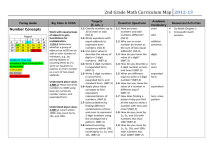 2nd Grade Math Curriculum Map 2012-13 Pacing Guide Number Concepts August 5 12 19 26 6 13 20 27 7 14 21 28 1 8 15 22 29 2 9 16 23 30 Targets (I can…) 1.1- Classify numbers up to 20 as even or odd. Work with equal groups (OA.3) of objects to gain foundations for 1.2- Write equations with multiplication. equal addends to 2.OA.3-Determine represent even whether a group of numbers. (OA.3) objects (up to20) has an 1.3- Use place value to odd or even number of describe the values of members, e.g., by digits in 2-digit pairing objects or numbers. (NBT.3) counting them by 2’s; 1.4- Write 2-digit numbers write an equation to in expanded form. express an even number (NBT.3) as a sum of two equal 1.5- Write 2-digit numbers addends. in word form, expanded form, and Understand place value. standard form. (NBT.3) 2.NBT.3- Read and write 1.6- Apply place value numbers to 1000 using concepts to find base-ten numerals, equivalent number names, and representations of expanded form. numbers. (NBT.3) 1.7- Solve problems by finding different Understand place value. combinations of tens 2.NBT.2- Count within and ones to represent 1000; skip-count by 5s, 2-digit numbers using 10s, and 100s. the strategy find a pattern. (NBT.3) 1.8- Extend counting sequences within 100, counting by 1s, 5s, and 10s. (NBT.2) Big Idea & CCSS 3 10 17 24 31 4 11 18 25 Students’ first day Introduce New Concept/PreAssessment Instruction No School Post-Assessment Essential Questions 1.1 How are even numbers and odd numbers different? (OA.3) 1.2 Why can an even number be shown as the sum of two equal addends? (OA.3) 1.3 How do you know the value of a digit? (NBT.3) 1.4 How do you describe a 2-digit number as tens and ones? (NBT.3) 1.5 What are different ways to write a 2-digit number? (NBT.3) 1.6 How can you show the value of a number in different ways? (NBT.3) 1.7 How does finding a pattern help you find all the ways to show a number with tens and ones? (NBT.3) 1.8 How do you count by 1s, 5s, and 10s with numbers less than 100? (NBT.2) 1.9 How do you count by 1s, 5s, 10s, and 100s with numbers less than 1000? (NBT.2) Academic Resources/Activities Vocabulary even Go Math Chapter 1 Crosswalk Coach odd Lessons: addition sentence digits tens ones expanded form equivalent tens, ones, pattern 2nd Grade Math Curriculum Map 2012-13 1.9- Extend counting sequences within 1,000, counting by 1s, 5s, 10s, and 100s. (NBT.2) 2nd Grade Math Curriculum Map 2012-13 Pacing Guide Big Idea & CCSS Numbers to 1,000 September 2 9 16 23 30 3 10 17 24 4 11 18 25 5 12 19 26 6 13 20 27 7 14 21 28 1 8 15 22 29 Introduce New Concept/PreAssessment Instruction No School Post-Assessment Understand place value. 2.NBT.1a Understand that the three digits of a three-digit number represent amounts of hundreds, tens, and ones; e.g., 706 equals 7 hundreds, 0 tens, and 6 ones. Understand the following as special cases: 100 can be thought of as a bundle of ten tens—called a “hundred.” CC.2.NBT.1b Understand that the three digits of a three-digit number represent amounts of hundreds, tens, and ones; e.g., 706 equals 7 hundreds, 0 tens, and 6 ones. Understand the following as special cases: The numbers 100, 200, 300, 400, 500, 600, 700, 800, 900, refer to one, two, three, four, five, six, seven, eight, or nine hundreds (and 0 tens and 0 ones). Learning Targets (I can …) 2.1 – Understand that each group of 10 tens is equivalent to 1 hundred. (NBT.1a)(NBT.1b) 2.2 – Write 3-digit numbers that are represented by groups of tens. (NBT.1) 2.3 – Use concrete and pictorial models to represent 3-digit numbers. (NBT.1) 2.4 – Apply place value concepts to write 3-digit numbers that are represented by pictorial models. (NBT.1) 2.5 – Use place value to describe the values of digits in numbers to 1,000. (NBT.1) 2.6 – Read and write 3digit numbers in word form. (NBT.3) 2.7 – Write 3-digit numbers in expanded form and in standard form. (NBT.3) 2.8 – Apply place value concepts to find equivalent representations of numbers. (NBT.3) Essential Questions 2.1 – How do you group tens as hundreds? (NBT.1a) (NBT.1b) Academic Vocabulary hundred tens 2.2 – How do you write a 3digit number for a group of tens? (NBT.1) 2.3 – How do you show a 3digit number using blocks? (NBT.1) 2.4 – How do you write the 3-digit number that is shown by a set of blocks? (NBT.1) 2.5 – How do you know the values of the digits in numbers? (NBT.1) 2.6 – How do you write 3digit numbers using words? (NBT.3) 2.7 – What are three ways to write a 3-digit number? (NBT.3) 2.8 – How can you use blocks or quick pictures to show the value of a number in different ways? (NBT.3) thousand digit hundreds tens ones Resources/Activities Go Math Chapter 2 Crosswalk Coach Lessons: 2nd Grade Math Curriculum Map 2012-13 Pacing Guide Big Idea & CCSS Understand Multiplication September 2 9 16 23 30 3 10 17 24 4 11 18 25 1 8 15 22 29 2 9 16 23 30 5 12 19 26 6 13 20 27 7 14 21 28 1 8 15 22 29 5 12 19 26 6 13 20 27 October 7 14 21 28 3 10 17 24 31 4 11 18 25 Introduce New Concept/PreAssessment Instruction No School Post-Assessment Understand place value. 2.NBT.3 Read and write numbers to 1000 using base-ten numerals, number names, and expanded form. Understand place value. 2.NBT.8 Mentally add 10 or 100 to a given number 100900, and mentally subtract 10 or 100 from a given number 100-900. Understand place value. 2.NBT.4 Compare two three-digit numbers based on meanings of the hundreds, tens, and ones digits, using >, =, and < symbols to record the results of comparisons. Learning Targets (I can…) 2.9 – Identify 10 more, 10 less, 100 more, or 100 less than a given number. (NBT.8) 2.10 – Extend number patterns by counting on by tens and hundreds. (NBT.8) 2.11 – Solve problems involving number comparisons by using the strategy make a model. (NBT.4) 2.12 – Compare 30digit numbers using the >, =, and < symbols. (NBT.4) Essential Questions 2.9 – How do you use place value to find 10 more, 10 less, 100 m