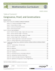 New York State Common Core Mathematics Curriculum GEOMETRY • MODULE 1 Table of Contents1 Congruence, Proof, and Constructions Module Overview .................................................................................................................................................. 3 Topic A: Basic Constructions (G-CO.A.1, G-CO.D.12, G-CO.D.13) ....................................................................... 11 Lessons 1–2: Construct an Equilateral Triangle ...................................................................................... 12 Lesson 3: Copy and Bisect an Angle........................................................................................................ 25 Lesson 4: Construct a Perpendicular Bisector ........................................................................................ 35 Lesson 5: Points of Concurrencies .......................................................................................................... 43 Topic B: Unknown Angles (G-CO.C.9) .................................................................................................................. 48 Lesson 6: Solve for Unknown Angles—Angles and Lines at a Point ....................................................... 49 Lesson 7: Solve for Unknown Angles—Transversals .............................................................................. 61 Lesson 8: Solve for Unknown Angles—Angles in a Triangle ................................................................... 70 Lesson 9: Unknown Angle Proofs—Writing Proofs ................................................................................ 76 Lesson 10: Unknown Angle Proofs—Proofs with Constructions ............................................................ 83 Lesson 11: Unknown Angle Proofs—Proofs of Known Facts.................................................................. 90 Topic C: Transformations/Rigid Motions (G-CO.A.2, G-CO.A.3, G-CO.A.4, G-CO.A.5, G-CO.B.6, G-CO.B.7, G-CO.D.12) ............................................................................................................................................. 98 Lesson 12: Transformations—The Next Level ...................................................................................... 100 Lesson 13: Rotations ............................................................................................................................. 109 Lesson 14: Reflections .......................................................................................................................... 119 Lesson 15: Rotations, Reflections, and Symmetry ............................................................................... 127 Lesson 16: Translations ........................................................................................................................ 134 Lesson 17: Characterize Points on a Perpendicular Bisector................................................................ 142 Lesson 18: Looking More Carefully at Parallel Lines ............................................................................ 149 Lesson 19: Construct and Apply a Sequence of Rigid Motions ............................................................ 159 Lesson 20: Applications of Congruence in Terms of Rigid Motions ..................................................... 164 1Each lesson is ONE day, and ONE day is considered a 45-minute period. Module 1: Congruence, Proof, and Constructions This work is derived from Eureka Math ™ and licensed by Great Minds. ©2015 Great Minds. eureka-math.org This file derived from GEO-M1-TE-1.3.0-07.2015 1 This work is licensed under a Creative Commons Attribution-NonCommercial-ShareAlike 3.0 Unported License. NYS COMMON CORE MATHEMATICS CURRICULUM Module Overview M1 GEOMETRY Lesson 21: Correspondence and Transformations ............................................................................... 170 Mid-Module Assessment and Rubric ................................................................................................................ 175 Topics A through C (assessment 1 day, return 1 day, remediation or further applications 2 days) Topic D: Congruence (G-CO.B.7, G-CO.B.8)....................................................................................................... 189 Lesson 22: Congruence Criteria for Triangles—SAS ............................................................................. 190 Lesson 23: Base Angles of Isosceles Triangles ...................................................................................... 200 Lesson 24: Congruence Criteria for Triangles—ASA and SSS ............................................................... 208 Lesson 25: Congruence Criteria for Triangles—AAS and HL ................................................................. 215 Lessons 26–27: Triangle Congruency Proofs ........................................................................................ 222 Topic E: Proving Properties of Geometric Figures (G-CO.C.9, G-CO.C.10, G-CO.C.11) ..................................... 232 Lesson 28: Properties of Parallelograms .............................................................................................. 233 Lessons 29–30: Special Lines in Triangles ............................................................................................. 243 Topic F: Advanced Constructions (G-CO.D.13) .................................................................................................. 255 Lesson 31: Construct a Square and a Nine-Point Circle........................................................................ 256 Lesson 32: Construct a Nine-Point Circle.............................................................................................. 261 Topic G: Axiomatic Systems (G-CO.A.1, G-CO.A.2, G-CO.A.3, G-CO.A.4, G-CO.A.5, G-CO.B.6, G-CO.B.7, G-CO.B.8, G-CO.C.9, G-CO.C.10, G-CO.C.11, G-CO.C.12, G-CO.