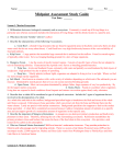Name: ________________________________________________________ Date: ________ Pd: ____ Midpoint Assessment Study Guide Test Date: _______ Lesson 1: Marine Ecosystems 1. Differentiate between a biological community and an ecosystem. Community is made up all living things in a particular area whereas ecosystem includes the interaction of living things with the abiotic factors in a specific area. 2. What does the term “benthic” refer to? seafloor 3. Describe the characteristics of the following 8 ecosystems. a. Coral Reef - colonial living structures that are found in equatorial areas in the photic zone (also there are deep water corals but do not worry about these). Coral Reefs have very high biodiversity because of the vast availability of food and nutrients. e. Kelp Forest - Large protists that resembles large seaweed that is anchored on the seafloor. Found in coastal regions of typically colder water. Serve as foraging/hunting grounds for a slew of large organisms. b. Mangrove Forest - Line the coasts of mostly tropical regions. Consists of specific types of trees that are adapted to exist in fluctuating salinities. Characterized by exposed roots. Serves as breeding grounds/nurseries. f. Polar Sea – Arctic and Southern Ocean, extremely cold water and partially covered/insulated by thick layers of ice/glaciers. High productivity due to plenty of upwelling. c. Deep Sea - Mostly aphotic (without light), organisms are adapted to living in low to no light. Where we find our most strange marine organisms. g. Salt Marsh – Also known as estuaries with a wide variety of salinities depending on which end of the saltmarsh you are measure. Dominated by marsh grasses that serve as our oceans nurseries/breeding grounds. d. Open Ocean - Most vast ecosystem dominated by pelagic fishes, large expanses of very low productivity. By far the largest marine ecosystem. h. Rocky Shore – Found on coastlines where organisms living here are exposed to harsh conditions from frequent and intense wave action against hard, rocky substrates. 4. Describe how a whale fall is considered a type of ecological succession. Include the 3 types of organisms that are involved in the decomposition of a whale. As a whale dies and sinks to the seafloor, background specialists begin to breakdown the flesh and tissue of the whale until bone is exposed. Following are bone specialists which can extract oils from the bone and liberate them into the water column. Lastly are species with unclear connections. Background specialists also reappear to feed on the osedax (bone specialist). A whale fall is considered succession because it adds a tremendous amount of nutrients to a specific area and can support growth of a tremendous amount of organisms in that specific area. 5. Describe the important of Mangrove Restoration. As mangroves are destroyed, primary production and biodiversity plummets in these areas. Therefore, affecting the rest of the surrounding ecosystems. Restoration reestablishes the primary producers (trees and bushes) that create the basis of the food chain in this ecosystem. Also provides a sink (removal) for carbon in the atmosphere. 6. What are National Marine Sanctuaries? NMS are America’s underwater treasures. They provide protection to fisheries and safe passage way for migrating animals. There is a system of 14 Marine Protected Areas (MPAs) that encompass nearly 25,000 square km. Marine and Great Lake waters from Washington State to Florida Keys and from Lake Huron to American Samoa Lesson 2/3: Water Chemistry 1. What are the 4 spheres of the world and what do they contain? a. Hydrosphere - water b. Lithosphere - Land c. Atmosphere - air d. Biosphere – living things 2. Distinguish between: renewable source - ocean replenishes itself naturally over relatively short periods of time nonrenewable resource - exhausted faster than they are naturally replaced Ex: natural gas and minerals 3. Complete the following chart: Melting Point Freezing Point Boiling Point Density Freshwater 0 deg C 0 deg C 100 deg C 1.0g/mL Saltwater -2 deg C -2 deg C 100.8 deg C 1.3 g/mL 4. Distinguish between: a. neutron – neutrally charged subatomic particle b. proton – positively charged subatomic particle c. electron – negatively charged subatomic particle 5. What is an isotope? Atom with same number of protons, different number of neutrons. Therefore changing its mass. Give an example from your notes: O-18 (heavy oxygen), 0-16 (light oxygen) 6. What does the atomic number tell you? Number of protons Atomic mass? Number of protons + neutrons 7. a. Define covalent bond and draw a molecule that possesses this type of bond. Sharing of electrons. Ex: Water molecule. b. Define ionic bond and draw a molecule that possesses this type of bond. Transfer of electrons from one ion to another. Ex: NaCl (salt) 8. Draw an image showing water’s unique properties. Include polarity, hydrogen bonding, polar covalent bond, electronegativity, cohesion, and adhesion. Polar covalent bond Oxygen is more electronegative 9. Define the following words regarding our phase change lab: a. Melting Phase change from solid to liquid e. Condensation – Phase change from gas to liquid b. Freezing - liquid to solid f. Dry ice – solid carbon dioxide c. Evaporation/Vaporization – liquid to gas g. Heat Capacity – how much heat needs to be added to a substance to change its temperature. Water has a VERY high heat capacity which attributes to the wide variety of life on Earth. Because water can resist rapid changes in temperatures, crucial for survival of many organisms. d. Sublimation – solid to gas phase (like dry ice) 11. Label the following phase change diagram, fill in the missing terms: (Hint: A, C, and E are the phase. F and G are phase changes) G F 12. What is neutral buoyancy? Give an example of an organism that uses it. The ability to maintain position in the water column. Jellyfish use this. 13. Define the following words regarding Lesson 3: a