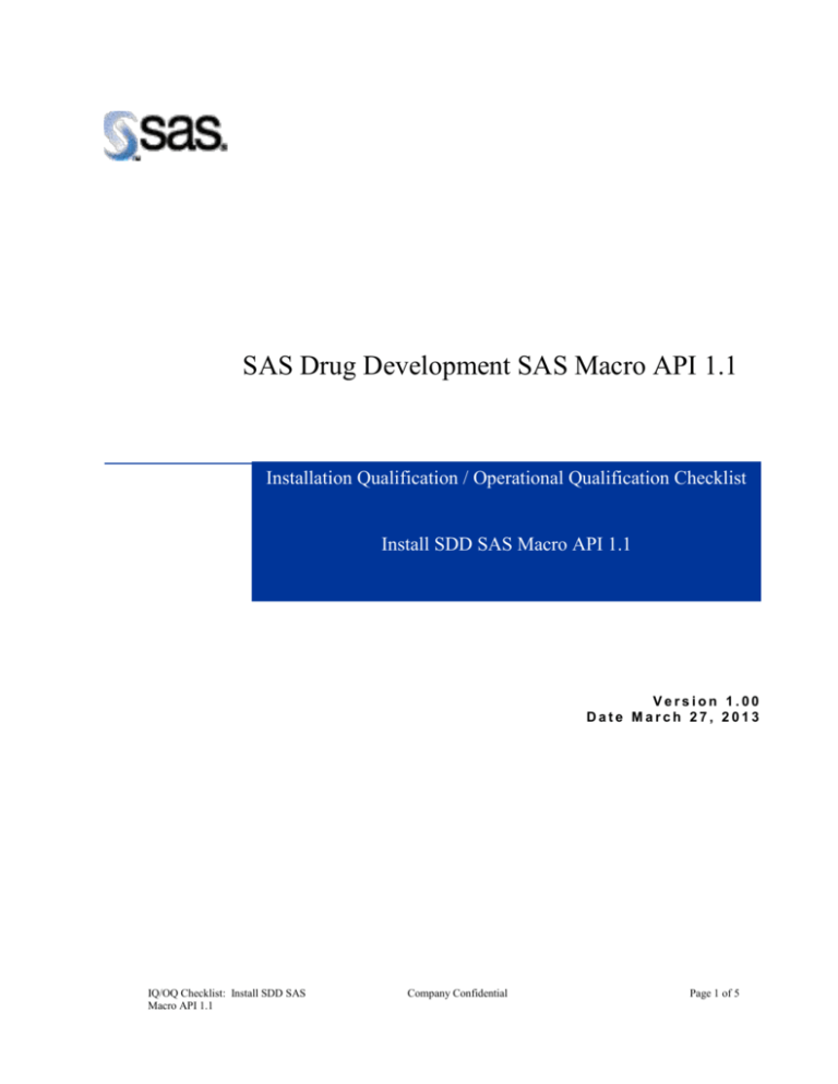 SAS Drug Development SAS Macro API 1.1 Installation Qualification / Operational Qualification Checklist Install SDD SAS Macro API 1.1 Version 1.00 Date March 27, 2013 IQ/OQ Checklist: Install SDD SAS Macro API 1.1 Company Confidential Page 1 of 5 IQ/OQ Checklist: Install SDD SAS Macro API 1.1 Company Confidential Page 2 of 5 Checklist A: “Install SDD SAS Macros” Note: This checklist assumes you have completed an installation of SDD 4.2.1 and SDD API 1.5. Checklist A: “Install SDD SAS Macros” # Activity A1. Login to an admin PC. A2. Using the putty tool, create an ssh connection from the admin PC to the SAS server and login as sasadmin. A3. Enter the password for sasadmin. A4. Use the script command to capture commands that are typed in the Unix window. The syntax is script /var/staging_logs/<servername>_sddmacro1.1_<da te>.txt A5. From the admin PC, download the SDD API 1.5 Client distribution from the SAS Hot Fix site. After the distribution has been downloaded, use the WinSCP2 tool to copy the file to /sfw/installers on the SAS server. Transfer it as a binary file using the sasadmin userid. Corresponding Document: None Expected Results Actual Results Windows display appears. You’re prompted for the password. You’re logged into SAS server. System should indicate script has started. The file is transferred to the SAS server. sdd-java-api-client-1.5.zip A6. From the admin PC, download the SDD Macro 1.1 distribution from the SAS Hot Fix site. After the distribution has been downloaded, use the WinSCP2 tool to copy the file to /sfw/installers on the SAS server. Transfer it as a binary file using the sasadmin userid. The file is transferred to the SAS server. sdd-sas-macro-1.1.zip A7. Stop the Object Spawner by typing /sfw/sas_servers/Lev1/ObjectSpawner2/ObjectSp awner.sh stop IQ/OQ Checklist: Install SDD SAS Macro API 1.1 The Object Spawner is stopped. Company Confidential Page 3 of 5 Checklist A: “Install SDD SAS Macros” # Activity A8. Type ps –ef | grep sasadmin Corresponding Document: None Expected Results Actual Results The following process should be running: /bin/sh -p /sfw/sas_servers/Lev1/ObjectSpawner2/ObjectSpawner.sh start2_tag A9. A10. A11. A12. A13. A14. Type cd /sfw/sas9.3/SASFoundation/9.3 Type mkdir sddapi Type cd sddapi Type unzip –q /sfw/installers/sdd-java-api-client1.5.zip Type unzip –q /sfw/installers/sdd-sas-macro1.1.zip Type ls –al Navigate to that directory. Directory is created. Navigate to that directory. Contents of zip file are extracted. Contents of zip file are extracted. You see the following directories created: sdd-java-api-client-1.5 sdd-sas-macro-1.1 A15. A16. Type cd /sfw/sas_servers/Lev1/SDDApp/WorkspaceServer Note: For single SAS server installs, this application name will be SASApp. Type vi sasv9_usermods.cfg IQ/OQ Checklist: Install SDD SAS Macro API 1.1 Navigate to that directory. File is opened for edit. Company Confidential Page 4 of 5 Checklist A: “Install SDD SAS Macros” # Activity A17. After the comment block, add the following lines: Corresponding Document: None Expected Results Actual Results File is modified. -insert sasautos "/sfw/sas9.3/SASFoundation/9.3/sddapi/sdd-sasmacro-1.1/sasmacros" -JREOPTIONS ( Dsas.app.class.dirs=/sfw/sas9.3/SASFoundation/9. 3/sddapi/sdd-java-api-client1.5/lib:/sfw/sas9.3/SASFoundation/9.3/sddapi/sddsas-macro-1.1/lib ) A18. A19. A20. A21. Note: Copy and paste this text from the sasv9_usermods.txt file in our staging area. Hit Esc and type :x to save the file. Type more sasv9_usermods.cfg Start the Object Spawner by typing /sfw/sas_servers/Lev1/ObjectSpawner2/ObjectSp awner.sh start Type ps –ef | grep sasadmin File is saved with changes made. Verify that changes have been saved. Object Spawner is started and system displays: Spawner is started (pid nnnnn)... The following process should be running: /bin/sh -p /sfw/sas_servers/Lev1/ObjectSpawner2/ObjectSpawner.sh start2_tag A22. A23. Hit Ctrl-D to stop the script command. Type exit A24. Repeat steps A1 – A23 to deploy the SDD SAS Macros to any additional SAS processing servers. System indicates script stopped running. The sasadmin userid is logged off the SAS server. Steps repeated as necessary. Signature below indicates completion of Checklist A, items A1 – A24, above. Name (print or type): ___________________________ IQ/OQ Checklist: Install SDD SAS Macro API 1.1 Sign-off : _____________________________ Company Confidential Date:______________________ Page 5 of 5