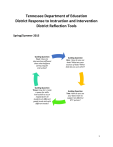 Tennessee Department of Education District Response to Instruction and Intervention District Reflection Tools Spring/Summer 2015 Guiding Question Four: How are interventions different than what happens during regular instruction? Guiding Question One: How do you use data? What are your sources of data? What data do you use when? Guiding Question Three: How do I create a space for skills instruction to occur regularly for all students at different grade levels and with different needs? Guiding Question Two: How do you use your data team to support an effective RTI2 system? 1 Response to Instruction and Intervention is an ongoing process that requires continual reflection. It is essential that we share our successes and continue to overcome our problems of practice. The following Reflection Toolkit is a tool designed to support yearly reflection. This tool helps districts and schools identify areas of success and challenges that need to be areas of success. The Reason for RTI2 The role of the public education system is to prepare ALL students for success after high school. Response to Instruction and Intervention is designed to empower educators to give every student the opportunity to meet high expectations and the support to reach them. This three-tiered system helps educators differentiate instruction as students need extra help. Tennessee schools are moving to this framework over the next several years. Tennessee State Standards set high expectations for student achievement. The RTI² framework is a multi-tiered delivery system aligned with the department’s beliefs and allows for an integrated, seamless problem-solving model that addresses individual student needs. The RTI² framework relies on the premise of high-quality instruction and interventions tailored to student need where core instructional and intervention decisions are guided by student outcome data. The RTI² framework has district and school teams making local decisions to create an RTI2 framework. This framework allows school teams to identify the supports every child needs to achieve academically. The Road to RTI2 follows three principles 1. Leadership at the state, district, and building level is essential for ensuring the success of ALL students throughout the RTI2 Framework. 2. A culture of collaboration that is focused on student achievement, for both struggling and advancing students, should include educators, families and communities. 3. RTI2 is a process focused on prevention and early intervention that uses assessment data for instruction, intervention and transitions between tiers. This guide is designed to help you take a broad overarching review of your RTI2 experiences; then, select specific tools to analyze your next steps in your RTI2 process work for the following year. 2 District Table of Contents Overall Year One Reflection This section is an overall reflection of your RTI2 processes for the year and is geared toward helping you find areas to focus on and dig deeper into the appropriate planning options below. 1. Narrative Tool Option p. 4 2. Likert Scale Option p. 5 Data Tool Focus Guiding Question One: How do you use data? What are your sources of data? What data do you use when? 1. Universal Screening Tool p. 7 2. Progress Monitoring Tool p. 8 RTI2 Data Team Support Guiding Question Two: How do you use your data team support an effective RTI2 system? 1. 2. 3. 4. 5. Scheduling District RTI2 Team Analysis p. 10 School RTI2 Team Analysis p. 11 School Fidelity Data Analysis (elementary) p. 12 Secondary School Fidelity Data Analysis (secondary) p. 13 Communications and Developing Buy In Analysis p. 14 Guiding Question Three: How do I create a space for skills instruction to occur regularly for all students at different grade levels and with different needs? 1. Schedule Analysis Tool p. 15 2. Staff Analysis Tool p. 16 Interventions Guiding Question Four: How are interventions different than what happens during regular instruction? 1. Elementary Intervention Analysis Tool p. 17 2. Middle/High Intervention Analysis Tool p. 19 Implementation Readiness Tool This document is used for middle schools and high schools in the process of implementing. This information will need to be submitted through EdTools. p. 21 3 The RTI2 Reflection Overview Survey is designed to help you reflect on where you are with implementation, where your data is improving, where your challenges are, and to help decide which additional tools will facilitate deeper analysis. Initial Reflection 1. What is our biggest success in utilizing the RTI2 framework to provide intervention for our students? 2. What skill areas did we see the largest success in this year? 3. What problems of practice did we overcome? 4. What gaps do we continue to see? 5. What is one area of the RTI2 framework that we continue to struggle to address? 4 Overview Survey When reflecting on the components of your buildings’ RTI2 framework. Answer the following statements. 5 Strongly Agree 4 Agree 3 Neutral 2 Disagree 1 Strongly Disagree 5 4 3 2 1 Data Tools and Data Support Systems School Culture My staff believes that the RTI2 framework will help all students become successful and access the general education curriculum. My staff communicates their belief in RTI2 to other stakeholder groups? (ie. parents, students, other teachers) I facilitate RTI2 communication with stakeholder groups to ensure the messaging. If you answered disagree or strongly disagree to any of the above questions, you may want to dig deeper with the Communications and Developing Buy In Analysis (p. 14). Data Team My RTI2 team meets regularly to reflect on student data. My RTI2 team meets regularly to reflect on the overall RTI2 processes in our school. My RTI2 team meets regularly to analyze RTI2 supports needed for the building framework. If you answered disagree or strongly disagree to any of the above questions, you may want to dig deeper with the data team tools. District RTI2 Team Analysis 