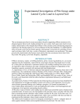 Experimental Investigation of Pile Group under Lateral Cyclic Load in Layered Soil Sudip Basack Dept. of Applied Mechanics, Bengal Engineering and Science University Howrah-711103 India ABSTRACT The environment prevalent in ocean necessitates the piles supporting offshore structures to be designed against lateral cyclic loading initiated by wave action. Such quasi-static load reversal induces deterioration in the strength and stiffness of the soil-pile system introducing progressive reduction in the bearing capacity as well as settlement of the pile foundation. To understand the effect of lateral cyclic load on lateral capacity of pile group in a layered soil consisting of loose sand overlying a bed of soft clay, a series of laboratory experiments were performed. This paper presents the experimental observations made and the relevant conclusions drawn there from. Keywords: Pile group, cyclic load, frequency, amplitude. INTRODUCTION Offshore structures, namely, oil drilling platforms, jetties, tension leg platforms etc. are mostly supported on pile foundations. Apart from the usual super structure load (dead load, live load, etc.), these piles are subjected to continuous lateral cyclic loading resulting from ocean waves. As reported by other researchers, this type of loading induces progressive degradation of the foundation capacity associated with increased pile head displacement. A comprehensive review of literature indicates that limited research works have been done in the related areas. The contributions made by Matlock (1970), Poulos (1981and 1982), Purkayastha and Dey (1990), Narasimha Rao and Prasad (1992), Purkayastha et al (1997), Basak (1999), Dyson (1999), Basak and Purkayastha (2003) and Randolph (2003) are worthy of note. Some of the works were theoretical while the others had been experimental (laboratory and field based investigations). As pointed out by Poulos (1981b), basically the following three reasons have been identified for such degradation of strength and stiffness of pile-soil system: (i) Development of excess pore water pressure generated during cyclic loading in progress. (ii) General accumulation of irrecoverable plastic deformation of soil surrounding the pile surface. (iii) Rearrangement and realignment of soil particles surrounding the pile surface. All the above types of lateral cyclic loading may be under load-controlled mode or displacementcontrolled mode. In former case, the load applied at the pile head varies cyclically with time such that its maximum and the minimum values remain constant for all cycles. In the later case, it is the pile head deflection and not the applied load, which varies cyclically with time such that its maximum and the minimum values remain constant for all cycles. The offshore pile foundations need to be designed considering two criteria : adequate factor of safety against ultimate failure and acceptable deflection at pile head. The aim of this investigation reported herein is to carry out experimental investigation so as to understand the effect of lateral cyclic loading on the performance of pile foundation in a layered soil consisting of loose sand overlying a bed of soft clay. EXPERIMENTAL SET UP Since no standard apparatus for imparting lateral cyclic load on piles is available, a new multipurpose set up was designed and fabricated. A schematic diagram and a photographic view of this apparatus are shown in Figs.1 and 2 respectively. Some of its important components are described below: Test Tank A stainless steel tank was designed and manufactured for preparing the soil bed. The tank consisted of three flanged segments each having 200 mm height and 400 mm internal diameter and 5 mm wall thickness. The. flanges of the segments were provided with holes for bolting purpose. Rubber gaskets were provided between the flanges of the adjacent segments to keep the side of the tank water tight as well as soil tight. Provision had been kept at the bottom of the tank to allow drainage of water from the soil bed, whenever required. The Loading Device The loading device consisted of two separate units, one is for static loading and the other for cyclic loading, both being parallely connected with a central motor and gear system, such that one unit could be operated at a time. By chain and sprocket arrangement, each unit could be engaged or detached separately with the motor gear system. Figure1: Photographic view of the Multipurpose Cyclic Loading Device. Figure 2: Basic operating principle of the cyclic loading device Central Motor and Gear System The central motor and gear system consisted of a 2 H.P., 3 Phase reversible, induction type of motor rotates at 920 r.p.m. By means of a 1 : 20 reduction gear box, this speed could be reduced. A PIV Drive (Positive Infinitely Variable Drive), a power transmission system using a slatted chain having input r.p.m. 600 and output r.p.m. minimum 182 and maximum 1272 was used to obtain different speed outputs. To transmit the power from the motor to the reduction gear box a two-step belt and pulley arrangement was used. Static Loading Device For static loading test, the apparatus was designed in such a manner that the strain controlled loading could be applied at the pile head, where the pile was pushed forward at a constant rate of horizontal displacement. By measuring the applied lateral load and the corresponding horizontal deflection of pile cap, the lateral load-deflection curves were plotted. To serve this purpose, three shafts were connected in series between the output point of the central motor and gear system by means of bevel gears. The end shaft was threaded throughout its length to provide the forward and back ward motion of the holder. At one end, the end shaft is attached with a bevel gear and the other end with a holder wich was welded on the top of a sliding unit. This sliding uniot was connected to the pile head connector through a load cell. Cyclic Loading Device The experimenta