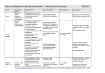 School of Materials Area Risk Assessment : Mechanical Workshops Hazard General Who might be harmed Occupiers, visitors, contractors, students, out-ofhours cleaners Occupiers, visitors, contractors, outof-hours cleaners Fire lab / workshop Electrical – shock & fire All users, visitors, contractors, cleaners Existing controls Relevant standards All hazardous tasks to be risk assessed and documented, and control measure properly implemented Management of Health & Safety at Work Regulations UOM policies and practices for fire detection system evacuation procedures fire action notices Centre building representative no smoking policy provision & maintenance of fire extinguishers collection of flammable waste materials electrical maintenance fire risk assessment for building minimal storage of solvents / degreasers exit routes kept clear of obstructions maintenance of flammable cylinders and equipment correct storage of chemicals and flammable materials correct labelling of chemicals and reagents Portable appliances checked annually (records to be kept) Fixed electrical equipment annually checked visually by Centre. Installation electrically tested for Risk assessment Supervisor to inspect exit routes regularly and report any problems to SA SA to implement checks Low x Low / Medium = Low / Medium regular leak tests on cylinders, connections and pipework for flammable or toxic gases. Records to be kept UOM and departmental policies and procedures re safe laboratory practices BOC / BCGA Codes correct warning notices Electricity at Work Regulations 1989 UOM policy on portable appliances and non-portable appliances Future actions Supervisors to ensure compliance. Regular safety inspections by SA’s Management of Health & Safety at Work Regulations for emergency procedures, as amended by Fire Precautions (Workplace) Regs Fire risk assessments carried out by Safety Office and Estates SRE202 Low x medium = medium Check PAT up-to-date. Check all new appliances have been included on database Supervisors to institute visual checks by users to identify Ivan.easdon@manchester.ac.uk (School Senior Safety Advisor) room D2b, Materials Science Building, Ext. 63596 School of Materials Area Risk Assessment : Mechanical Workshops Hazard Who might be harmed Existing controls Relevant standards Risk assessment safety by Estates on 8 year basis Manual handling (lab/workshop) Display screen work (visual display units) All staff and students Movement of gas cylinders, work pieces, deliveries, equipment, etc All who use DSE regularly and are classed as “users”. Trolleys used to transport materials, including cylinders, from delivery point to lab. Future actions damaged cables, overloaded sockets (and identify any training need) Manual Handling Operations Regulations 1992 Manual handling minimised by using mechanical aids See Manual handling assessments Trained Manual handlers available for advice and help Detailed assessments for nonroutine handling UOM guidance on DSE work (formal policy in preparation) Use of HSE self-assessment form for each individual, with follow up by SSA. Provision of information on risks by distribution of advisory leaflet “Working with VDUs”. Provision of information and training on use of adjustments to workstation and need for regular breaks. Advice from SA or Occ Health on ergonomic issues. Referral of anyone complaining of symptoms associated with use of DSE to SSA or Occ Health UOM Policy on eye tests SRE202 Medium x low = medium Lifting Operations and Lifting Equipment Regulations 1998 Supervisor to identify all lifting tasks, and check if further use can be made of mechanical aids. Where manual lifting still required, Supervisor to identify training needs (with advice from SA or Occ Health staff) and arrange for formal assessment. Supervisor to maintain records of all written risk assessments for manual handling tasks Health & Safety (Display Screen Equipment) Regulations 1992 Low x low = low SA and Supervisor to review records of self- assessment, ensure records up-to-date and reflect any changes. SA to follow up any problem areas with individuals, and consult SSA or Occ Health if solution is not obvious. Records to be kept. Ivan.easdon@manchester.ac.uk (School Senior Safety Advisor) room D2b, Materials Science Building, Ext. 63596 School of Materials Area Risk Assessment : Mechanical Workshops Hazard Slips, trips and falls Hygiene & welfare Who might be harmed SRE202 Existing controls Relevant standards Risk assessment Future actions All staff, students and visitors UOM policy on reporting defects contact SA extension 63596. Supervisor to tour area regularly to check for defects to floor coverings, tripping hazards, obstructions, lighting defects, etc. Staff instructed to keep filing cabinet drawers closed when not in use. All staff instructed to remove obstructions, waste materials, trailing cables & clear up spillages promptly, and encouraged to report defects Workplace (Health, Safety & Welfare) Regs 1992 Low x medium = medium Supervisor to carry out (or delegate) regular inspections of office areas and keep a record. All staff and visitors Toilets nearby provided with hot and cold water, soap and towels. Drinking water provided at dispenser. Shortages and defects reported to Unit TSM. Workplace (Health, Safety and Welfare) Regs 1992 Low x low = low Workplace (Health, Safety and Welfare) Regs 1992 Low x Low = Low Supervisors to regularly check work areas. Report any problems to SA Workplace (Health, Safety and Welfare) Regs 1992, Low x low = low Supervisor would take up complaints about provision of these Housekeeping & Storage All staff, students and visitors Environment All staff, students Always keep walkways free from obstruction Always clean work area after use Always keep the area safe and tidy Safely dispose of all unwanted material UOM Estates provide heating, lighting and ventilation in accordance with Workplace Regulations Ivan.easdon@manchester.ac.uk (School S