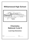Williamwood High School Chemistry National 4 and 5 Learning Outcomes Name ________________________ Class________ Unit 1 Chemical Changes and Structure Key area: Atomic theory Elements 1. Everything in the world is made from over 100 elements. (Nat 4) 2. An element is a substance containing only 1 type of atom. (Nat 4) 3. Chemists have classified elements by arranging them in the Periodic Table. (Nat 4) 4. Each element has a name and a symbol. (Nat 4) 5. Elements are classified in different ways: metal / non-metal, naturally occurring / manmade, solid / liquid / gases. (Nat 4) 6. A group is a column of elements in the Periodic Table. (Nat 4) 7. A period is a row of elements in the Periodic Table. (Nat 4) 8. The groups include Group 1 the Alkali metals (Nat 4) Group 7 the Halogens (Nat 4) Group 8 (0) the Noble gases (Nat 4) 9. The alkali metals are a family of very reactive metals and are stored under oil. (Nat 4) 10. The halogens are a family of very reactive non-metals. (Nat 4) 11. The noble gases are a family of very unreactive non-metals. (Nat 4) 12. The transition metals are found between Groups 2 and 3 in the Periodic table. (Nat 4) 13. Elements in any one group of the Periodic Table show similar chemical properties. (Nat 4) Compounds and mixtures 14. Mixtures occur when two or more substances come together without reacting. (Nat 4) 15. Air is a mixture of gases. (Nat 4) 16. The gases in air include 79% nitrogen, 20% oxygen, carbon dioxide and Noble gases. There is no hydrogen in air. (Nat 4) 17. The test for oxygen is that it relights a glowing splint. (Nat 4) 18. There is not enough oxygen in the air for the test to be positive. (Nat 4) 19. A solution is a mixture formed when a solute dissolves in a solvent. (Nat 4) 20. A compound is a substance that is made up of two or more elements that are chemically joined. (Nat 4) 1 Solubility 21. A substance which dissolves in a liquid is soluble; a substance which does not dissolve is insoluble. (Nat 4) 22. A saturated solution is one in which no more substance can be dissolved at that temperature. (Nat 4) 23. A dilute solution has a lower concentration of dissolved substance than a concentrated solution. (Nat 4) 24. A solution is diluted by adding more solvent. (Nat 4) 25. State symbols (s) (l) (g) and (aq) can be used to show the state of a substance. (Nat 4) Chemical reactions 26. All chemical reactions involve the formation of one or more new substances. (Nat 4) 27. Compounds are formed when elements react together. (Nat 4) 28. Chemical reactions can be identified by changes in appearance of substance, including colour change, gas evolved, a solid formed. (Nat 4) 29. Chemical reactions can be identified by energy changes. (Nat 4) 30. Exothermic reactions release energy to the surroundings and the products have less chemical energy than the reactants. (Nat 4) 31. Endothermic reactions take in energy from the surroundings and the products have more chemical energy than the reactants. (Nat 4) Naming compounds 32. Most compounds with a name ending in ‘-ide’ contain the two elements indicated. (Nat 4) 33. The ending ‘ite’ or ‘-ate’ indicates the additional element oxygen. (Nat 4) Sub-atomic particles 34. Every element is made up of very small particles called atoms. (Nat 4) 35. The atom has a nucleus, which contains protons and neutrons, with electrons moving around outside the nucleus in specific energy levels. (Nat 4) 36. Atoms of different elements have a different number of protons, called the atomic number. (Nat 4) 37. The elements of the Periodic Table are arranged in terms of their atomic number and chemical properties. (Nat 4) 38. Elements with the same number of outer electrons are in the same group and have similar chemical properties. (Nat 4) 2 Mass & charge of particles 39. Protons have a charge of one-positive, neutrons are neutral and electrons have a charge of one-negative. (Nat 4) 40. An atom is neutral because the numbers of protons and electrons are equal. (Nat 4) 41. Protons and neutrons have an approximate mass of one atomic mass unit and electrons, in comparison, have virtually no mass. (Nat 4) 42. An atom has a mass number which equals the number of protons plus neutrons. (Nat 4) 43. The number of protons, neutrons and electrons can be found from the atomic number and mass number, and vice versa. (Nat 4) 44. Candidates should be able to draw and label a diagram of an atom showing the location, charge and mass of the sub-atomic particles. (Nat 5) Nuclide notation 45. Atoms can be represented by nuclide notation, e.g. 35 17 Cl. (Nat 5) Isotopes 46. Isotopes are atoms with the same atomic number but different mass numbers. (Nat 5) 47. Most elements exist as a mixture of Isotopes. (Nat 5) RAM 48. The relative atomic mass of an element is an average of all the isotopes of that element. (Nat 5) 49. The relative atomic mass of an element is rarely a whole number. (Nat 5) 50. Candidates should be able to work out which is the most abundant isotope given the mass numbers of the isotopes and the relative atomic mass of the element. (Nat 5) Key area: Rates of reaction Factors affecting rate 51. The rates of reactions are affected by changes in concentration, particle size and temperature. (Nat 4) 52. The collision theory can be used to explain the effects of concentration and surface area on reaction rates. (Nat 5) 53. Catalysts are substances which speed up some reactions and are not used up by the reactions. They also allow the reaction to take place at a lower temperature. (Nat 4) 3 54. Heterogeneous catalysts are catalysts which are in a different state from the reactants. (Nat 5) 55. Homogeneous catalysts are catalysts which are in the same state as the reactants. (Nat 5) 56. Catalysts are used in many industrial processes. (Nat 4) 57. There are many everyday examples of uses of catalysts. (Nat 4) 58. Enzymes are biological catalysts which catalyse the chemical reactions which take place in the living cells of pla