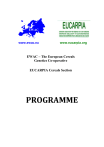EWAC www.ewac.eu www.eucarpia.org EWAC – The European Cereals Genetics Co-operative EUCARPIA Cereals Section Novi Sad, Serbia, May 2011 PROGRAMME November 7 Arrival Day 14.00 – 19.30 19.30 – 22.00 Registration Desk Open Welcome Buffet Supper November 8 SESSION 1 9.00 - 9.30 9.30 - 9.50 9.50 - 10.10 10.10 - 10.30 10.30 - 11.00 11.00 - 11.20 11.20 - 11.40 11.40 – 12.00 12.00 – 12.20 12.20 – 12.40 12.40 - 14.00 SESSION 2 14.00 - 14.20 14.20 - 14.40 14.40 - 15.00 15.00 – 15.20 15.30 - 16.00 16.00 - 17.00 Chair Person: John Snape B. Kobiljski, A. Börner A. Börner, E.K. Khlestkina, T.A. Pshenichnikova, K. Neumann, B. Kobiljski, U. Lohwasser, V. Korzun, M.S. Röder T.A. Pshenichnikova, E.K. Khlestkina, L.V. Shchukina, A.V. Simonov, A.K. Chistyakova, E.V. Morozova, S. Landjeva, T. Karceva, A. Börner E.K. Khlestkina, O.Yu. Tereshchenko, V.S. Arbuzova, A. Börner, L.A. Pershina, E.A. Salina M. Nowak, M. Zapalska, J. Leśniowska-Nowak, K. Kowalczyk M. Molnár-Láng, E. Szakács, K. Kruppa, A. Cseh, G. Linc, M. Rakszegi, A. Farkas, B. Hoffmann, É. Darkó, S. Dulai S. Landjeva, K. Kocheva, V. Nenova, A. Sepsi, I. Molnár, A. Schneider, T. Karceva, G. Ganeva, G. Georgiev, M. Molnár-Láng I. Molnár, H. Šimková, M. Kubaláková, M. Leverington-Waite, R. Goram, A. Cseh, A. Farkas, M. Molnár-Láng, S. Griffiths, J. Doležel L. Kuzmanović, A. Gennaro, S. Benedettelli, G. Lattanzi, S.A. Quarrie, C. Ceoloni Chair Person: Tatyana Pshenichnikova B. Kobiljski, A. Kondić-Špika, L. Brbaklić, D. Trkulja, S. Treskić K. Neumann, B. Kobiljski, S. Denčić, R.K. Varshney, A. Börner F. Longin, J. Reif, T. Würschum, T. Miedaner, H.P. Maurer, E. Ebmeyer, V. Korzun, R. Bothe, Chr. Pietsch K. Kowalczyk, S. Okoń, M. Nowak, J. Leśniowska-Nowak Genetic stocks and alien introgressions Opening/Introduction Cereal genetic stocks – examples of successful co-operation Exploitation of Saratovskaya 29 / Janetzkis Probat 4D*7A substitution and derivate lines for comprehensive phenotyping and molecular mapping of quantitative traits loci (QTL) A new range of wheat precise genetic stocks application: insights into gene function COFFEE BREAK Analysis of GA 2-oxidase gene transcription in isogenic lines of common wheat cv. Bezostaya with different Rht genes Evaluation of morphological and agronomic traits of wheat/barley introgression lines developed in Martonvásár Aegilops geniculata chromosome introgressions into bread wheat and their effects on plant physiological responses to abiotic stress Flow-cytometric dissection the U and M genomes facilitate the physical mapping of Aegilops species Effects on yield-related traits from introgression of Thinopyrum ponticum chromosomal segments onto the 7AL arm of durum wheat LUNCH Molecular gene mapping and breeding in wheat QTL mapping and mining candidate genes affecting important agronomical traits in NS wheat breeding program Genome wide association mapping of agronomic traits in bread wheat Association mapping in soft winter wheat for FHB, quality traits, heading time and yield Using of DNA markers for selection of common wheat in Polish breeding programmes COFFEE BREAK Poster session November 9 Cont. SESSION 2 9.00 - 9.20 Chair Person: Borislav Kobiljski 9.20 – 9.40 S. Okoń , J. Leśniowska-Nowak, M. Nowak, M. Zapalska, K. Kowalczyk 9.40 - 10.00 A.B. Shcherban, T.T. Efremova, E.K.Khlestkina, E.A. Salina 10.00 - 10.20 O.Yu. Tereshchenko, E.K. Khlestkina, E.I. Gordeeva, V.S. Arbuzova, E.A. Salina 10.20 - 11.00 11.00 - 11.20 11.20 - 11.40 11.40 – 12.00 SESSION 3 G.A. Chebotar, S.V. Chebotar, I.I. Motsnyy, Yu.M. Sivolap P. Titan, V. Meglič G. Laidò, D. Marone, A. Gadaleta, P. Colasuonno, G. Angelica, S. Giove, P. De Vita, A. Blanco, L. Cattivelli, R. Papa, A.M. Mastrangelo G. Laidò, F. Taranto, D. Marone, G. Mangini, A.M. Mastrangelo, L. Cattivelli, P. De Vita, A. Blanco, R. Papa Chair Person: Viktor Korzun 12.00 - 12.20 D. Perovic, J. König, D. Kopahnke, B.J. Steffenson, J. Förster, B. Kilian, J.Plieske,G. Durstewitz, F. Ordon 12.20 - 12.40 T.M. Choo, R.A. Martin, M.E. Savard, A.G.Xue 12.40 - 14.00 14.00 - 14.20 14.20 - 14.40 14.40 - 15.00 15.00 - 15.30 WORKSHOP 15.30 – 17.00 17.00 – 18.00 A. Visioni, P. Muñoz, A. Tondelli, E. Francia, N. Pecchioni, A. Pswarayi, M. Malosetti, A.M. Stanca, I. Romagosa, J. Comadran E. Hagmann, L. von Post, R. von Post, M. Eklund, C.-T. Larsson, S. Tuvesson, A. Ceplitis P. Vallenback, A.-Chr. RönnbergWästljung, A. Ceplitis Chair persons: Luigi Guarino and Hannes Dempewolf Global Crop Diversity Trust Molecular gene mapping and breeding in wheat The Rht and Ppd-D1 genes in Ukrainian winter bread wheats: effects and distribution Identification of leaf rust resistance gene Lr19 in wheat genetic stock from South Eastern Europe A new Vrn-B1 allele of wheat, T.aestivum: gene structure, transcription and geographical distribution Relationship between anthocyanin biosynthesis and abiotic stress in wheat COFFEE BREAK Derivatives of oxanilic acid as potential chemical hybridizing agents for common wheat (Triticum aestivum L. emend. Fiori et Paol.) Development of a high-density consensus map in durum wheat Linkage disequilibrium and population structure in tetraploid wheat Molecular gene mapping and breeding in barley and oat MBR1012 x Scarlett: A new DH population for genetic dissection of resistance to different pathogens in barley Breeding barley for resistance to Fusarium Head Blight for Eastern Canada LUNCH Genome wide association analysis for cold resistance in barley reveals a new QTL on chromosome 3H QTL mapping of powdery mildew resistance in oats using DArT markers Genetic variation, population structure and linkage disequilibrium in a global sample of cultivated oats (Avena sativa) using DArT markers COFFEE BREAK Adapting agriculture to climate change: collecting, protecting and preparing crop wild relatives Poster session November 10 09.00 Depart Hotel for Excursion 19.15 20.00 Arrive back at the Hotel See your