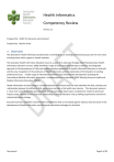 Health Informatics Competency Review Version 1.1 Prepared for: AHIEC for discussion and comment Prepared by: Heather Grain 1 Overview The demand for Health Informatics professionals is extending across existing professional groups and into new areas including those which support e-Health initiatives. The Australian Health Informatics Education Council, as part of its extensive Strategic Work Plan(Australian Health Informatics Educaiton Council, 2009) identified a range of tasks required to develop a cohesive and integrated approach to the development of skills and quality educative approaches to health informatics education in Australia and the clear recognition of the profession of Health Informatics and the relationship of the discipline to existing professional areas. A wide range of international initiatives have informed this development including the International Medical Informatics Association recommendations on education (IMIA Working Group on Health and Medical Informatics Education, 2009b). Health information and technology is a multidisciplinary environment and this work identifies the skills, overlaps and relationships between the different skills, professions and jobs in the health care industry. This document presents a ‘straw man’ view of potential specialisations and sub-specialties based upon competencies related to perceived industry need. Review of these and their relationship to priority education and up-skilling requirements and inform national education strategy. Executive Summary identifies recommended competencies that can be tested against industry need and assist in the development of health informatics up-skilling and educational strategies for Australia. Document1 Page 1 of 21 Contents 1 Overview ................................................................................................................................................................... 1 2 Executive Summary ................................................................................................................................................... 3 2.1 Action Recommended....................................................................................................................................... 4 3 Background ............................................................................................................................................................... 5 4 Development Approach ............................................................................................................................................ 5 4.1 5 6 Competency Definitions and Scope .................................................................................................................. 5 4.1.1 Skill Descriptions ....................................................................................................................................... 5 4.1.2 Skill Levels ................................................................................................................................................. 6 4.1.3 Skill Domains ............................................................................................................................................. 8 4.2 Scope ................................................................................................................................................................. 8 4.3 Identification of the Scope of Health Informatics ........................................................................................... 10 4.4 Competency identification .............................................................................................................................. 10 4.5 Career Pathways ............................................................................................................................................. 11 Competencies ......................................................................................................................................................... 12 5.1 Competency 1 -Knowledge ............................................................................................................................. 13 5.2 Competency 2 - Medicine, Health and Biosciences, Health System Organisation ......................................... 15 5.3 Competency 3 - Informatics/Computer Sciences, Mathematics, Biometry ................................................... 16 Examples of job based competencies ..................................................................................................................... 18 6.1 Health Informatics Educator ........................................................................................................................... 18 6.2 Health Identification Certification .................................................................................................................. 18 6.2.1 Health Identification Practice.................................................................................................................. 18 6.2.2 Health Identification Administration ...................................................................................................... 18 7 Survey...................................................................................................................................................................... 20 8 References .............................................................................................................................................................. 21 Document1 Page 2 of 21 2 Executive Summary The focus of the recommendations for education and competency development in health informatics in Australia are based upon the recommendations of IMIA(IMIA Working Group on Health and Medical Informatics Education, 2009a). The requirements are to: Support health based approaches, to ensure a common base of knowledge of information requirements in hea