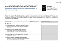 2015/16 ACCREDITATION THROUGH PARTNERSHIP Competencies mapping document for Doctoral programmes in Counselling Psychology Programmes will need to evidence that they meet the competency standards we outline in our Standards for the accreditation of Doctoral programmes in Counselling Psychology handbook in full. Differing levels of emphasis on particular aspects by different providers will allow flexibility and enable the unique identity of particular programmes to be preserved. You should use the table below to tell us where particular competencies are addressed. Our self-evaluation questionnaire requires you to provide additional narrative explaining how your programme reflects each of these components. Competencies 1. Philosophy 1.1 understand the diverse philosophical bases which underpin the psychological theories that are relevant to counselling psychology; 1.2 be able to critically evaluate the primary philosophical paradigms that inform psychological theory and the understanding of the subjectivity and intersubjectivity of human experience; 1.3 understand the spiritual and cultural traditions relevant to counselling psychology; 1.4 embrace humanistic and relational value systems that engage with meaning, co-construction, and interpretation and aim at the exploration, clarification, and holistic Module(s)/coverage Reviewers’ comments understanding of clients’ predicaments; 1.5 embody the identity of the Reflective Practitioner and demonstrate the ability to engage in a collaborative dialogue with clients aiming at understanding their subjective experience and constructions of meaning and reality; and 1.6 be in a position to use their own personal insight, life experiences, personal therapy and clinical supervision to facilitate the formation of a strong therapeutic relationship that is founded upon the practitioner’s personal qualities and the core conditions of empathy, acceptance, and authenticity. 2. Psychological Knowledge and Application 2.1 demonstrate knowledge of theories of human, cognitive, emotional, behavioural, social and physiological functioning relevant to counselling psychology; 2.2 critically evaluate theories of mind and personality; 2.3 demonstrate knowledge of different theories of life-span development; 2.4 understand the importance of historical, social and cultural contexts and their impact on practice; 2.5 demonstrate knowledge of psychological, social, and relational distress and knowledge of a range of explanatory frameworks used to understand these presentations (e.g., distress as meaningful, distress as psychopathology etc.). Trainees will also demonstrate the ability to critically evaluate these in the light of research and practice; 2 2.6 demonstrate knowledge and critical understanding of psychometric theory; 2.7 evaluate, use and interpret psychometric tests; this includes the selection, administering, scoring and interpretation of performance based psychometric tests, e.g. neuropsychological tests, tests of cognition and development, self-other report, and other standardised assessment procedures. Use of such tests would be in close collaboration with clients and identified as one, amongst other, possible means for understanding and interpreting clients' psychological distress; 2.8 have the ability to critically evaluate the reliability and validity of such procedures; 2.9 have knowledge of diagnostic frameworks such as the DSM and ICD, including a critical understanding of the concept of diagnosis (see note in handbook); and 2.10demonstrate knowledge and critical understanding of psychopharmacology and have the ability to evaluate its effects in the light of research and relational practice. 3. Psychological assessment and formulation 3.1 initiate, develop, maintain and end a purposeful therapeutic alliance and be able to work therapeutically at relational depth; 3.2 understand and work with the therapeutic relationship and alliance as conceptualised by different models of psychological therapy; 3 3.3 conduct psychological assessments (depending on the therapeutic modality used) aiming at increasing clients’ self awareness and shared understanding of their predicament, nature of distress, needs, expectations, and desired outcomes; 3.4 conduct appropriate risk assessment and use this to guide practice; 3.5 construct collaborative formulations utilising theoretical frameworks and the clients’ subjective experience aiming at an empathic understanding of their predicament; 3.6 ensure that formulations are expressed in accessible language, culturally sensitive, and non-discriminatory in terms of, for example, age, gender, disability, and sexuality; 3.7 reflect on and revise formulations in the light of on-going feedback and intervention and use them as a basis for decision making with regards to an appropriate therapeutic plan; and 3.8 lead on the implementation of on-going formulation in work settings, utilised in order to enhance teamwork, multiprofessional communication and psychological mindedness in those settings. 4. Counselling psychology practice and psychological intervention 4.1 demonstrate in depth critical knowledge and supervised clinical experience of the particular theory and practice of at least one specific model of psychological therapy (a model of psychological therapy is defined as a particular therapeutic approach in relation to which there is a body of theory and 4 research which has implications for therapeutic practice; and that offers an explanation with internal consistency about the nature of the person, of psychological difficulty, of the therapeutic relationship, and of the process of change); 4.2 have a working knowledge and supervised clinical experience of at least one further model of psychological therapy (working knowledge is defined as the ability to apply theory into therapeutic practice); 4.3 be able to compare, contrast and critically evaluate the ontological and epistemological foundations underlying a r