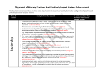 Alignment of Literacy Practices that Positively Impact Student Achievement This document represents a synthesis of critical action steps, found in the research and taken by districts that see high rates of growth towards proficiency across sub-groups of students. Area of Action Examples from the research Leadership To what extent are these leveraged in a school or multiple schools? Leadership has crafted and stated a strong, cohesive vision for all students to make growth and be educated with at least the goal for proficiency in grade level content standards. (Leadership driver) There is a clear expectation of growth for all learners. (Leadership driver) Leadership has developed strong, strategic partnerships supported by strong community interest for targeted groups of underperforming students. (Leadership driver) The leadership has developed a shared understanding and provides support for effective differentiated instruction strategies. (Leadership driver) The leadership is distributed across levels and disciplines of the educational system with layers of personal responsibility and accountability to ensure changes are implemented. (Leadership driver)/ Recognition/ There is collective ownership for student learning among administrators, teachers, support staff, and students. (Leadership driver) There is a concerted effort to manage change. (Leadership driver) There are resources allocated according to what maximizes opportunities for all students. (Integrated supports driver/fidelity) Leadership has technical and practical knowledge of current best practices. (Integrated supports driver/fidelity) There are structures that inform district leadership in guiding the overall change process with input from building leadership to help keep the plan grounded in reality and ensure buy-in from the bottom of the educational structure to the top. (Facilitative administration driver) Leadership actively seeks, selects, and cultivates personnel by using resources and ingenuity to attract highly qualified personnel. Leaders assert control over who joins staff to ensure there is belief and willingness to believe that all students can achieve. (Selection driver) Teachers and administrators express consistent views about achievement related to school goals. (Selection driver) Teachers are assigned to work with students based on the match between their competency and student needs. (Selection driver) Leadership develops strategies to automate and systematize instructional elements to increase efficient use of planning and collaboration time with strict enforcement until benefits are realized (found by Wellstone Academy action research). (Facilitative administration driver) Instruction, curricular alignment with state standards There is vertical and horizontal alignment of curriculum to state standards. (Integrated supports driver/fidelity) There is common professional development on core content for all teachers and professional development coaches such that staff have expertise in both content and pedagogy. (Integrated and competency drivers) There are appropriate supports for teachers to meet the needs of all students, including coaching on literacy practices and interventions. (Competency selection, training, coaching, and facilitative administration drivers) Barriers to high level course taking are systematically removed .(Facilitative administration driver) Students who are behind spend more time on reading and math to accelerate rate of learning to achieve beyond grade level to college readiness. (Facilitative administration driver) There has been realignment of district administration to reflect the unification of regular education and special education curriculum.(Systems intervention driver) There is explicit communication of district expectations for high levels of achievement among all students and regular and systematic follow- up with focused conversations on what it will take. (Leadership driver) There is standardization of curriculum and textbook adoption practices for all students, common evaluation processes, and regular opportunities to assess progress. (Decision support systems data systems driver) There is co-teaching among special and general education specialists, team-teaching, and strategic coaching. (System intervention driver) There has been an adoption of assistive technologies designed to meet the needs of and make instruction accessible for students across ability levels. (Facilitative administration driver) Accountability is shared among all teaching staff for high levels of achievement among all students, regardless of ability. (Leadership driver) There is a focus on core curricula and reduction or elimination of pull-out interventions during core content time. (Integrated and facilitative administration drivers) Instructional practices are in place to ensure that all students receive challenging and appropriate instruction. (Facilitative administration driver) There is training and coaching in differentiated instruction and there is flexibility to modify student learning targets, processes, and products. (Competency drivers) There are procedures for accelerating instruction. (Facilitative administration driver) There is training for administrators and teachers in pre-assessment and flexible grouping strategies. (Competency driver) Grouping opportunities exist in core subjects. (Facilitative administration driver) Leadership selects a good program and sticks with it to make it better and better. (Systems support driver) Assessment The leadership promotes a culture of openness and commitment to improvement rather than punitive punishment for identifying failures. (Facilitative administration driver) The leadership promotes the use of assessment prior to instruction as a means of effectively differentiating instruction for all students within the classroom. (Decision support systems data systems driver) There is training in new data management systems in the areas of data en