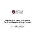 Designing SQL Server 2012 Analysis Services Cubes using Dillard’s Dataset Updated May 18, 2012 Using Microsoft’s Business Intelligence Suite to Design Cubes Once you receive your University of Arkansas MEC account, access will be via remote desktop connection. Remote access documentation is at the following link: http://enterprise.waltoncollege.uark.edu/Remote_Desktop_MEC_GW.pdf Microsoft’s Business Intelligence Suite provides tools that assist in all phases of business intelligence from building the data warehouse, creating and analyzing cubes to data mining. The following provides a cube designing example using the UA_Dillards database. Click Start All Programs Microsoft SQL Server 2012 SQL Server Data Tools (formerly called Business Intelligence Development Studio) as shown below. The Microsoft SQL Server Data Tools uses Microsoft Visual Studio 2010(VS) as the Integrated Development Environment which will be familiar to VB.NET or C# users. When VS opens, most likely the top part of the window will include the menu and tool bar with the Start Page tab active (Note: Prior to VS opening, you may be prompted to select a default environment setting. Choose Business Intelligence Settings, and select “Start Visual Studio). As usual, when you work within VS, some tabs will be created toward the top; these tabs can be closed by right-clicking and selecting Close. The name of the SQL Server 2012 Analysis Services Server and the server being used to store the data sources in these exercises is ENT-ASRS.waltoncollege.uark.edu Designing a Cube using SSAS A cube building project requires SQL Server Analysis Services. The SQL Server Analysis Services 2012 server is named ENT-ASRS.waltoncollege.uark.edu. Thus, assuming that the data from which the cube is to be built is in an accessible SQL Server 2012 database, the first step is to connect to the Analysis Services database where you will create the BI objects. You will do this in an Analysis Services (AS) database already created for you. The AS database will have the same name as your login user name with AS at the end. For example, a user with a user name ES90000 will have an AS database named ES90000AS. To connect to/access the database, click File -> Open -> Analysis Services Database… The Connect To Database screen comes up. Enter the Server name, ENT-ASRS.WALTONCOLLEGE.UARK.EDU. Use the drop down list box to select a database where you will put your Analysis Services objects. You will only see database/s you have access to. Last updated 2/9/2016 1:31 AM Page - 3 - Designing a Cube using SSAS Click the OK button. Visual Studio opens – and the default location for Solution Explorer is the top right. You may need to use the horizontal scroll bar to scroll to the right to see the Solution Explorer. If it is not there, then click View on the menu and then click Solution Explorer. The name of your project should be visible with a number of other entries as shown below. The name of your project may be different from the name used in this example (doesn’t matter). Your project will have the same name as the AS database you selected (ES90000AS) in this case). Steps required to design a Cube include: 1. 2. 3. 4. 5. 6. Create Data Source Create Data Source View Create a Cube Wizard Browse the Cube Managing Dimensions (attributes and hierarchies) Customizing Cube Functionality Last updated 2/9/2016 1:31 AM Page - 4 - Designing a Cube using SSAS 1. Create Data Source The next step requires creating a data source to be used for cube designing. Right-click Data Sources in the Solution Explorer and Click New Data Source… \ The Data Source Wizard Welcome page opens up. You can check the “Don’t show this page again” checkbox to avoid seeing the window each time the wizard starts. Click Next. Last updated 2/9/2016 1:31 AM Page - 5 - Designing a Cube using SSAS The Data Source Wizard then allows the creation of a connection. Click on the New… button. The Connection Manager opens up. Leave the default Provider as Native OLEDB\SQL Native Client 11.0. Enter the Server name. In this case, it is Last updated 2/9/2016 1:31 AM Page - 6 - Designing a Cube using SSAS ENT-ASRS1. Also, leave the default security as Windows Authentication. Use the drop down list box to select a database (in this case, UA_DILLARDS) that is to be used for designing the cube and click the Test Connection button (lower left) to ensure a connection exists to the database. Click OK. A new data connection is added. Click Next. On the Impersonation Information page, select “Use a specific user name and password. The user name and password to enter here is the one provided to you by the University of Arkansas. Give a name to your Data Source (DILLARDS in this case) and click Finish Last updated 2/9/2016 1:31 AM Page - 7 - Designing a Cube using SSAS 2. Create Data Source View Next, a Data Source View will be needed. The Data Source View is sort of an abstract client view of the data. Rightclick Data Source Views in the Solution Explorer and click New Data Source View to open the Data Source View Wizard. Click the Next button on the Welcome page (not shown). Note that the Relational data source is the one you just created (DILLARDS). This page allows creating a new data source in case one hasn’t yet been created. Because the desired data source exists, click the Next button to define the Data Source View. Last updated 2/9/2016 1:31 AM Page - 8 - Designing a Cube using SSAS From the Select Tables and Views dialog, locate and select the desired data sources in Available objects and click the > button to move them to the list of Included objects. In this example, all the five tables in the UA_DILLARDS database will be used for designing the cube and so, select all the tables and moved to the Included objects list (see screenshot below). Click the Next button. The last page of the Wizard allows you to enter a Name, DILLARDS is the Data Source name we will use in this example an