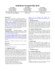 ACM Word Template PDC 2016 1st Author 2nd Author 3rd Author 1st author's affiliation 2nd author's affiliation 3rd author's affiliation 1st line of address 1st line of address 1st line of address 2nd line of address 2nd line of address 2nd line of address Telephone number, incl. country code Telephone number, incl. country code Telephone number, incl. country code 1st author's E-mail address 2nd E-mail ABSTRACT In this paper, we describe the formatting guidelines for submissions to the PDC 2016 Conference Proceedings. They are identical to the ACM SIG Proceedings requirements found at the following link: http://www.acm.org/publications/articletemplates/proceedings-template.html/. Also, this is where LaTex users can find the correct template. The only modifications in this template different from the ACM SIG Proceedings template are found in the text and examples provided. Please review this document even if you have used a similar format before. ACM has changed details in the format for proceedings as of January 2015. Note especially the change in reference style. CCS Concepts • Human-Centered computing➝ Interaction design • Participatory design This is just an example, please use the correct category and subject descriptors for your submission. The ACM Computing Classification Scheme: 3rd E-mail material. Or, to download the template from: http://www.acm.org/publications/article-templates/proceedingstemplate.html/ 2. BLIND REVIEW Paper submissions for PDC 2016 will go through a two round, double blind review. For more detail on this, please see the PDC 2016 conference website. Before submitting in both rounds, please remove all author and institutional details from the header section, from the acknowledgements and the body of your paper. You do not have to omit citing or referencing your own work, but must do so in ways that do not reveal your identity as author(s). 2.1 Abstract and Keywords Every submission should begin with an abstract of about 150 words, followed by a set of keywords. The abstract should be a concise statement of the problem, approach and conclusions of the work described. It should clearly state the paper's contribution to the field of PD. http://www.acm.org/about/class/class/2012. Please read the HOW TO CLASSIFY WORKS USING ACM'S COMPUTING CLASSIFICATION SYSTEM for instructions on how to classify your document using the 2012 ACM Computing Classification System and insert the index terms into your Microsoft Word source file. The first set of keywords is used to catalogue the paper in the ACM Digital Library using the ACM Classification System. Please consult the instructions provided above in the ‘CSS Concepts’ section above on how to classify your paper. The second set of keywords will be used to index the paper in the proceedings. This is not an obligatory requirement except for accepted submissions. 3. PAGE SIZE Keywords Keywords are your own designated keywords separated by semicolons (“;”). This is required for all submissions 1. INTRODUCTION This format is to be used for submissions that are to be published in the PDC 2016 conference proceedings. We wish to give the conference proceedings a single, high-quality appearance. To do this, we ask you to follow some simple guidelines. In essence, we ask you to make your paper look exactly like this document. The easiest way to do this is simply to download this template from the conference website and replace the content with your own SAMPLE: Permission to make digital or hard copies of all or part of this work for personal or classroom use is granted without fee provided that copies are not made or distributed for profit or commercial advantage and that copies bear this notice and the full citation on the first page. To copy otherwise, or republish, to post on servers or to redistribute to lists, requires prior specific permission and/or a fee. Conference’16, Month 1–2, 2016, City, State, Country. Copyright 2010 ACM 1-58113-000-0/00/0010 …$15.00. DOI: http://dx.doi.org/10.1145/12345.67890 All material on each page should fit within a rectangle of 18 × 23.5 cm (7" × 9.25"), centered on the page, beginning 1.9 cm (0.75") from the top of the page and ending with 2.54 cm (1") from the bottom. The right and left margins should be 1.9 cm (.75"). The text should be in two 8.45 cm (3.33") columns with a .83 cm (.33") gutter. Please make sure that you use the Letter format, not A4. 4. TYPESET TEXT 4.1 Normal or Body Text Please use a 9-point Times Roman font, or other Roman font with serifs, as close as possible in appearance to Times Roman in which these guidelines have been set. The goal is to have a 9point text, as you see here. Please use sans-serif or nonproportional fonts only for special purposes, such as distinguishing source code text. If Times Roman is not available, try the font named Computer Modern Roman. On a Macintosh, use the font named Times. Right margins should be justified, not ragged. The length of Full Papers can be up to 10 pages (all inclusive), while Short Paper can be up to 4 pages (all inclusive). 4.2 Title and Authors The title (Helvetica 18-point bold), authors' names (Helvetica 12point) and affiliations (Helvetica 10-point) run across the full width of the page – one column wide. We also recommend phone number (Helvetica 10-point) and e-mail address (Helvetica 12point). See the top of this page for three addresses. If only one address is needed, center all address text. For two addresses, use two centered tabs, and so on. For more than three authors, you may have to improvise.1 4.3 First Page Copyright Notice Please leave 3.81 cm (1.5") of blank text box at the bottom of the left column of the first page for the copyright notice. 4.4 Subsequent Pages For pages other than the first page, start at the top of the page, and continue in double-column format. The two columns on the last page should be as close to equal length as possible. 4.5 References and Citations Footnotes 