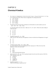 CHAPTER 12 Chemical Kinetics 1. The average rate of disappearance of ozone in the reaction 2O3 (g ) 3O2 (g ) is found to be 8.51 10–3 atm over a certain interval of time. What is the rate of appearance of O 2 during this interval? a) 12.8 10–3 atm/s b) 8.51 10–3atm/s c) 5.67 10–3atm/s d) 308 10–3atm/s e) 24.1 10–3atm/s 2. The balanced equation for the reaction of bromate ion with bromide ion in acidic solution is given by: BrO + 5Br + 6H + 3Br2 + 3H 2 O At a particular instant in time, the value of –[Br–]/t is 2.9 10–3 mol/L s. What is the value of [Br2]/t in the same units? a) b) c) d) e) 3. Consider the reaction 2H2 + O2 2H2O What is the ratio of the initial rate of the appearance of water to the initial rate of disappearance of oxygen? a) b) c) d) e) 4. 1.7 10–3 2.9 10–3 4.8 10–3 1.5 10–3 2.4 10–3 1:1 2:1 1:2 2:2 3:2 Consider the reaction: 4NH3 + 7O2 4NO2 + 6H2O At a certain instant the initial rate of disappearance of the oxygen gas is X. What is the value of the appearance of water at the same instant? a) b) c) d) e) 1.2 X 1.1 X 0.86 X 0.58 X cannot be determined from the data 5. For the reaction 5A + 5B → 4C + 4D, at a particular instant in time, the rate of the reaction is 0.0243 M/s. What is the rate of change of B? a) –0.0243 M/s b) 0.122 M/s c) –0.122 M/s d) –0.00486 M/s e) 0.00486 M/s 6. Consider the reaction X Y + Z Which of the following is a possible rate law? Copyright © Cengage Learning. All rights reserved. Chapter Error! Unknown document property name.: Error! Unknown document property name. a) b) c) d) e) 8. Rate = k[X] Rate = k[Y] Rate = k[Y][Z] Rate = k[X][Y] Rate = k[Z] The following data were obtained for the reaction of NO with O 2. Concentrations are in molecules/cm3 and rates are in molecules/cm3s. [NO]0 [O2]0 Initial Rate 1 10 18 1 10 18 2.0 10 16 2 10 18 1 10 18 8.0 10 16 3 10 18 1 10 18 18.0 1016 1 10 18 2 10 18 4.0 10 16 1 10 18 3 10 18 6.0 10 16 What is the rate law? a) b) c) d) e) 9. Rate = k[NO][O2] Rate = k[NO][O2]2 Rate = k[NO]2[O2] Rate = k[NO]2 Rate = k[NO]2[O2]2 The reaction of (CH3)3CBr with hydroxide ion proceeds with the formation of (CH3)3COH. (CH3)3CBr(aq) + OH–(aq) (CH3)3COH(aq) + Br–(aq) The following data were obtained at 55C. [(CH3)3CBr] 0 [OH–]0 Initial Rate Exp. (mol/L) (mol/L) (mol/L) 1 0.10 0.10 1.0 10 –3 2 0.20 0.10 2.0 10 –3 3 0.10 0.20 1.0 10 –3 4 0.30 0.20 ? What will the initial rate (in mol/L·s) be in Experiment 4? a) b) c) d) e) 10. 3.0 10–3 6.0 10–3 9.0 10–3 18 10–3 none of these For a reaction in which A and B react to form C, the following initial rate data were obtained: [A] (mol/L) 0.10 0.10 0.20 What is the rate law? a) b) c) d) e) 11. 290 [B] (mol/L) 0.10 0.20 0.20 Initial Rate of Formation of C (mol/L·s) 1.00 4.00 8.00 Rate = k[A][B] Rate = k[A]2[B] Rate = k[A][B]2 Rate = k[A]2[B]2 Rate = k[A]3 Tabulated below are initial rate data for the reaction Chapter Error! Unknown document property name.: Error! Unknown document property name. 2Fe(CN)63– + 2I– 2Fe(CN)64– + I2 [Fe(CN) 63–]0 0.01 0.01 0.02 0.02 0.02 Run 1 2 3 4 5 [I–]0 0.01 0.02 0.02 0.02 0.02 [Fe(CN) 64–]0 0.01 0.01 0.01 0.02 0.02 [I2]0 0.01 0.01 0.01 0.01 0.02 Initial Rate (M/s) 1 10 –5 2 10 –5 8 10 –5 8 10 –5 8 10 –5 The experimental rate law is: a) b) c) d) e) 12. I2 t I2 t I2 t I2 t I2 t = k[Fe(CN)63–]2[I–]2[Fe(CN)64–]2[I2] = k[Fe(CN)63–]2[I–][Fe(CN)64–][I2] = k[Fe(CN)63–)]2[I–] = k[Fe(CN)63–][I–]2 = k[Fe(CN)63–][I–] [Fe(CN)64–] Tabulated below are initial rate data for the reaction: 2Fe(CN)63– + 2I– 2Fe(CN)64– + I2 Run [Fe(CN) 63–]0 1 0.01 2 0.01 3 0.02 4 0.02 5 0.02 What is the value of k? a) b) c) d) e) [I–]0 0.01 0.02 0.02 0.02 0.02 [Fe(CN) 64–]0 0.01 0.01 0.01 0.02 0.02 [I2]0 0.01 0.01 0.01 0.01 0.02 Rate (M/s) 1 10 –5 2 10 –5 8 10 –5 8 10 –5 8 10 –5 107 M–5 s–1 103 M–3 s–1 10 M–2 s–1 50 M–2 s–1 none of these Use the following to answer questions 13-18: A general reaction written as A + 2B C + 2D is studied and yields the following data: [A] 0 [B] 0 Initial [C]/t 0.150 M 0.150 M 8.00 10–3 mol/L·s 0.150 M 0.300 M 1.60 10–2 mol/L·s 0.300 M 0.150 M 3.20 10–2 mol/L·s 291 Chapter Error! Unknown document property name.: Error! Unknown document property name. 13. What is the order of the reaction with respect to B? a) 0 b) 1 c) 2 d) 3 e) 4 14. What is the order of the reaction with respect to A? a) 0 b) 1 c) 2 d) 3 e) 4 15. What is the overall order of the reaction? a) 0 b) 1 c) 2 d) 3 e) 4 16. What is the numerical value of the rate constant? a) 0.053 b) 1.19 c) 2.37 d) 5.63 e) none of these (A-D) 17. Determine the initial rate of B consumption ([B]/t) for the first trial? a) 8.00 10–3 mol/L·s b) 1.60 10–2 mol/L·s c) 3.20 10–2 mol/L·s d) 4.00 10–3 mol/L·s e) none of these (A-D) 18. Determine the initial rate of C production ([C]/t) if [A] = 0.200 M and [B] = 0.500 M. a) 4.74 10–2 mol/L·s b) 2.37 10–1 mol/L·s c) 1.19 10–1 mol/L·s d) 8.23 10–2 mol/L·s e) none of these (A-D) Use the following to answer questions 19-21: Consider the following data concerning the equation: H2O2 + 3I – + 2H+ I 3– + 2H2O [H2O2] [I–] I 0.100 M 5.00 10–4 M II. 0.100 M 1.00 10–3 M III. 0.200 M 1.00 10–3 M IV. 0.400 M 1.00 10–3 M [H+] 1.00 10–2 M 1.00 10–2 M 1.00 10–2 M 2.00 10–2 M rate 0.137 M/sec 0.268 M/sec 0.542 M/sec 1.084 M/sec 292 Chapter Error! Unknown document property name.: Error! Unknown document property name. 19. The rate law for this reaction is a) rate = k[H2O2][I–][H+] b) rate = k[H2O2]2[I–]2[H+]2 c) rate = k[I–][H+] d) rate = k[H2O2][H+] e) rate = k[H2O2][I–] 20. The average value for the rate constant k (without units) is a) 2710 b) 2.74 104 c) 137 d) 108 e) none of these 21. Two mechanisms are proposed: a) b) c) d) e) Mechanism I, with the first step the rate determining step. Mechanism I, with the second step the rate determining step. Mechanism II, with the first st