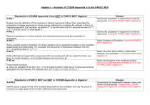 Algebra I – Analysis of CCSSM Appendix A to the PARCC MCF Standards in CCSSM Appendix A but NOT in PARCC MCF Algebra I N-RN.1 Cluster Extend the properties of exponents to rational exponents (moved to PARCC MCF Algebra II) Explain how the definition of the meaning of rational exponents follows from extending the properties of integer exponents to those values, allowing for a notation for radicals in terms of rational exponents. For example, we define 51/3 to be the cube root of 5 because we want (51/3)3 = 5(1/3)3 to hold, so (51/3)3 must equal 5. N-RN.2 Rewrite expressions involving radicals and rational exponents using the properties of exponents. A-REI.7 Solve a simple system consisting of a linear equation and a quadratic equation in two variables algebraically and graphically. For example, find the points of intersection between the line y = –3x and the circle x2 + y2 = 3. F-BF.2 Write arithmetic and geometric sequences both recursively and with an explicit formula, use them to model situations, and translate between the two forms.★ F-BF.4a Find inverse functions. a. Solve an equation of the form f(x) = c for a simple function f that has an inverse and write an expression for the inverse. For example, f(x) =2x3 or f(x) = (x+1)/(x–1) for x ≠ 1. Standards in PARCC MCF but NOT in CCSSM Appendix A Algebra I A-APR.3 Identify zeros of polynomials when suitable factorizations are available, and use the zeros to construct a rough graph of the function defined by the polynomial. Extend the properties of exponents to rational exponents (moved to PARCC MCF Algebra II) Solve Systems of Equations (moved to PARCC MCF Algebra II) Build a function that models a relationship between two quantities (moved to PARCC MCF Algebra II) Build new functions from existing functions (found in CCSM Appendix A Algebra I & II, now in PARCC MCF Algebra II) Cluster Understand the relationship between zeros and factors of polynomials (moved from CCSSM Appendix A Algebra II to PARCC MCF Algebra I) Geometry – Analysis of CCSSM Appendix A to the PARCC MCF Standards in CCSSM Appendix A but NOT in PARCC MCF Geometry Cluster G-SRT.9 Apply trigonometry to general triangles (+) Derive the formula A = 1/2 ab sin(C) for the area of a triangle by drawing an auxiliary line from a vertex perpendicular to the opposite side. G-SRT.10 Apply trigonometry to general triangles (+) Prove the Laws of Sines and Cosines and use them to solve problems. G-SRT.11 Apply trigonometry to general triangles (+) Understand and apply the Law of Sines and the Law of Cosines to find unknown measurements in right and non-right triangles (e.g., surveying problems, resultant forces). G-C.4 Understand and apply theorems about circles (+) Construct a tangent line from a point outside a given circle to the circle. G-GPE.2 Derive the equation of a parabola given a focus and directrix. S-CP.1 Describe events as subsets of a sample space (the set of outcomes) using characteristics (or categories) of the outcomes, or as unions, intersections, or complements of other events (“or,” “and,” “not”). S-CP.2 Understand that two events A and B are independent if the probability of A and B occurring together is the product of their probabilities, and use this characterization to determine if they are independent. S-CP.3 Understand the conditional probability of A given B as P(A and B)/P(B), and interpret independence of A and B as saying that the conditional probability of A given B is the same as the probability of A, and the conditional probability of B given A is the same as the probability of B. Translate between the geometric description and the equation for a conic section (moved to PARCC MCF Algebra II) Understand independence and conditional probability and use them to interpret data (moved to PARCC MCF Algebra II) Understand independence and conditional probability and use them to interpret data (moved to PARCC MCF Algebra II) Understand independence and conditional probability and use them to interpret data (moved to PARCC MCF Algebra II) Standards in CCSSM Appendix A but NOT in PARCC MCF Geometry S-CP.4 Construct and interpret two-way frequency tables of data when two categories are associated with each object being classified. Use the two-way table as a sample space to decide if events are independent and to approximate conditional probabilities. For example, collect data from a random sample of students in your school on their favorite subject among math, science, and English. Estimate the probability that a randomly selected student from your school will favor science given that the student is in tenth grade. Do the same for other subjects and compare the results. S-CP.5 Recognize and explain the concepts of conditional probability and independence in everyday language and everyday situations. For example, compare the chance of having lung cancer if you are a smoker with the chance of being a smoker if you have lung cancer. S-CP.6 Find the conditional probability of A given B as the fraction of B’s outcomes that also belong to A, and interpret the answer in terms of the model. S-CP.7 Apply the Addition Rule, P(A or B) = P(A) + P(B) – P(A and B), and interpret the answer in terms of the model. S-CP.8 (+) Apply the general Multiplication Rule in a uniform probability model, P(A and B) = P(A)P(B|A) = P(B)P(A|B), and interpret the answer in terms of the model. S-CP.9 (+) Use permutations and combinations to compute probabilities of compound events and solve problems. S-MD.6 (+) Use probabilities to make fair decisions (e.g., drawing by lots, using a random number generator). S-MD.7 (+) Analyze decisions and strategies using probability concepts (e.g., product testing, medical testing, pulling a hockey goalie at the end of a game). Standards in PARCC MCF but NOT in CCSSM Appendix A Geometry None Cluster Understand independence and conditional probability and use them to interpret data (moved to PARCC MCF Algebra II) Understand indepe