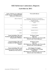 OIE Reference Laboratory Reports Activities in 2011 Name of disease (or topic) for which you are a designated OIE Reference Laboratory: Address of laboratory Newcastle disease OIE Reference Laboratory for Avian influenza Istituto Zooprofilattico Sperimentale delle Venezie (IZSVe), Viale dell’Università, 10 – 35020 Legnaro (Padua), ITALY Tel.: +39 049 8084371 Fax: +39 049 8084360 e-mail address: website: icapua@izsvenezie.it www.izsvenezie.it Name (including Title and Position) of Head of Laboratory (Responsible Official): Dr Ilaria Capua Director OIE Reference Laboratory for Newcastle Disease and Avian Influenza Name(including Title and Position) of OIE Reference Expert: Dr Ilaria Capua Director OIE Reference Laboratory for Newcastle Disease and Avian Influenza Name (including Title and Position) of writer of this report (if different from above): Dr Calogero Terregino Head of the Diagnostic Virology Laboratory OIE Reference Laboratory for Newcastle disease and Avian influenza Annual reports of OIE Reference Centres, 2011 1 Newcastle disease Part I: Summary of general activities related to the disease 1. Test(s) in use/or available for specified diseases at the Italian OIE ND laboratory Table 1 2. Test For Specificity Total Haemagglutination inhibition test (HI) Antibody Subtype 2863 Haemagglutination inhibition test (HI) Viral typing Subtype 18 Inoculation of SPF embryonated chicken eggs Virus isolation Group 856 rRT-PCR (reverse transcriptase- polymerase chain reaction) Virus Group 3124 Sequencing Virus Pathotype 403 Production and distribution of diagnostic reagents Table 2: Antigens produced in house at the Italian OIE ND laboratory in 2011 2 Antigen ml produced No of batches H1N1 1720 16 H1N2 630 7 H2N1 100 1 H2N2 330 4 H2N3 100 1 H2N5 200 1 H2N6 100 1 H3N1 100 1 H3N2 570 7 H3N6 210 2 H3N8 2110 15 H5N1 4823 39 H5N2 343 3 H5N3 1150 4 H5N9 575 2 H7N1 1280 9 H7N3 910 5 H7N4 245 1 H7N7 2465 8 Annual reports of OIE Reference Centres, 2011 Newcastle disease Antigen ml produced No of batches H9N2 4566 49 H10N1 240 2 NDV 3242 12 IBV QX 17280 37 IBV M41 2350 6 IBV Q1 1380 5 IBV IS/1494/06 170 3 PR8 310 4 Negative 240 1 TOTAL 47,739 246 Table 3: Sera produced in house at the Italian OIE ND laboratory in 2011 Serum ml produced No of batches Negative control serum 385 3 H1N1 123 2 H2N2 103 1 H2N1 103 1 H2N3 103 1 H3N2 164 1 H5N1 713 3 H5N2 385 4 H7N3 80 1 H9N2 604 6 H12N5 61 1 PMV1 (NDV) 332 3 PMV7 69 1 PMV8 217 1 IBV Q1 100 1 TOTAL 3,542 30 Table 4: Antigens supplied nationally and to laboratories in other countries by the Italian OIE ND laboratory in 2011 Antigen Amount supplied (ml) H1N1 106 H2N3 16 H3N2 4 H3N8 34 H4N8 16 Annual reports of OIE Reference Centres, 2011 3 Newcastle disease 4 Antigen Amount supplied (ml) H5N1 199 H5N2 358 H5N2 for AGID test 64 H5N3 182 H5N9 135 H6N2 45 H7N1 141 H7N3 262 H7N4 49 H7N7 171 H8N4 13 H9N2 80 H9N7 13 H10N1 22 H11N6 15 H11N9 3 H12N5 15 H13N6 16 H14N5 14 H15N9 14 H16N3 16 NDV 155 APMV1 (pigeon variant) 8 APMV2 10 APMV3 12 APMV4 9 APMV6 9 APMV7 13 APMV8 9 APMV9 9 NDV for ELISA test 16 IBV 624I 1 IBV QX 4 IBV D274 2 IBV 793B 2 IBV D1466 4 HEV 1 Annual reports of OIE Reference Centres, 2011 Newcastle disease Antigen Amount supplied (ml) ILT for AGID test 5 TOTAL 2,272 ml (701 ml nationally and 1,571 ml to laboratories in other countries) Table 5: Sera supplied nationally and to laboratories in other countries by the Italian OIE ND laboratory in 2011 Sera Amount supplied (ml) Negative control serum 224 H1N1 45 H1N2 1 H2N3 19 H3N2 4 H3N8 22 H4N8 19 H5N1 93 H5N2 172 H5N3 100 H5N9 29 H6N2 37 H7N1 72 H7N3 49 H7N4 10 H7N7 120 H8N4 19 H9N2 57 H9N7 13 H10N1 19 H11N6 16 H11N9 8 H12N5 18 H13N6 20 H14N5 19 H15N9 17 H16N3 30 NDV 81 APMV1(pigeon variant) 7 APMV2 14 APMV3 15 Annual reports of OIE Reference Centres, 2011 5 Newcastle disease Sera Amount supplied (ml) APMV4 11 APMV6 10 APMV7 11 APMV8 10 APMV9 10 IBV M41 2 IBV 624I 3 IBV D274 2 MG SAR 26 ILT for AGID test 3 TOTAL 1,457 ml (95 ml nationally and 1,362 ml to laboratories in other countries) Part II: Activities specifically related to the mandate of OIE Reference Laboratories 3. International harmonisation and standardisation of methods for diagnostic testing or the production and testing of vaccines a) Establishment and maintenance of a network with other OIE Reference Laboratories designated for the same pathogen or disease and organisation of regular inter-laboratory proficiency testing to ensure comparability of results In March 2011, the Reference Laboratory participated in the European proficiency test on AI and ND organized by the EU Reference Laboratory (AHVLA, Weybridge, UK) for EU member countries and some extra-EU countries. The PT panel consisted of blind serum samples for the serological determination of the avian influenza subtype/ND antibodies and antibody titre. In addition, blind samples for molecular testing (RT-PCR and sequencing) were submitted. The laboratory achieved 100% of correct results. b) Organisation of inter-laboratory proficiency testing with laboratories other than OIE Reference Laboratories for the same pathogens and diseases to ensure equivalence of results Ring trials organized by the Italian OIE Reference Laboratory during 2011 National Ring-test In 2011 a serological and virological ring test was organised by the Italian National Reference Centre to assess the capability of Italian public laboratories to identify selected antigens; to detect antibodies to avian influenza viruses and Newcastle disease in avian sera; to standardize the diagnostic procedures used by the different laboratories. Each laboratory was identified with a number known to the laboratory itself only (stated upon consignment of partial data). As in the previous ring test, in 2011 each laboratory received 15 viral antigens (avian Orthomyxovirus and Paramyxovirus) labelled with numbers from 1 to 15, and 15 sera for influenza virus and avian Paramyxovirus labelled with letters from A to Q. Lyophilized re