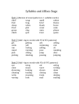 Syllables and Affixes Stage Sort 1 (Review of vowel pattern in 1 syllable words) chief fruit sharp front groan climb wrap twig when plot clog quit smell brief thank scout stain trust whine theme brave scale phone quote Sort 2 (Add –ing to words with VC & VCC patterns) get swim run stand pick picking getting yell resting running sitting shutting ask swimming yelling pass jump passing asking rest sit standing shut jumping Sort 3 (Add –ing to words with VCe & VVC patterns) use close dreaming cleaning write waving using moan looking trading moaning look eat wave dream closing trade mail eating writing skate clean skating mailing Sort 4 (Review of Double, e-drop, and nothing) setting cutting spelling grinning pushing going hiking floating adding having humming fixing reading stopping begging feeling working talking moving living coming jogging snowing taking joined helped shouted stepped seemed chewed acted mixed nodded named lived waited Sort 5 (Add –ed to words) hopped planned closed started passed grabbed hoped saved scored stirred dropped wanted Sort 6 (Unusual past tense words) sleep shine sweep swept draw say slept freeze know bled shone drove keep throw threw knew said kept slide bleed drew froze slid drive Sort 7 (Plural endings: adding –es) benches brushes clothes voices sketches branches horses guesses crashes peaches kisses watches foxes splashes churches classes leashes places speeches scratches mixes ditches changes ashes sheep leaves geese mouse wolf deer foot women woman wolves knife teeth stays sprays frying cries spraying spy fried fries playing spied cried stayed Sort 8 (Unusual plurals) wife feet lives life mice knives wives loaf leaf loaves goose tooth Sort 9 (y + inflected endings) play plays played staying cry spray fry crying spies sprayed stay spying Sort 10 (Compound words) bookcase downstairs headfirst downtown headlight scrapbook lighthouse headphones bookmark downpour cookbook snowplow snowman downhill daylight flashlight countdown headstrong headache snowflake bookworm snowstorm sunlight lightweight Sort 11 (More compound words) somebody itself beside sideways somehow myself himself something throughout herself someone without everything outside yourself somewhere themselves anyone inside anything sometime nothing checkout everyone Sort 12 (Syllable juncture in VCV & VCCV patterns) super tiger later puppy ruler hello supper happy paper over kitten lesson diner pretty penny tiny letter summer dinner busy even rabbit crazy open Sort 13 (More syllable juncture in VCV & VCCV patterns) silent funny female sister fever water happen winter after finger chapter window number problem moment bottom blanket yellow follow better pattern member pillow only Sort 14 (Syllable juncture in VCV & VVCV patterns) human pilot meeting finish lazy music never visit lemon student leader minute reason planet frozen seven easy humor river wagon peanut present second sneaker Sort 15 (Syllable junctures in VCCCV & VV patterns) athlete complete pumpkin halfway English lion pilgrim control mushroom kitchen hundred diet create poet riot trial cruel inspect children duet monster poem giant kingdom Sort 16 (Open & closed syllables & inflected endings) hoping plotting joking shouting panting leaking hopping quoted telling nodded floated saving cleaned greeted winning racing needed painted skipped wrapped hunted skated letting faded Sort 17 (Long a patterns in accented syllables) rainbow obey complain basement bracelet again awake raisin mistake maybe amaze explain painter crayon chocolate mayor pavement remain contain decay parade escape today payment Sort 18 (Long i patterns in accented syllables) frighten advice combine favorite lightning brightly beside decide forgive invite polite delight surprise survive provide ninety sidewalk arrive machine driveway slightly describe higher highway Sort 19 (Long o patterns in accented syllables) toaster hostess soldier lonesome loafer postage below explode compose remote awoke bowling coaster lonely owner lower Europe erode alone suppose decode approach soapy poster Sort 20 (Long u patterns in accented syllables) rooster balloon fewer noodle shampoo confuse include reduce jewel excuse pollute cocoon Tuesday cartoon refuse toothache chewy cougar useful doodle raccoon beauty scooter amuse Sort 21 (Long e patterns in accented syllables) needle increase compete indeed fifteen eastern feather leather feature meaning sweater people succeed defeat heavy pleasant healthy reader season repeat freedom extreme steady thirteen Sort 22 (Ambiguous vowels in accented syllables: voyage country coward noisy double powder oy/oi and ou/ow) about moisture avoid annoy allow appoint drowsy thousand poison employ county counter destroy amount trouble loyal around southern Sort 23 (More ambiguous vowels in accented syllables: au, aw, al) saucer awful author always lawyer although awesome laughed caution flawless auction haunted also August awkward laundry faucet sausage almost all right autumn gnawed already gawking Sort 24 (r influenced a in accented syllables) garden market parents marble partner barely airplane careful toward repair beware dairy compare carpet haircut carry pardon declare aware despair harvest fairy barber hardly Sort 25 (r influenced o in accented syllables) morning shorter normal forty border ignore before record ashore report explore adore order forest corner northern corncob florist perform sorry reward stormy chorus inform Sort 26 (Words with the w or /w/ sound before the vowel) warmth wardrobe warden squat worship squabble worker quarter squad warrior quarrel backward watch world worry worthy worthwhile wander worse waffle warning swarm dwarf squash Sort 27 (Schwa + r spelled er, ir, & ur in first syllables) nervous firmly dirty spirit turtle furnish thirty person certain mermaid perhaps purple sturdy perfect birthday Thursday birdbath every purpose further hurry thirsty service during Sort 28 (Schwa + r and r influenced e in accented syllables: e
