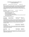 DEPARTMENT OF PHILOSOPHY SPRING 2013 COURSE DESCRIPTIONS PHIL 2300-001 Beginning Philosophy 9:00-9:50 MWF ENG/PHIL 152 Staff This is a general introduction to philosophy, designed to acquaint students with certain significant problems as they are considered by major philosophical figures. These are not esoteric questions but instead ones central to ordinary human experience. Students will be encouraged to formulate and defend their own answers to these questions, using the concepts and methods of inquiry introduced in the course. This process will help improve students’ abilities to think more critically and to communicate with greater clarity and precision. PHIL 2300-002 Beginning Philosophy 2:00-3:20 TR ENG/PHIL TBA Dr. Anna Christina Ribeiro This course is an introduction to some central philosophical questions: What is the moral way to conduct our lives? What is free will? Do we have it? Who is the ‘I’ that (apparently) makes decisions? Is there a difference between the mind and the brain? How do we know the answers to these and other questions? How do we know that we know them? How do we justify our answers? Readings will be both historical and contemporary. PHIL 2300-003 Beginning Philosophy 10:00-10:50 MWF ENG/PHIL 164 PHIL 2300-004 Beginning Philosophy 9:00-9:50 MWF ENG/PHIL TBA Dr. Dustin Tucker This course is an introduction to philosophy by way of some central philosophical questions, such as "Do we have free will?" "Can we prove that God does or does not exist? If not, what should we believe?" and "What is the relationship between the mind and the body?" In addition to introducing these topics and some of the major problems that surround them, we will focus on honing your ability to read a text carefully, to write clearly and precisely, and especially to think critically about difficult and intricate problems, philosophical or otherwise. PHIL 2310-002 Logic 11:00-11:50 MWF ENG/PHIL TBA PHIL 2310-003 Logic 12:00-12:50 MWF ENG/PHIL 163 Dr. Jonathan Dorsey This course focuses on the syntax, semantics, and derivation system for sentential and predicate logic. Importantly, the student will learn not only the formal theory of logic but also how to use it to assess the validity of arguments in natural language. PHIL 2310-004 Logic 10:00-10:50 MWF ENG/PHIL 153 PHIL 2310-006 Logic 11:00-11:50 MWF ENG/PHIL 153 Staff Development of formal methods for evaluating deductive reasoning. Additional topics may include uses of language, definition, nondeductive inference. Satisfies the Core Curriculum mathematics requirement. (in conjunction with a mathematics course). PHIL 2310-005 Logic 11:00-12:20 TR ENG/PHIL TBA Dr. Christopher Hom A central aspect of reasoning is the ability to give arguments for one’s conclusions. Logic is the formal representation of arguments, so mastering logic is essential for good reasoning. In this course, we will investigate the underlying, logical form of sentences and the deductive relations that hold between them, thus giving us deeper insight into the notion of logical inference from premises to conclusion. The course will present three logical systems, each in increasing expressive power: sentential logic, monadic quantificational logic, and polyadic quantificational logic. For each system, we will closely examine the syntax of the system, its relation to English, and its particular semantic features (e.g. satifiability, validity, implication and equivalence). PHIL 2320-001 Intro to Ethics 9:00-9:50 MWF ENG/PHIL 163 Dr. Jeremy Schwartz How should we live? What is a good life? Ought I to forgo my own interests for the interests of another? Is it sometimes permissible to kill innocent human beings? Is it permissible to kill animals for food? Ethical philosophy attempts to answer these sorts of questions through reason and reflection. Within current ethical philosophy, there are three major schools of thought on how these sorts of questions should be answered: utilitarianism, virtue theory, and deontology. While each of these attempts to shed light on all of these questions merely through reason and reflection, each of them arrives at very different answers to these questions. In this class, we will investigate utilitarianism, deontology, and virtue theory in some detail by closely reading both the founding texts of each of the ethical theories as well as reading some modern reinterpretations and criticisms. In addition, in the last part of the class, we will seek to apply these theories to three test cases: abortion, animal rights, and global poverty. The application to test cases should both shed light on our intuitions about these morally contested issues but also shed light on the ethical theories themselves. PHIL 2320-002 Intro to Ethics 9:30-10:50 TR ENG/PHIL TBA Dr. Howard Curzer Contemporary ethics is dominated by three systems (virtue ethics, utilitarianism, deontology) proposed by three great philosophers (Aristotle, Mill, Kant). Students in this course will come to understand these three moral systems. Students will be able to compare and contrast these three moral systems, weighing their strengths and weaknesses. Students will also apply each of these three moral systems to three contemporary moral problems (abortion, economic justice, marriage). PHIL 2320-003 Intro to Ethics 10:00-10:50 MWF ENG/PHIL 163 PHIL 2320-004 Intro to Ethics 11:00-11:50 MWF ENG/PHIL 163 Dr. Walter Schaller This course will be centered on the moral theories of John Stuart Mill and Immanuel Kant. We will read selections from Mill’s two most important books, UTILITARIANISM and ON LIBERTY. We will pay particular attention to Mill’s defense of individuality (and his criticism of social tyranny) in ON LIBERTY and try to figure out how it is consistent with utilitarianism. In the process we will also want to evaluate Mill’s criticisms of paternalism, the offense principle, and legal moralism. We will also consider some important theoretical questions about the moral re