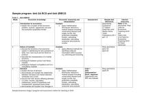 Sample program: Unit 2A ECO and Unit 2BECO Term 1 – Unit 2AECO Week Economic knowledge 1 Introduction to economics explain the concepts of the economic problem, scarcity, opportunity cost and the production possibility frontier 2 Nature of markets discuss the functions of an economic system in addressing the key questions of what, how, how much and for whom to produce describe the characteristics of a market economy distinguish between product and factor markets distinguish between competitive and noncompetitive markets Demand explain the law of demand demonstrate and explain the relationship between individual and market demand schedules and curves discuss the main factors affecting demand i.e. price, income, population, preferences, prices of substitutes and complements, expected future prices demonstrate and explain how changes in 3 Economic reasoning and interpretation Analysis apply mathematical techniques relevant to market analysis including constructing demand and supply curves, the production possibility frontier, calculating elasticities, calculating consumer and producer surplus. Assessment Analysis apply effective methods for identifying relevant information within sources e.g. skimming and scanning Analysis apply mathematical techniques relevant to market analysis including constructing demand and supply curves, the production possibility frontier, calculating elasticities, calculating consumer and producer Sample Economics Stage 2 program and assessment outline for teaching in 2012 Sample text references Discovering Economics 2nd Edition Greg Parry and Steven Kemp Tactic Publications 2011 pp1-13 Parry and Kemp pp13-14 pp23-25 Task 1 Data interpretation/ Short response Opportunity cost, PPF and markets Parry and Kemp pp25-29 Internet resources Refer to the documents ‘Web Links for Economics Teaching 2012’ and ‘Web Links (YouTube) for Economics Teaching 2012’ for these resources. price lead to an expansion or contraction in the quantity demanded and changes in non-price factors lead to an increase or decrease in demand 4 5 Supply explain the law of supply demonstrate and explain the relationship between individual and market supply schedules and curves discuss the main factors affecting supply i.e. factors of production, costs of production, expected future prices, number of suppliers, technology demonstrate and explain how changes in price lead to an expansion or contraction in the quantity supplied and changes in non-price factors lead to an increase or decrease in supply Market equilibrium explain the concept of market equilibrium demonstrate and explain how shifts in demand and supply curves cause changes in market equilibrium explain the concepts of market clearing, shortages and surpluses demonstrate and explain how the price mechanism clears market surpluses and shortages surplus. Communication apply appropriate economic methods and models in analysing market behaviour and performance including demand and supply analysis. Analysis apply mathematical techniques relevant to market analysis including constructing demand and supply curves, the production possibility frontier, calculating elasticities, calculating consumer and producer surplus. Communication apply appropriate economic methods and models in analysing market behaviour and performance including demand and supply analysis. Communication apply appropriate economic methods and models in analysing market behaviour and performance including demand and supply analysis. evaluate evidence from collected economic Sample Economics Stage 2 program and assessment outline for teaching in 2012 Parry and Kemp pp29-32 Parry and Kemp pp32-38 6 7 Elasticity explain the concept of price elasticity of demand calculate price elasticity of demand distinguish between goods that are price elastic and price inelastic in demand outline the determinants of price elasticity of demand demonstrate and explain the link between price elasticity of demand and total revenue explain the concepts of income elasticity of demand, normal goods and inferior goods explain the concept of cross elasticity of demand Elasticity discuss the significance of substitute and complementary goods in relation to price, income and cross elasticities of demand explain the concept of price elasticity of supply distinguish between goods that are price elastic and price inelastic in supply outline the determinants of price elasticity of supply discuss the significance of price and income elasticity for consumers, business and government information and data when communicating findings and justifying a conclusion. Analysis apply mathematical techniques relevant to market analysis including constructing demand and supply curves, the production possibility frontier, calculating elasticities, calculating consumer and producer surplus. Communication apply appropriate economic methods and models in analysing market behaviour and performance including demand and supply analysis. Analysis apply mathematical techniques relevant to market analysis including constructing demand and supply curves, the production possibility frontier, calculating elasticities, calculating consumer and producer surplus. Communication evaluate evidence from collected economic information and data when Sample Economics Stage 2 program and assessment outline for teaching in 2012 Task 2 Data interpretation/ Short response Demand, supply, and market equilibrium Parry and Kemp pp47-61 Parry and Kemp pp47-61 8 Market efficiency explain the concept of efficiency demonstrate and explain the benefits to consumers from participating in a market by applying marginal benefit and consumer surplus demonstrate and explain the benefits to producers from participating in a market by applying marginal cost and producer surplus demonstrate and explain the efficiency of market equilibrium i.e. maximising total surplus demonstrate and explain how under and overproduction results in a deadweight loss 9 Efficie