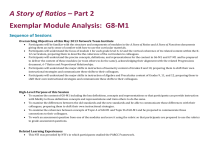 A Story of Ratios – Part 2 Exemplar Module Analysis: G8-M1 Sequence of Sessions Overarching Objectives of this May 2013 Network Team Institute Participants will be familiar with the structure and components of modules in the A Story of Ratios and A Story of Functions documents giving them an early sense of comfort with how to use the curricular materials. Participants will understand the focus of module 1 for each grade level 6-12 and the vertical coherence of its related content within the K12 curriculum, preparing them to describe the coherence of the curriculum to colleagues. Participants will understand the precise concepts, definitions, and representations for the content in G6-M1 and G7-M1 and be prepared to deliver the content of these modules (or train others to do the same), acknowledging their alignment with the related Progressions document, 6-7 Ratios and Proportional Relationships. Participants will understand the major shifts in instruction of Geometry content of Grades 8 and 10, preparing them to shift their own instructional strategies and communicate these shifts to their colleagues. Participants will understand the major shifts in instruction of Algebra and Precalculus content of Grades 9, 11, and 12, preparing them to shift their own instructional strategies and communicate these shifts to their colleagues. High-Level Purpose of this Session To examine the content of G8-M1 including the key definitions, concepts and representations so that participants can provide instruction with fidelity to those definitions concepts and representations and train others to do the same. To examine the differences between the old standards and the new standards and be able to communicate those differences with their colleagues, preparing them to shift their own instructional strategies. To examine the coherence between concepts of Topic A of G8-M1 and Topic B of G8-M1 and be prepared to communicate those connections to their colleagues. To work an assessment question from one of the modules and score it using the rubric so that participants are prepared to use the rubrics to grade assessment questions. Related Learning Experiences This NTI was preceded by NTI’s in which participants studied the PARCC Framework. This NTI was preceded by NTI’s in which participants studied the PARCC Model Content Framework for Grades 3-11 This Exemplar Module Analysis was preceded by a similar session on G6-M1 and G7-M1. This Exemplar Module Analysis will be followed by similar sessions on G9-M1, G10-M1, G11-M1 and G12-M1 Key Points A precise definition of x^n, plays a critical role in leading students to understand the laws of integer exponents. Guided student discovery and classroom discussions play a critical role in students ability to develop a logical progression of statements. Session Outcomes What do we want participants to be able to do as a result of this session? How will we know that they are able to do this? Be familiar with the content of Grade 8 Module 1. Understand the differences between the old standards and the new standards. Know the relationship between the concepts in Topic A, properties of integer exponents, and Topic B, scientific notation. Know how to use the provided rubrics to grade assessment questions. Participants will speak with their colleagues regarding these important take-aways. Session Overview Section Time Session Introduction 11:20-11:23 Review session objectives • 11:23-12:00 Examine Module 1 Review and discuss scientific notations and integer exponents Session PowerPoint G8-M1 Module Overview and Assessments 12:00-12:15 Complete a Module 1 Assessment item and score it with the rubric Session PowerPoint G8-M1 Module Overview and Assessments Module Analysis Overview Prepared Resources Facilitator Preparation • Review session notes and PowerPoint presentation • Review session notes and PowerPoint presentation Review Module Overview and Assessments Session PowerPoint • Assessment and Closure Review session notes and PowerPoint presentation Review Module Overview and Assessments Session Roadmap 11:20-12:15 Section: Session Introduction Time: 11:20-11:23 [3 minutes] In this section, you will… • Review the focus of this session Materials used include: • Session PowerPoint Time Slide #/ Pic of Slide Script/ Activity directions GROUP 1 min. Slide 1 Welcome and introduction. Grade band 6-8 2 min. Slide 2 Here are our objectives for today: (Click to advance first 2 bullets) The first thing we want you to be comfortable with is Module 1 in general, but specifically the differences between what you’ve seen/experienced before and what is expected now. These differences will be noted immediately in the slides that follow. (Click to advance 3rd bullet) The relationship between Topic A and B will be seen by looking at an application problem from Topic B (scientific notation) and how students will be prepared to deal with the problem with skills learned in Topic A (integer exponents). (Click to advance 4th bullet) Finally, participants will actually complete an assessment item and practice scoring it using the rubric. Section: Module Analysis Time: 11:23-12:00 [37 minutes] In this section, you will… Explore Module 1 and note differences between past practices and new ones Examine the relationship between integer exponents and scientific notation Materials used include: Session PowerPoint G8-M1 Module Overview and Assessments Time Slide #/ Pic of Slide Script/ Activity directions 4 min. Slide 3 One quick note as we get started: the title of the module was modified since the last release of the A Story of Ratios Curriculum Overview – it was formerly “The Number System and Properties of Exponents”; now it is “Integer Exponents and Scientific Notation” Module 1 is all about learning the properties of integer exponents and applying those rules to perform operations on numbers written in scientific notation. The preparation students have had with respect 