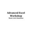 Advanced Excel Workshop Monte Carlo Simulation Page 1 Contents Monte Carlo Simulation Tutorial .................................................................................................................... 2 Example 1: New Marketing Campaign ..................................................................................................... 2 VLOOKUP ............................................................................................................................................................. 5 Example 2: Revenue Forecast ..................................................................................................................... 6 Pivot Table ............................................................................................................................................................... 8 Macros ....................................................................................................................................................................... 9 Regression Analysis .......................................................................................................................................... 10 Important Formulas: ........................................................................................................................................ 11 Contact Information Scott Bardwell smbard@bu.edu Page 2 Monte Carlo Simulation Tutorial The Monte Carlo Simulation derives its name from the Monte Carlo Casinos. The same gamble that you would take in the casino is used as a way to determine possible outcomes of varying scenarios. Only with the Monte Carlo Simulation, you can make thousands of gambles to calculate varying statistical data for scenarios such as rate of return on your investments, potential product demand, revenue growth, or yield to maturity. In this tutorial, we will use the simulation to calculate the outcomes of two different scenarios: revenue forecasts, and the expected net present value of a marketing campaign. Example 1: New Marketing Campaign Suppose your firm is figuring out whether or not to spend $400,000 on a new marketing campaign. The campaign is expected to bring in extra revenue over a five-year period. The first year will bring in an extra $100,000, while the year after that will bring in the prior year’s $100,000 plus 10% growth with a standard deviation of 0.1. Each year after that will add a 10% growth with a standard deviation of 0.1 to prior year’s campaign revenue number. What is the NPV (net present value) of the marketing campaign if the firm has a discount rate of 12%? Should you accept the campaign? Steps: 1. The information above is organized in the Excel document. Open the worksheet titled “New Marketing Campaign.” a. Cells C9 through F9 show how to calculate the growth rate. b. Cells C10 through F10 show how to calculate the expected revenue from the campaign year after year. 2. Monte Carlo Simulations rely on the Excel function RAND() to calculate expected sales growth. a. This function produces a random number between 0 and 1 each time you press the keystroke F9 (recalculate). b. For this exercise, we will use the function NORMSINV(RAND()), which returns a random z-score with a normal distribution. 3. The formula for the expected growth rate is: growth rate + [ standard deviation * NORMSINV(RAND()) ]. Page 3 a. Multiplying NORMSINV(RAND()) with the standard deviation returns a random increase or decrease in the growth rate of the standard deviation. b. In this exercise, the growth rate is 10%, and can be found in cell B4. The standard deviation (σ = 0.1) is in cell B5. Our formula is : = 10% + [0.1*NORMSINV(RAND())] c. In Cell C9, insert the formula: =$B$4+$B$5*NORMSINV(RAND()) i. Using the bottom right corner of cell C9, drag to the right until cell F9. You now have an expected growth rate for each year. The rate will change each time you press recalculate (F9). 4. We will use the expected growth rate to obtain the expected revenue for each year. To do this, multiply the prior year’s revenue (assume the first year has a guaranteed $100,000 in revenue) by the calculated growth rate. a. In cell C10 insert the formula: =B10*(1+C9) b. Using the bottom right corner of cell C10, drag to the right until cell F10. You now have an expected amount of revenue for each year. The expected amount of revenue will change each time you press recalculate (F9). 5. The next step is to calculate the NPV of our expected revenue stream. a. Use the =NPV formula in cell C13 to input the discount rate and the revenue stream. We must also subtract the cost of the campaign in cell B2. b. The formula is: =-B2+NPV(B3,B10:F10) c. We now have an NPV of the project that will change each time we press recalculate (F9) 6. Looking at a larger number of the randomized NPVs will give us a better idea of the bigger picture. We can do this by using data tables. a. First, we need to label the number of data points we will use. Enter the number “1” into cell A14. i. From the HOME tab, press the Fill button on the right. ii. Select the Series… option. iii. Select Columns and make the stop value 500. Press OK. iv. You should now see a descending list of the numbers 1-500. b. Highlight cells A13:B513. Page 4 i. From the DATA tab, click What-If Analysis, and select Data Table. ii. Leave the Row input cell blank. For the Column input cell, pick a cell that is empty and will remain empty. For this exercise, pick cell B1. Press OK. iii. You should now see 500 corresponding NPVs that change each time you press recalculate (F9). 7. Use the Data Analysis tool to determine statistics such as the Mean, Standard Error, Median, Standard Deviation, and Range. a. From the DATA tab, click Data Analysis and scroll to Descriptive Statistics and press OK. b. Highlight cells B14:B23 as the input range. Check the box Summary Statistics and press OK. i. You now have descriptive statistics for those 10 data points. However