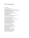 Bruce Springsteen Spirit in the Night The night was dark. The moon was young. And leaves came tumbling down. Crazy Janey and her mission man were back in the alley trading hands. Along came Wild Billy with his friend G-man, all duded up for Saturday night. Well Billy slammed on his coaster brakes and said, "Anybody wanna go on up to Greasy Lake? It's about a mile down on the dark side of route eighty-eight. I got a bottle of Rosé so let's try it. We'll pick up Hazy Davy and Killer Joe and I'll take you all out to where the gypsy angels go. They're built like light, and they dance like spirits in the night. Oh, you don't know what they can do to you, spirits in the night. Stand right up now and let them shoot through you." Well now Wild young Billy was a crazy cat, and he shook some dust out of his coonskin cap. He said, "Trust some of this; it'll show you where you're at, or at least it'll help you really feel it." By the time we made it up to Greasy Lake, I had my head out the window and Janey's fingers were in the cake. I think I really dug her `cause I was too loose to fake. I said, "I'm hurt." She said, "Honey, let me heal it." And we danced all night to a soul fairy band, and she kissed me just right, like only a lonely angel can. She felt so nice, just as soft as a spirit in the night. Janey don't know what she do to you. Stand right up and let her shoot through me. Now the night was bright and the stars threw light on Billy and Davy dancing in the moonlight. They were down near the water in a stone mud fight. Killer Joe gone passed out on the lawn. Well now, Hazy Davy got really hurt; he ran into the lake in just his socks and a shirt. Me and Crazy Janey was making love in the dirt, singing our birthday songs. Janey said it was time to go, so we closed our eyes and said goodbye to gypsy angel row. Felt so right. Together we moved like spirits in the night, all night. Baby, don't know what they can do to you. Stand right up and let it shoot right through you. 4th of July, Asbury Park (Sandy) Sandy, the fireworks are hailing over Little Eden tonight, forcing a light into all those stoned-out faces left stranded on this Fourth of July. Down town the circuit's full with switchblade lovers so fast so shiny so sharp. And the wizards play down on Pinball Way, on the boardwalk way past dark, and the boys from the casino dance with their shirts open like Latin lovers along the shore, chasing all them silly New York girls. Sandy, the aurora is rising behind us. The pier lights our carnival life forever. Love me tonight, for I may never see you again. Now the greasers tramp the streets, or get busted for trying to sleep on the beach all night. Them boys in their spiked high heels, ah, Sandy, their skins are so white. And me, I just got tired of hanging in them dusty arcades, banging them pleasure machines, chasing the factory girls underneath the boardwalk, where they promise to unsnap their jeans. And you know that tilt-a-whirl down on the south beach drag, I got on it last night and my shirt got caught, and that Joey kept me spinning—I didn't think I'd ever get off. Oh Sandy, the aurora is rising behind us. The pier lights our carnival life on the water. Running down the beach at night with my boss's daughter; well he ain't my boss no more, Sandy. Sandy, the angels have lost our desire for us. I spoke to them just last night, and they said they won't set themselves on fire for us anymore. Every summer when the weather gets hot, they ride that road down from heaven, on their Harleys they come and they go. And you can see them dressed like stars, in all the cheap little seashore bars, parked, making love with their babies, out on the Kokomo. Well the cops finally busted Madame Marie for telling fortunes better than they do. This boardwalk life for me is through. You know you ought to quit this scene too. Sandy the aurora's rising behind us, the pier lights our carnival life forever. Oh love me tonight, and I promise I'll love you forever. 2 Lost in the Flood The ragamuffin Gunner is returning home like a hungry runaway. He walks through town all alone. "He must be from the fort," he hears the high school girls say. His countryside's burning with wolfman fairies dressed in drag for homicide. The hit and run plead sanctuary, beneath a holy stone they hide. They're breaking beams and crosses with a spastic's reelin' perfection. Nuns run bald through Vatican halls, pregnant, pleading immaculate conception. And everybody's wrecked on Main Street from drinking unholy blood. Sticker smiles sweet as Gunner breathes deep, his ankles caked in mud. And I said, "Hey Gunner man, that's quicksand, that's quicksand, that ain't mud. Have you thrown your senses to the war or did you lose them in the flood?" That pure American brother, dull-eyed and empty-faced, Races Sundays in Jersey in a Chevy, stock super eight. He rides `er low on the hip. On the side he's got Bound For Glory in red, white and blue flash paint. He leans on the hood telling racing stories; the kids call him Jimmy The Saint. Well the blaze and noise boy, he's gunning that bitch loaded to blasting point. He rides head first into a hurricane and disappears into a point. And there's nothing left but some blood where the body fell. That is, nothing left that you could sell. Just junk all across the horizon, a real highwayman's farewell. And he said, "Hey kid, you think that's oil? Man, that ain't oil—that's blood." I wonder what he was thinking when he hit that storm, Or was he just lost in the flood? Eighth Avenue sailors in satin shirts whisper in the air. Some storefront incarnation of Maria, she's puttin' on me the stare. And Bronx's best apostle stands with his hand on his own hardware. Everything stops, you hear five quick shots; the cops come up for air, And now the whiz-bang gang from uptown, they're shootin' up the street. And that cat from the Bronx starts letting loose but he gets blown right off his feet. And some kid comes bl