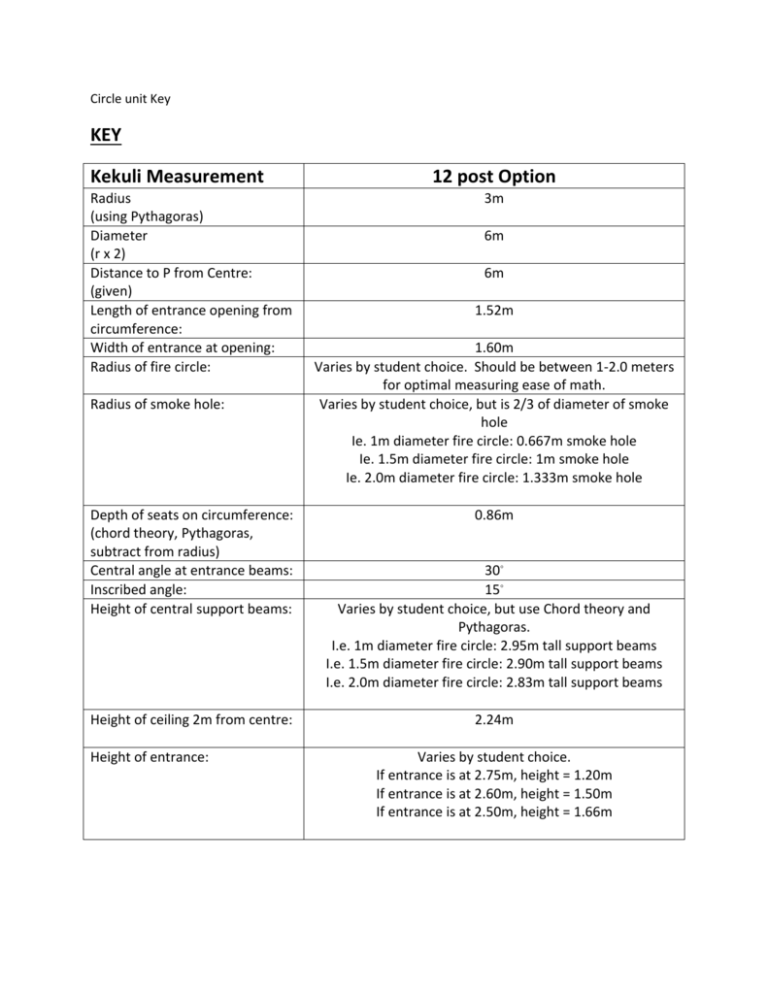 Circle unit Key KEY Kekuli Measurement Radius (using Pythagoras) Diameter (r x 2) Distance to P from Centre: (given) Length of entrance opening from circumference: Width of entrance at opening: Radius of fire circle: Radius of smoke hole: Depth of seats on circumference: (chord theory, Pythagoras, subtract from radius) Central angle at entrance beams: Inscribed angle: Height of central support beams: Height of ceiling 2m from centre: Height of entrance: 12 post Option 3m 6m 6m 1.52m 1.60m Varies by student choice. Should be between 1-2.0 meters for optimal measuring ease of math. Varies by student choice, but is 2/3 of diameter of smoke hole Ie. 1m diameter fire circle: 0.667m smoke hole Ie. 1.5m diameter fire circle: 1m smoke hole Ie. 2.0m diameter fire circle: 1.333m smoke hole 0.86m 30◦ 15◦ Varies by student choice, but use Chord theory and Pythagoras. I.e. 1m diameter fire circle: 2.95m tall support beams I.e. 1.5m diameter fire circle: 2.90m tall support beams I.e. 2.0m diameter fire circle: 2.83m tall support beams 2.24m Varies by student choice. If entrance is at 2.75m, height = 1.20m If entrance is at 2.60m, height = 1.50m If entrance is at 2.50m, height = 1.66m