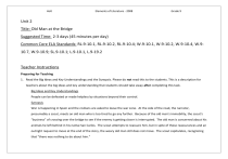 Holt Elements of Literature - 2008 Grade 9 Unit 2 Title: Old Man at the Bridge Suggested Time: 2-3 days (45 minutes per day) Common Core ELA Standards: RL.9-10.1, RL.9-10.2, RL.9-10.4; W.9-10.1, W.9-10.2, W.9-10.4, W.910.7, W.9-10.9; SL.9-10.1; L.9-10.1, L.9-19.2 Teacher Instructions Preparing for Teaching 1. Read the Big Ideas and Key Understandings and the Synopsis. Please do not read this to the students. This is a description for teachers about the big ideas and key understanding that students should take away after completing this task. Big Ideas and Key Understandings People can be defeated or made helpless by situations beyond their control. Synopsis War is happening in Spain and the civilians are asked to leave the war zone. At the side of the road, the narrator, presumably a scout, meets an old man who is too tired to go any further. Because of the old man’s immobility, the scout’s “business” of crossing over the bridge to see if the enemy is getting closer is interrupted. The old man is concerned about his animals he left behind in his native San Carlos. The scout attempts to reassure him, but in spite of these reassurances and an outright request to move at the end of the story, the weary old man still does not move. The scout capitulates, recognizing that “there was nothing to do about him.” Holt Elements of Literature - 2008 Grade 9 2. Read the entire selection, keeping in mind the Big Ideas and Key Understandings 3. Re-read the text while noting the stopping points for the Text Dependent Questions and teaching Tier II/academic vocabulary. During Teaching 1. Students read the entire selection independently. 2. Teacher reads the text aloud while students follow along or students take turns reading aloud to each other. Depending on the text length and student need, the teacher may choose to read the full text or a passage aloud. For a particularly complex text, the teacher may choose to reverse the order of steps 1 and 2. 3. Students and teacher re-read the text while stopping to respond to and discuss the questions, continually returning to the text. A variety of methods can be used to structure the reading and discussion (i.e., whole class discussion, think-pair-share, independent written response, group work, etc.) Text Dependent Questions Text Dependent Question Who is crossing the bridge? Why are they traveling? Cite evidence from the text to support your answers. p. 162 In the first paragraph of the story, why does the old man sit there “without moving”? p. 162 What is the narrator’s business? How did the old man’s problem affect the narrator’s “business”? p. 162 Evidence-Based Answers “Carts, trucks, and men, women, and children were crossing it.” Soldiers helped push the carts “up the steep bank.” The people are getting out of harm’s way. They are traveling to escape warfare. He is a weary traveler, “too tired to go any further.” The narrator’s business is to see how far the enemy has advanced. The narrator indicates that he “did this and returned over the bridge.” The fact that the old man won’t move delays his responsibility to cross the bridge as regularly as he should While conversing with the old man, he constantly looks back to Holt Elements of Literature - 2008 Describe the old man’s clothing. What was the old man’s occupation in San Carlos? What is the narrator’s initial response to the man’s clothing? p. 162 What was the author’s purpose in repeating “The Old man was still there” three times in the story? p. 162-3 What does the author mean by “that ever mysterious event called contact”? Why does the author state, “and the old man still sat there”? p. 163 What explanation did the old man provide about why he left San Carlos? What concern does he have about some of the animals he left behind? p. 163 What does the old man mean when he states, “I am without politics”? Why does the old man mention his age? p. 163 Describe the tone in the beginning of the story and at the end of the story. How does the tone shift and what causes that shift? p. 162-4 Grade 9 determine enemy advancement. He was also listening for noises that would suggest enemy contact. He looked and listened while engaging in conversation with the old man as opposed to crossing the bridge at this point. The old man wore black clothes and steel rimmed glasses. The old man took care of animals. According to the narrator, “he did not look like a shepherd or a herdsman” or a person who took care of animals. This repetition builds up tension experienced by the reader and the narrator, brought on by the old man’s immobility and the narrator’s need to complete his job. The repetition also draws attention to the futility of the old man’s situation. In this story “contact” means “enemy sighting or attack.” It is only a matter of time before the narrator hears the sounds that signal that the enemy has been spotted or has attacked, but even with this impending and unpredictable contact, the old man has not moved. The old man’s refusal to move suggests his sense of helplessness or the futility of moving in the face of the advancing enemy. He was forced to leave his home because of impending attacks by artillery. The old man is concerned that the animals may not escape the artillery when he “was told to leave because of the artillery.” He means that he doesn’t have political ties or affiliations. He is neutral. He mentions his age because he believes he is too old to be walking as far as he has to escape war started by politics. At the beginning of the story, the tone is one of patience and reassurance as the narrator engages the old man in conversation, assuring him that most of his animals will be fine, offering him alternative routes to leave dangerous territory, Holt Elements of Literature - 2008 Why does the narrator note that the old man spoke “dully, but no longer to me”? p. 164 What does the narrator me