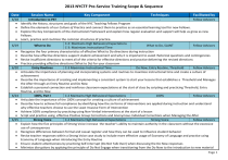 2013 NYCTF Pre-Service Training Scope & Sequence Date Session Name Key Component Techniques Facilitated by 6/18 Introduction to PST Fellow Advisors Identify the history, structures and goals of the NYC Teaching Fellows Program Define the elements of our Culture of Practice and connect them to practice as an essential learning tool for new Fellows. Explore the Key Components of the Instructional Framework and explain how regular evaluation and support will help us grow as new Fellows. Learn, practice and routinize the common structures of practice. C-2: Maintains High Behavioral Expectations 6/19 What to Do What to Do, SLANT Fellow Advisors C-3: Maximizes Instructional Time Recognize the four primary characteristics of effective What to Do directions during instruction Describe how effective directions support student achievement and why it is important to avoid rhetorical questions and contingencies Revise insufficient directions to meet all of the criteria for effective directions and practice delivering the revised directions Practice providing effective directions (What to Do) for your classroom 6/20 Entry Routines C-3 Maximizes Instructional Time Do Now, Entry Routine, Threshold Fellow Advisors Articulate the importance of planning and incorporating systems and routines to maximize instructional time and create a culture of achievement Describe the importance of creating and implementing a consistent system to start your lessons that establishes a Threshold and Manages the After through an Entry Routine and Do Now Establish a personal connection and reinforce classroom expectations at the start of class by scripting and practicing Threshold, Entry Routine, and Do Now 6/24 100%, Part I C-2 Maintains High Behavioral Expectations 100% Fellow Advisors Articulate the importance of the 100% concept for creating a culture of achievement Describe how to achieve full compliance by identifying how the six forms of interventions are applied during instruction and understand why effective teachers choose to use the Least Invasive Form of Intervention Achieve 100% compliance by practicing using Non-Verbal interventions at the start of a lesson Script and practice using effective Positive Group Corrections and Anonymous Individual Corrections when Managing the After 6/25 Strong Voice C-2 Maintains High Behavioral Expectations Strong Voice Fellow Advisors Explain how the five principles of Strong Voice increase the teacher’s ability to maintain authority in the classroom without the excessive use of consequences Recognize differences between formal and casual register and how they can be used to influence student behavior Revise teacher responses within a Strong Voice case study to include more effective usage of Economy of Language and practice using Economy of Language when introducing the Entry Routine Ensure student attentiveness by practicing Self-Interrupt (Do Not Talk Over) when discussing the Do Now responses Minimize disruptions by applying the principle of Do Not Engage when transitioning from the Do Now to the introduction to new material Page 1 2013 NYCTF Pre-Service Training Scope & Sequence Date 6/26 6/27 7/1 7/1 7/1 7/2 7/2 7/2 Session Name Key Component Techniques Facilitated by Positive Framing, Part I C-2 Maintains High Behavioral Expectations Positive Framing, Strong Voice Fellow Advisors Describe how Positive Framing provides a way for teachers to effectively correct and guide behavior Plan and practice Live in the Now behavioral statements Practice Assuming the Best when a student walks in late to class and forgets to pick up the Do Now Tight Transitions, Part I C-3 Maximizes Instructional Time Tight Transitions Fellow Advisors Identify criteria for effective Tight Transitions and how they contribute to student learning Describe how to transform complex procedures into automated routines Script and practice at least three Tight Transitions to implement in the Field Experience classroom Field Experience I-1 Delivers Lessons; P-1 Planning & Coaches Expectations and Logistics Preparation Receive Field Experience placement information Analyze and practice Field Development structures to use over the summer Identify resources for improving content understanding prior to lesson planning and delivery Review lesson planning submission expectations and deadlines Begin with the End, Part I P-1 Planning & Preparation Begin with the End Coaches Review the principles of Begin with the End and backwards planning and discuss why this approach supports student achievement Build on Enrollment pre-work to create a shared vision for student success during Field Experience Observe how teachers use the Common Core and state standards to establish appropriate grade level expectations for students 100%, Part II C-2 Maintains High Behavioral Expectations 100% Fellow Advisors Describe the characteristics of Private Individual Corrections and Lightning-Quick Public Corrections Achieve 100% compliance by practicing using Private Individual Corrections and Lightning-Quick Public Corrections during the introduction to new material Team Building Coaches Learn to work together as a team Develop a mutual sense of trust and support Learn about each member of their team Begin with the End, Part II P-1 Planning & Preparation Begin with the End, 4Ms Coaches Observe how a teacher breaks down a standard into discrete learning goals for students Observe how a teacher writes 4M objectives Analyze summer school objectives using the 4M criteria Practice revising and/or writing 4M objectives Tight Transitions, Part II C-2 Maintains High Behavioral Expectations Tight Transitions, Do it Again, Positive Fellow Advisors Page 2 2013 NYCTF Pre-Service Training Scope & Sequence Date Session Name Key Component Techniques Facilitated by Framing Describe why Do it Again is an effective technique for maintaining high behavioral expectations and how it can be effectively used to reinforce procedures and routines Revise a Tight Tr