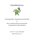 ChemDetectives Chromatography: Separating Good from Bad Or How to Find the Source of Insecticide Contamination Using Chemistry Erin “Dr. E” Nyren, PhD, MBA HQC Biosciences, Inc. Age level: 13-16 years of age Learning Objectives: By the end of this lesson, students will be able to: Describe the concept of solubility Define and describe the words analyte, chromatography, mobile phase, stationary phase, and retention factor Explain how differences in solubility may be used to separate chemical components (i.e.—individual compounds that are part of a complex mixture) in an analyte. Give other examples of differences that may exist between chemical components within analytes which may be used to separate them Explain what a standard is, and the importance of using standards in a chromatography experiment Perform thin layer chromatography with good separation of individual chemical components within the analyte(s). Quantify results of thin layer chromatography by measuring retention factor (Rf) values of the different chemical components. Describe reasons why one would wish to separate chemical compounds in an analyte. Prepare a written report describing the procedures and outcomes of the experiment. Key Concepts: Some materials are composed of multiple chemical components that may have different properties (solubility, size, charge). We can separate chemical components in a solution based on solubility, size, and/or charge. ©2014 HQC Biosciences, Inc. www.hqcbio.com Page 2 What’s Worrying the Doctors in Farmington? Monday morning, 8:00 am, the door shuts softly behind you as you enter your office. As the lead chemist for the state lab in Farmington, you have a busy day ahead of you—there is already a message on your answering machine (this is unusual so early on a Monday morning). The message is from Dan at the local police department, and he says it’s urgent that you return his call; he has a large volume of samples for your lab to test, and they must be given high priority. This is a serious concern—you are already very busy, and wonder what could possibly make the samples so urgent. When you return Dan’s call, he explains that a doctor from Children’s Medical Center contacted him about a month ago with some serious concerns. He has been carefully monitoring the number of birth defects in babies born in Farmington over the last ten years, and in the past two years he has noticed that the number has jumped from one child out of 33 (the typical national average1) to one child out of 10. None of the families concerned have had any known contact with any chemicals known to cause birth defects, such as drugs or alcohol, so there is no immediate explanation for the increase. This is not only devastating to the families involved; it is frightening the entire community! You ask Dan if he has any thoughts as to what could be causing such a rise in birth defects in Farmington. Dan says he thinks he does. Recently there have been rumors circulating around Farmington about one of the local farmers hiring an obscure crop duster to spray his crops with insecticide. The pilot claimed to be a fully registered and licensed crop dusting business, and was offering crop dusting services at a fraction of his competitors’ prices, but he was later investigated for not having proper documentation. When asked what he uses on his clients’ crops, he claimed he used INV-80, a common insecticide used by most of the farmers in the area. However, operators of other crop dusting businesses in the area all suspect he is actually using QU-10, an inexpensive and extremely effective insecticide that has been banned in the US. The name QU-10 is very familiar to you; you were part of a research team that studied the long term effects of QU-10, and you immediately recall that your research team concluded QU-10 causes birth defects—the same type of birth defects currently on the rise in Farmington! Dan goes on to say that when the suspected crop duster was brought in for questioning, he firmly denied ever using QU-10, but thought that some of his competitors might. Because the use of QU-10 is suspected, and because it could put the whole town of Farmington at risk, Dan was authorized to collect several soil samples from every farm in the area—60 samples in all. He says you should expect to receive them today. A few hours later you receive a large box containing 60 samples of local soil. You soak each one in a mixture of alcohol and water to extract any pesticides, and remove any leftover rocks and large pieces. Now you have 60 samples to test for the presence of QU-10. Knowing that 1 According to the Centers for Disease Control and Prevention, www.cdc.gov ©2014 HQC Biosciences, Inc. www.hqcbio.com Page 3 QU-10 has no color, no odor, and is nearly indistinguishable from other insecticides used in the area, you know you will need to use chemistry to find out if someone is using it, and potentially poisoning the people of Farmington. How Do We Use Chemistry to Catch the Culprit? While we know that QU-10 looks just like any other safe insecticide, we also know that it is chemically different from most other insecticides used in Farmington. Because its properties are different from other insecticides, we can use some simple chemical analysis techniques to see which soil samples (if any) contain QU-10. Chemical Compounds Can Be Separated Based on Their Chemical or Physical Differences You now have alcohol-based extracts of soils from all the surrounding farms to investigate. These extracts are your analytes, the materials you are going to analyze. To separate the different chemical compounds in these analytes, we need to think about how they might be different from each other. Some differences that may exist between the different compounds are: Differences in solubility—that is, their tendency to be dissolved in water or oil. This depends on whether the compounds are more hydrophilic (water loving) or more