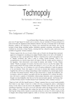 Philosophical Investigations 2011 – 12. Technopoly The Surrender of Culture to Technology Alfred A. Knopf New York 1993 Pages 3 to 20 The Judgment of Thamus’ You will find in Plato's Phaedrus a story about Thamus, the king of a great city of Upper Egypt. For people such as ourselves, who are inclined (in Thoreau's phrase) to be tools of our tools, few legends are more instructive than his. The story, as Socrates tells it to his friend Phaedrus, unfolds in the following way: Thamus once entertained the god Theuth, who was the inventor of many things, including number, calculation, geometry, astronomy, and writing. Theuth exhibited his inventions to King Thamus, claiming that they should be made widely known and available to Egyptians. Socrates continues: Thamus inquired into the use of each of them, and as Theuth went through them expressed approval or disapproval, according as he judged Theuth's claims to be well or ill founded. It would take too long to go through all that Thamus is reported to have said for and against each of Theuth's inventions. But when it came to writing, Theuth declared, "Here is an accomplishment, my lord the King which will improve both the wisdom and the memory of the Egyptians. I have discovered a sure receipt for memory and wisdom." To this, Thamus replied, "Theuth, my paragon of inventors, the discoverer of an art is not the best judge of the good or harm which will accrue to those who practice it. So it is in this; you, who are the father of writing, have out of fondness for your off-spring attributed to it quite the opposite of its real function. Those who acquire it will cease to exercise their memory and become forgetful; they will rely on writing to bring things to their remembrance by external signs instead of by their own internal resources. What you have discovered is a receipt for recollection, not for memory. And as for wisdom, your pupils will have the reputation for it without the reality: they will receive a quantity of information without proper instruction, and in consequence be thought very knowledgeable when they are for the most part quite ignorant. And because they are filled with the conceit of wisdom instead of real wisdom they will be a burden to society."* I begin my book with this legend because in Thamus' response there are several sound principles from which we may begin to learn how to think with wise circumspection about a technological society. In fact, there is even one error in the judgment of Thamus, from which we may also learn something of importance. The error is not in his claim that writing will damage memory and create false wisdom. It is demonstrable that writing has had such an effect. Thamus' error is in his believing that writing will be a burden to society and nothing but a burden. For all his wisdom, he fails to imagine what writing's benefits might be, which, as we know, have been considerable. We may Document1 11/06/2012 Page 1 of 10 Philosophical Investigations 2011 – 12. learn from this that it is a mistake to suppose that any technological innovation has a one-sided effect. Every technology is both a burden and a blessing; not either-or, but this-and-that. Nothing could be more obvious, of course, especially to those who have given more than two minutes of thought to the matter. Nonetheless, we are currently surrounded by throngs of zealous Theuths, one-eyed prophets who see only what new technologies can do and are incapable of imagining what they will undo. We might call such people Technophiles. They gaze on technology as a lover does on his beloved, seeing it as without blemish and entertaining no apprehension for the future. They are therefore dangerous and are to be approached cautiously. On the other hand, some one-eyed prophets, such as I (or so I am accused), are inclined to speak only of burdens (in the manner of Thamus) and are silent about the opportunities that new technologies make possible. The Technophiles must speak for themselves, and do so all over the place. My defense is that a dissenting voice is sometimes needed to moderate the din made by the enthusiastic multitudes. If one is to err, it is better to err on the side of Thamusian skepticism. But it is an error nonetheless. And I might note that, with the exception of his judgment on writing, Thamus does not repeat this error. You might notice on rereading the legend that he gives arguments for and against each of Theuth's inventions. For it is inescapable that every culture must negotiate with technology, whether it does so intelligently or not. A bargain is struck in which technology giveth and technology taketh away. The wise know this well, and are rarely impressed by dramatic technological changes, and never overjoyed. Here, for example, is Freud on the matter, from his doleful Civilization and Its Discontents: One would like to ask: is there, then, no positive gain in pleasure, no unequivocal increase in my feeling of happiness, if I can, as often as I please, hear the voice of a child of mine who is living hundreds of miles away or if I can learn in the shortest possible time after a friend has reached his destination that he has come through the long and difficult voyage unharmed? Does it mean nothing that medicine has succeeded in enormously reducing infant mortality and the danger of infection for women in childbirth, and, indeed, in considerably lengthening the average life of a civilized man? Freud knew full well that technical and scientific advances are not to be taken lightly, which is why he begins this passage by acknowledging them. But he ends it by reminding us of what they have undone: If there had been no railway to conquer distances, my child would never have left his native town and I should need no telephone to hear his voice; if travelling across the ocean by ship had not been introduced, my friend would not have embarked on his sea-voyage and I should not need a cable to relieve my anxiety about him. What i