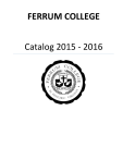 FERRUM COLLEGE Catalog 2015 - 2016 2 An Invitation Students, parents, alumni and friends are cordially invited to visit the campus. Visitors should come to Welcome Center located at 10021 Franklin Street (see map, inside back cover) for information and assistance. For further information, please visit our website at www.ferrum.edu or contact the college at (540) 365-2121/Toll Free: 1-800-868-9797. The Admissions Office, located in Spilman-Daniel house (see map, inside back cover) welcomes prospective students and their families. Admissions staff are available from 9:00 a.m. – 4:00 p.m. weekdays and by appointment, from 9 a.m. to noon on Saturdays during the academic year, except during holiday weekends. Admissions personnel are available other times by appointment. For further information or to schedule an admissions visit, please contact the Admissions Office, at (540)365-4290, 1-800-868-9797 Option 1, or admissions@ferrum.edu. Ferrum College does not discriminate on the basis of race, religion, color, national origin, age, veteran status, gender, sex, disability, or any other protected status in admission to, access to, treatment in or employment in its programs and activities. Ferrum College affirms the dignity and worth of every individual regardless of sexual orientation or gender identity and will not tolerate harassment or discrimination toward any individual. The following person has been designated to handle inquiries regarding the nondiscrimination policies: Director of Human Resources, 109 Ferrum Mountain Road, Ferrum College, P.O. Box 1000, Ferrum, VA, 24088-9000; (540) 365-4596. Inquiries concerning the application of nondiscrimination policies may also be referred to: Washington DC (Metro), Office for Civil Rights, U.S. Department of Education, 400 Maryland Avenue, SW, Washington, D.C. 20202-1475; Telephone:(202) 453-6020, Fax: (202)-453-6021, TDD; (800) 8778339. OCR encourages use of e-mail or fax to communicate with OCR whenever possible. Also, complainants may file a complaint with OCR online or by email: OCR.DC@ed.gov. Consumer Information The following is a partial list of consumer information available to all students upon request: campus security report; drug and alcohol prevention information; Family Education Rights and Privacy Act provisions; drug-free workplace information; athletic participation rates and financial support data; and completion of graduation rates and transfer-out rate for the general student body. In addition, the following financial assistance information is available upon request: information concerning financial aid programs; student eligibility requirements and criteria for selecting recipients; the rights and responsibilities of students receiving aid; cost-of-attendance information; a complete statement of the school’s refund policy including examples of the application of the refund policy; and information concerning the eligibility of students for financial aid funds for study-abroad programs approved for credit by Ferrum College. 3 Ferrum College Catalog 2015 - 2016 Ferrum College P.O. Box 1000 Ferrum, VA 24088-9000 (540) 365-2121 www.ferrum.edu 4 Accreditation Ferrum College is accredited by the Commission on Colleges of the Southern Association of Colleges and Schools Commission on Colleges (SACSCOC) to award baccalaureate degrees. Contact the Commission on Colleges at 1866 Southern Lane, Decatur, Georgia 30033-4097, or call 404-6794500, for questions about the accreditation of Ferrum College. Ferrum College is accredited by the University Senate of The United Methodist Church and is a member of the National Association of Schools and Colleges of the United Methodist Church. The social work program receives accreditation visits from its national professional organization, and the teacher education program is regularly evaluated and approved by the Department of Education of the Commonwealth of Virginia. Ferrum College also holds membership in: Appalachian College Association The College Board Council of Independent Colleges Council of Independent Colleges in Virginia Council on Undergraduate Research National Collegiate Athletics Association National Collegiate Honors Council The Virginia College Fund Mailing Address and Telephone Ferrum College, P.O. Box 1000, Ferrum, VA 24088-9000 (540) 365-2121 TDD# (540) 365-4614 website: http://www.ferrum.edu Please direct all questions relating to currently enrolled students to the Academic Resources Center: (540) 365-4529. 5 Table of Contents Academic Calendar 2015 - 2016 An Introduction to Ferrum College Campus Life and Services Admissions Special Admissions Categories Expenses and Financial Assistance Academic Policies Academic Opportunities Degree Requirements Majors Minors Certificate Programs Description of Courses Directory Administrative Staff Index 6 7 17 30 32 35 51 60 69 78 154 143 178 310 319 331 6 Academic Calendar 2015-2016 Fall Semester 2015 Classes begin Last Day to Add Classes Last Day to Drop “½ Semester” w/o Penalty (1st half) Last Day to Drop w/o Penalty Last Day of First “½ Semester” Classes Mid-term Grades Due Fall Break Classes resume First Day of Second “½ Semester” Classes Last Day to Add “½ Semester” Classes Last Day to Drop “½ Semester” w/o Penalty (2nd half) Last Day to Drop with a WP/WF Thanksgiving Break Classes resume Monday, December 7 Last day of classes Reading Day (English 101 Exams) Exam period Grades due Monday, August 31 Friday, September 4 Friday, September 11 Friday, September 25 Wednesday, October 14 Wednesday, October 14, 5 PM Thursday, October 15 – Sunday, October 18 Monday, October 19 Monday, October 19 Friday, October 23 Friday, October Tuesday, November 10 Saturday, November 21 – Sunday, November 29 (begins after last class Friday, November 20) Monday, November 30 Follow Friday’s Schedule Tuesday, December 8, Follow Thursday Schedule Wednesday, December 9 Thursday, December 10 – Monday December 14 Tuesday, Decembe