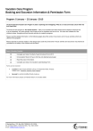 Vacation Care Program Booking and Excursion Information & Permission Form Program: 5 January – 23 January 2015 The Surf Coast Shire Vacation Care Program in 2015 is exploring and investigating: “What is our local/community culture within the Surf Coast Shire”. The theme for this program is “An Aussie Summer.” Many of our activities have been themed around aspects of what we love to do as Australians, our native animals, what it means to be an Australian and how we live. We have also collated all of the children’s ideas, thoughts and their favourite activities to create the program. Please read the detailed information on the following pages about the variety of excursions and in-house activities which are offered in this program. Please note that on extreme weather or fire danger days (code red), that some in-house activities and excursions may need to be cancelled for the safety of the children and educators. Our Parent /Guardian Checklist Complete and return the Early Years Enrolment Form 2015 Immunisation Record (If your child has not attended previously) Read Excursion Information Complete and return the Vacation Care Booking Form Forms can be returned: In person at the Torquay Children’s Hub, 27 Grossmans Road, Torquay. Please mark: “Attention: Vacation Care Program” By email to vacationcare@surfcoast.vic.gov.au For more information please call Tabitha Nelson on 03 5261 0599. 1 Merrijig Drive / P.O. Box 350, TORQUAY, VIC, 3228 Ph: 03 5261 0600 / 1300 610 600 / Fax: 5261 0525 Email: info@surfcoast.vic.gov.au Program Information – 5 January to 9 January (5-12 years old) Monday 5 January 2015 - In House Activities – EXPLORING OUR NEW ENVIRONMENT Today we welcome everyone to our new Vacation Care home, Surf Coast Secondary College. We will have a tour of the buildings and practice an emergency evacuation. You can contribute to our group mural, design and laminate your own table mat or make some noise with nail art. Sail away the afternoon as we create Fruit Boats in the kitchen. Additional information regarding in house activities: No extra cost for this in-house activity. Please ensure your child has a sun hat. Helmets are required when skate boarding or scooting and knee and elbow pads are highly recommended Educator (staff) ratio: 1-15. Tuesday 6 January 2015 – In House Activities - BUILD YOUR OWN MARBLE RUN AND DECORATE BOWLS AND VASES We have a new marble run experience for you this program – give it a go! Emily’s Art and Craft kicks off today with Marbling and the opportunity to showcase your creativity when decorating glass tea lights, porcelain bowls and vases. We will play a game of cricket in the afternoon and make sandwich pinwheels in the kitchen . Additional information regarding in house activities: No extra cost for this in-house activity. Please ensure your child has a sun hat. Helmets are required when skate boarding or scooting and knee and elbow pads are highly recommended. Educator (staff) ratio: 1-15. Wednesday 7 January 2015 – In House Activities - BUBBLE SNAKES AND SOCCER What are bubble snakes? Today you will find out! You can also choose to play board games or basketball, go skating or scooting, construct your own marble run or freestyle art. In the afternoon our volunteer cooks will prepare Rice Paper Rolls for everyone and our sport enthusiasts will participate in a soccer workshop, followed by a game. Additional information regarding the excursion: No extra cost for this in-house activity. Please ensure your child has a sun hat. Helmets are required when skate boarding or scooting and knee and elbow pads are highly recommended. Educator (staff) ratio: 1-15. Thursday 8 January 2015 - In House Activities - CREATE YOUR OWN MASK AND CRICKET GAME Today the children will be able to create their own mask with Emily. She will also assist them with Hessian hand sewing. For those that like to play outside we will have a game of cricket in the afternoon. We will put together a Snack Attack for the children to enjoy – yogurt, muesli and fruit cups. Additional information regarding in house activities: No extra cost for this in-house activity. Please provide your child with a sun hat. Helmets are required when skate boarding or scooting and knee and elbow pads are highly recommended. Educator (staff) ratio: 1-15 Friday 9 January 2015 – In house Activities - FRISBEE COMPETITION AND BUNNINGS Today is the day to practice your Frisbee skills. How far can your Frisbee go? Can you hit a target? Dot paintings will be the focus of today’s Art and Craft activities. Staff from Bunnings will be visiting today to help us make our very own trinket box which can then be painted or decorated. Over in the kitchen, the children will be grating and rolling to produce carrot, sultana and cheese balls. A new release movie will also be playing in the Theatre Room. Additional information regarding in house activities: No extra cost for this in-house activity. Please ensure your child has a sunhat. Helmets are required when skate boarding or scooting and knee and elbow pads are highly recommended. Educator (staff) ratio: 1-15 Program Information – 12 January to 16 January (5-12 years old) 1 Merrijig Drive / P.O. Box 350, TORQUAY, VIC, 3228 Ph: 03 5261 0600 / 1300 610 600 / Fax: 5261 0525 Email: info@surfcoast.vic.gov.au Monday 12 January 2015 - FIREWORKS AND SAND AND SALT PAINTINGS Come along today to see fireworks! Yes, colourful displays without the noise, on a slightly smaller scale. You can choose to play inside or out, challenge a friend to a game on the Wii or build your own marble run. We will show you how to create sand and salt paintings and our kitchen creations today should appeal to all – healthy fruit smoothies. In the afternoon the children can relax in the Theatre Room and watch a new release movie. Additional information regarding the in house activities: No extra cost for this in-house activity. Please ensure your child has a sun hat. Hel