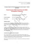 Manual of Operations and Procedures Version 4.0 02/27/2014 Appendix C: Pediatric Informed Consent Interagency Registry for Mechanically Assisted Circulatory Support – Pediatric (pediMACS) Parent Consent (Child Assent) Form for Child’s Participation in Research Sponsor: The National Heart, Lung, and Blood Institute (NHLBI) Contract #HHSN268201100025C Principal Investigator: (Insert local Principal Investigator) Phone number: (Insert local Principal Investigator phone number) INFORMED CONSENT You are/your child is being asked to take part in the Interagency Registry for Mechanically Assisted Circulatory Support for children (INTERMACS®-Pediatrics, or pediMACS) because you are/your child is receiving, or have/has received a mechanical circulatory support device (MCSD). A registry is a place where data, records, and sometimes laboratory samples are kept. This registry will collect and analyze clinical information from all pediatric patients receiving a MCSD that has been approved by the Food and Drug Administration (FDA). The broad purpose of the registry is to gather information to help understand and improve the lives of patients with advanced heart failure. YOUR/YOUR CHILD’S PARTICIPATION IS VOLUNTARY This is a consent/assent form. It gives you/your child information about the registry. You are/your child is free to ask questions about this registry at any time. If you agree to participate or have your child participate in this registry, you will be asked to sign this consent/assent form. The registry coordinator will make you a copy of this form to keep. Before you/your child learn about the registry, it is important that you know/your child knows the following: 1 Manual of Operations and Procedures Version 4.0 02/27/2014 Appendix C: Pediatric Informed Consent Your/your child’s participation is totally voluntary and will not affect your/your child’s care in any way. You/your child may decide not to take part or to leave the registry at any time without losing your/your child’s medical care benefits. WHAT IS THE PURPOSE OF THIS REGISTRY? Over the last 25 years, MCSDs have been developed to help the failing heart. In the last 10 years, many of these devices have been used in infants, children, and teenagers. MCSDs have been used successfully to support patients until they get a heart transplant. They have also been used as treatment until recovery as well as for permanent implantation (placement in the body) or "destination therapy". It is expected that the number of MCSD implantations will increase in future years. This registry will allow investigators to study patient characteristics, device function, implantation procedures, and the possible adverse events that can arise with MCSD placement. The registry will also be linked with other existing databases, such as the Scientific Registry of Transplant Recipients as well as the Pediatric Heart Transplant Study registry. This will allow us to understand how the MCSD affects outcome following transplant. WHAT DO I HAVE TO DO IF I AM/MY CHILD IS IN THIS REGISTRY? If you/your child decide(s) to take part in this study and sign the informed consent/assent, you/your child will: Allow research staff within the hospital to review your/your child’s medical chart for information on your/your child’s medical history and medications you have/your child has taken or may be currently taking. This information will be entered it into a confidential database. Allow research staff within the hospital to collect age appropriate quality of life questionnaires from you/your child, which will take approximately 20 minutes. Complete the parent quality of life questionnaire, which will take approximately 20 minutes. If you are/your child is 10 years of age or older, you/your child will allow staff to complete a limited functional capacity test (how far you/your child can walk in 6 minutes and how fast you/your child can walk 15 feet). The medical chart review and abstractions will be done: before implant, 1 week after implant, 1 month after implant, 3 months after implant, 6 months after implant and every 6 months after that for as long as the MCSD is in place. 2 Manual of Operations and Procedures Version 4.0 02/27/2014 Appendix C: Pediatric Informed Consent The brief quality of life questionnaires and walk tests will be done: before implant, 3 months after implant, 6 months after implant and every 6 months after that for as long as the MCSD is in place. If you or your child receives a heart transplant, your/your child’s “follow-up” will occur in the UNOS (United Network for Organ Sharing) transplant database. Your/your child’s registry data may be merged with transplant data and analyzed by registry investigators. If your/your child’s MCSD is removed and you have/your child has recovered, your/your child’s medical information will be followed for one more year after removal. HOW MANY PEOPLE WILL TAKE PART IN THIS REGISTRY? Over 10,000 people will take part in this registry, with more than 1,000 patients participating per year from 100 or more participating hospitals in the United States and Canada. HOW LONG WILL I/MY CHILD BE IN THIS REGISTRY? Participation in the registry begins when this consent/assent form is signed and continues for as long as you have/your child has a MCSD implanted. Following heart transplant or death, data collection will stop. If your/your child’s MCSD is removed due to recovery, your medical information will be collected for one more year. If you/your child transfer(s) to another institution that participates in this registry, you/your child may be asked to sign another consent/assent form (if the institution you transfer to requires Informed Consent/Assent for continued participation in the registry). You are/your child is free to leave the registry or withdraw consent/assent at any time, even after signing this consent/assent. If the hospital that implanted your/your child’s MCSD discontinues partici