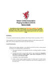 Nelson Cricket Association Playing Conditions 2013/14 Senior Grade Cancellations will be broadcast over Radio Nelson and More FM, usually starting after the 7.00am news bulletins and continuing regularly afterwards. Information will also be posted at nelsoncricket.org.nz as soon as it comes to hand. GENERAL. All matches conducted under the jurisdiction of the Nelson Cricket Association (‘NCA’). Unless specified, the New Zealand Cricket playing conditions for the current season will apply (NZC playing conditions provided for all clubs and teams). Ground Requirements. Where the local ratings authority is not directly involved, the club on whose ground the match is to be played shall be responsible for: a. The proper markings of the ground and pitch, including boundary markings and flags. b. Ensuring the ground is in good order and fit to play (covers are compulsory and must be used on Friday nights. Clubs will be informed by NCA if covers to be used Thursday night. c. Availability of serviceable amenities. d. Clubs to ensure Council contractors mark 27.5 metre and 13.72 metre circles for all one day and Twenty20 competitions and extend the popping crease to the inner circle. The home team shall ensure: e. Regulation stumps and bails are available and in good order. f. Lunch/Afternoon tea is provided for both teams. g. A scoreboard is provided. Where matches are played on neutral grounds, the team named first in the draw shall be considered the host team. In the event that any NCA final is to be played at a neutral venue then the team deemed to be top qualifier shall have first choice as to dressing rooms and other similar amenities. The home team shall ensure drinks are available at the appropriate times. Notification of teams. a. Before the toss in all matches, team captains shall nominate their respective players in writing and provide a team list to the umpires. b. In such two day matches, players that are not available for the second day’s play must be declared as such on the original team list before play commences on that day. Captains do not have to name replacement players. Any number of replacements may be made for the second day of a match. The player being replaced and his replacement shall be bona fide members of that club (and no other in New Zealand). The replacement player shall have full playing rights. However, both players may not bat in the same innings. In addition any player may be replaced due to exceptional circumstances such as family bereavement, injury or illness outside of each day’s playing hours. c. No player may be changed on the first day of the match, after the team nomination, without the consent of the opposing captain. d. No team shall have less than eight players or they will be required to default. The defaulting team shall be liable for any travel costs incurred by the winning team. e. At the conclusion of the match it is the captain’s responsibility to submit their umpires report via the NCA website no later than Tuesday 3pm. NO POINTS will be awarded to any team until it has provided their umpires report for the relevant fixture. f. If a senior team or its feeder team defaults during the competition the ‘NCA senior grade’; team is to be penalized two points in the competition. In addition, if the senior game is played no points may be gained by that senior team. In addition, club to be fined $150.00 (approximate ground fee charge for both teams for a senior club game). The toss. Captains shall toss for choice of innings on the field of play, not earlier than 30 minutes or later than 15 minutes before the scheduled (or rescheduled) start of play. Note: with the obvious exception of unfit conditions, where the start of any match is delayed through the fault of either team the time so lost shall be made up at the end of that day’s play if so desired by the non-offending team. The amount of time lost shall be agreed with and confirmed by the umpires before play commences. Cricket balls. Each team shall provide its own 4 piece, 156 gram club match or regulation cricket ball. Kookaburra balls only to be used. Fitness for play. a. In ruling on the fitness of the ground, weather and light for play, common sense must prevail at all times. b. Official umpires are the final arbiters of playing conditions as they relate to fitness for play, irrespective of the captains’ wishes. c. If no official umpires are present the captains must agree on any decision to start, continue or suspend play. If the captains cannot agree then the status quo shall continue to apply. Note: If at any time the condition of the ground, weather or light are so bad that there is an obvious and foreseeable risk to the safety of any player (batsman or fielder) or umpire, so that it would be unreasonable or dangerous for play to take place, play should be suspended immediately or not allowed to commence or to restart. The preamble, the spirit of cricket and captains’ responsibilities. 1. Responsibility of captains: the captains are responsible at all times for ensuring that play is conducted within both the spirit of the game and the laws of the game. Players conduct – in the event of a player failing to comply with instructions given by an umpire, or criticising by word or action the decisions of an umpire, showing dissent, or generally behaving in a manner which might bring the game into disrepute, the umpire concerned shall in the first instance report the matter to the other umpire and to the player’s captain, and instruct the latter to take action. 2. Fair and unfair play: according to the Laws of Cricket the umpires are the sole arbiters of fair and unfair play. The umpires may intervene at any time and it is the responsibility of the captains to take action where such action is reasonably required of them. 3. The umpires are authorised to intervene in cases of: time wasting; damaging the pitch; dangerous and/or unfair bowling; tampering with the ball; and any o