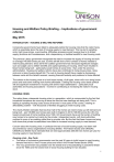 Housing and Welfare Policy Briefing – Implications of government reforms May 2015 INTRODUCTION – HOUSING & WELFARE REFORMS Consecutive governments have failed to adequately tackle the housing crisis that the nation faces, which is essentially about the lack of housing supply to meet demand. This has led to spiralling rents, high house prices, overcrowding, difficulties accessing social housing (due to its limited supply) evictions and homelessness, and a dependency on welfare benefits to meet housing costs. The previous Labour government recognised the need to increase the supply of housing and built on average 146,000 homes per year, but this still fell short of the numbers of homes needed to meet housing demand. Since 2010 the Coalition government has introduced significant changes such as budget cuts to welfare benefits and capital spending on housing, which have resulted in fewer homes being built – particularly social homes at social rents - than under the previous administration. Housing and welfare reforms have also contributed to rising house prices, rising rents and a rising housing benefit bill. The cuts to housing benefit have created a discrepancy between rents and the benefit received, causing financial hardship and problems to those affected. The solution to the housing crisis is to build more homes, of all types, which will in turn bring house prices and rents down making more homes affordable. Tackling the housing crisis needs political will and significant investment in housing with all the major stakeholders – particularly local authorities and housing associations - involved in contributing to increasing the nation’s housing stock. HOUSING CRISIS The nation faces a desperate housing crisis in a generation, which is compounded by the fact that household formations are occurring at twice the rate that new dwellings are being built. This is leading to spiralling housing costs across all tenures in most parts of the country, creating an affordability problem – with thousands of families struggling to meet housing costs. The charity Shelter estimates that less than half of the homes we need to keep up with demand are being built – just 109,660 new homes were built in England in 2013 (128,000 across the UK), the lowest annual level of home building since 1946. UK Governments have put the burden of building new homes to be carried out mainly by the private / independent sector, with local authorities confined to more of an enabling rather than a provider role. But the fact that fewer homes are being built shows that private housebuilders have failed to increase housing supply to meet demand. Concern about the housing crisis, in particular the lack of social housing supply, has been well documented by various organisations (including Shelter, The Fabian Society and UNISON). UNISON and Shelter have estimated that we need approximately 250,000 new homes per year for housing supply to meet demand. Housing crisis - Key Facts The failure of successive governments over the past 30 years to build homes to meet housing demand has led to a rise in house prices and rents in the Private Rented Sector (PRS) The Tory government has presided over the lowest level of housebuilding in peacetime Britain since the 1920s and the lowest level of social housing building for two decades 1 Government housing policies such as the Affordable Housing Programme and cuts to capital spending on housing have led to the dramatic reduction in the supply of affordable and social housing, which has put pressure on the Private Rented Sector and pushed up house prices and rents In 2010 only 115,000 new homes were built in England. The last time 200,000 homes a year were built in England was in 1988 Homeownership is in actual decline and fallen to a 30-year low due to high house prices: there are over 200,000 fewer homeowners since 2010 The house price to earnings ratio has increased significantly in all regions House prices remain beyond the reach of many, particularly first-time buyers face having to pay larger deposits because of high house prices It takes an average family 22 years to save for a deposit on a home Since 2010 house prices have rocketed: the average house price in England and Wales is £275,123, in Scotland the figure is £173,000 and in Northern Ireland it is £152,000 Rents in the private rented sector continue to rise faster than wages in all parts of the country The number of working households who have found themselves needing recourse to housing benefit to enable them to meet their housing costs has doubled in the last 5 years Due to spiralling housing costs, a record number of young people – one in four (3.35 million) are living with their parents into their twenties and thirties. The lack of affordable housing and high rents in the PRS has led to overcrowding and long waiting lists for social housing. In 2012 the number of families on the waiting list stood around 1.8m (an 80% increase since 1997) According to a recent UNISON report young people under 35 – whether they are in work or not – are now the largest group, over 50%, living in the private rented sector, due to the lack of social housing and finance for homeownership The Right to Buy has led to the sale of 1.9m council homes in England and has also led to a significant reduction in the number of social housing in the devolved nations In 2014 just £100m was raised by councils from the sale of council homes through the Right to Buy policy, but the policy costs £4.5bn a year to fund HOUSING SUPPLY IN DECLINE The construction of new homes has been in decline for decades, leading to an acute shortage of housing which in turn has pushed house prices and rents up. The housing crisis calls for adequate measures, such as significantly increasing the supply of all types of housing, especially social housing, to meet housing demand. Yet, the Coalition government has presided over the lowest level of housebuilding since