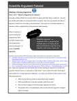 Scie Scientific Argument Tutorial 1.1 Making a Strong Argument Part 1 of 5 – What is Argument in Science? Everyday, people attempt to convince others to agree with their ideas or opinions. How can you decide which ideas are strong and which are weak? How can you evaluate the ideas or opinions of others so as to make a sound decision? One way to is to evaluate whether an opinion or idea is supported by strong evidence and reasoning. When an opinion is science-based and supported by both scientific evidence and reasoning (known science concepts), it is called a scientific argument. Scientific Argument – a statement that is supported by multiple pieces of measured or observed evidence and links it all together with science facts and knowledge. Explicitly teach students WHY learning to make and evaluate an argument is important: Scientific Arguments are found everywhere and heard every day-part of our society (e.g. media, advertising, medicine, etc.) Students need to learn to recognize them and evaluate them to decide if they agree, want to buy a product, follow scientific breakthroughs, or even seek out certain medicine Ultimately students need to learn to make their own arguments to persuade others of their ideas Give a real world example of scientific arguments (“Who is the best____(basketball player, X orY).”) Let’s watch and compare two individuals that are each making an argument to answer the question: Should runners run barefoot or with shoes? As you watch the videos think about what makes for a strong, persuasive argument. As a class you will discuss the answers to the following questions: What are the ideas or opinions expressed by each speaker? What was different in how each speaker made their case? Who has the strongest (more believable) argument and why? The speaker who is less believable, what would make his argument stronger? What is missing? Scie Scientific Argument Tutorial 1.1 Watch Tutorial Video 1 CLASS Watch Tutorial Video 2 Watch the videos and think about the questions above. Take notes on the videos in your student pages on the AScientific Argument Notes sheet. Afterwards you will discuss your answers as a class. Ideas or opinions are different from arguments. Opinions are not arguments because they lack three critical components: claim, evidence, and reasoning. Similarly, a scientific argument has a science-based claim, is supported by evidence, and understood through known scientific facts (reasoning). Scie Scientific Argument Tutorial 1.1 A scientific argument... A scientific argument… ... IS NOT fighting ... IS NOT me against you ... IS NOT only based on opinions and ... IS found everywhere in daily life beliefs ... IS a way to persuade others truthfully ... IS presenting an idea and supporting it with evidence & facts Emphasize Scientific Argumentation as a type of discourse where EVERYONE’s ideas are heard and respected. Setting and enforcing good classroom discussion norms or classroom rules will greatly enhance instruction of scientific argumentation. If you have a set of class rules posted in your room you might want to refer to it at this time. If you don’t or they do not emphasize listening and/or how to respond to classmates in a discussion you should set and post rules now to refer to them in future. The Building Blocks of Scientific Argument Scientific Argument: A set of persuading statements answering a scientific question that includes a claim supported by multiple pieces of evidence and a reasoning statement explaining what science concept links it all together. Three Components of a Scientific Argument: Claim: a statement about a phenomena or event (written as a full sentence). Evidence: a trend or pattern from measurements and observations, collected during an investigation, that supports a claim. Scientific Reasoning: known science fact or knowledge that explains the connection between evidence and claim. Write these definitions on a post-it or poster to hang in class to refer back to throughout the year (there will be four posters all together). As you watched the argument videos you might not have noticed when opinions were being used instead of science facts. For the next few class periods you are going to engage in a tutorial to learn how ideas can be presented and supported with facts and reasoning. You are going to learn about strong scientific arguments that are convincing to others (i.e. your classmates, teacher, and/or a city council) and how to tell them apart from opinions. At the end of this tutorial you will be able to: 1. Identify the components of a scientific argument 2. Evaluate the strength of a scientific argument and its components A good ticket out the door is to have students write down their own definition of Scientific Argument after having seen the videos and heard the definition. Scie Scientific Argument Tutorial 1.1 Part 2 of 5 – The “Claim” of Scientific Argument Knowing that a scientific argument must have claim, evidence and reasoning, let’s examine the first component: the claim. Claims are statements about a phenomena or event. However some claims are obviously stronger and more persuasive than others. What might make a claim stronger or more persuasive than another? Consider the claim statements from the barefoot running videos. Which claims are strong? Which are weak? As students discuss claims ask “What do these claims have in common…all are statements. However, how do we determine which are stronger? What helps to make some stronger? Remind students of the question and ask if these claims each address the question asked? Which statements are also clear and understandable? How could the weaker claims be strengthened? Question: Should runners run barefoot or with shoes? A. We have this idea that in order to run all you need are shoes but actually you just need feet. Rank 2 B. Barefoot running would be great if we grew up barefoot, but we didn’t so people should not run barefoot. Rank 1