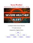 Severe Weather! Thunderstorms, Tornadoes and Hurricanes … oh my! A webquest about Severe Weather 5th Grade (Science) Designed by: Meghan Helms Home Introduction Resources Checklist Task Process Evaluation Conclusion Introduction Attention ALL RESIDENTS!! The town of Extremeville needs your help! There have been various types of severe weather approaching the town and the residents aren’t sure what to do. As a resident of Extremeville, you will learn from expert meteorologists about a type of severe weather. It’s important to learn about these storms so you and all the other residents in Extremeville will know what to expect and what to do to stay safe! But hurry, the storms are moving quickly and there is no time to waste! HOME Task You are a resident in the town of Extremeville and you must investigate a type of severe weather so you can help to warn the other residents in your town. You will choose one type of severe weather to focus on and you will have the opportunity to learn from expert meteorologists to gather more information. You may work with other students who choose the same type of severe weather as you or you may work by yourself. But your goal will be to take all the information learned from your expert and create a public service announcement that will play for the town of Extremeville to help educate everyone about severe weather! But you must work efficiently because the storms will not wait! HOME Process 1. First you need to decide what type of severe weather you would like to learn more about. 2. Once you choose the storm you would like to learn more about, you can either work by yourself or you can find others in the room that also chose that particular storm to complete the rest of the process. If you work with a group make sure everyone in the group participates because you will be filling out an evaluation of how well your group members worked together. 3. Follow the link to the specific severe weather of your choice and learn from the meteorologist and their favorite websites (you will either click on the Tornado, Thunderstorm or Hurricane links). Take notes in your science journal so that you can remember all the information about this type of severe weather. Refer to the rubric and checklist for all the information you will need to gather for your final presentation. 4. After you have gathered facts about your chosen type of severe weather you must now decide with your group (or individually) how you are going to teach the rest of the people in Extremeville about your storm through a public service announcement. You can choose from the following sources to share your knowledge: i. Voicethread Public Service Announcement ii. Flip Video Public Service Announcement 5. After you choose the way you are going to share your information with the other residents of Extremeville, you will need to make sure to include EVERYTHING on the checklist in your public service announcement. This is for your neighbors and your survival so don’t leave anything out! HOME Resources (Choose ONE) Tornadoes Click on the following links and learn from expert meteorologist Twisty. He loves tornadoes and will tell you all he knows about them! http://www.educationworld.com/a_lesson/lesson116.shtml http://www.weatherwizkids.com/weather-safety-tornado.htm http://skydiary.com/kids/tornadoes.html http://www.healthyschoolsms.org/health_education/documents/tornado1.pdf http://www.healthyschoolsms.org/health_education/documents/tornado2.pdf http://www.healthyschoolsms.org/health_education/documents/tornado3.pdf http://www.nssl.noaa.gov/edu/safety/tornadoguide.html http://www.weatherwizkids.com/weather-tornado.htm http://www.youtube.com/watch?v=EzBiEN6bXEY http://pbskids.org/dragonflytv/show/tornados.html http://www.april31974.com/tornado_kit.htm HOME Severe Thunderstorm Click on the following links and learn from expert meteorologist Stormy. She loves thunderstorms and will tell you all she knows about them! http://www.weatherwizkids.com/weather-thunderstorms.htm http://www.weatherwizkids.com/weather-safety-thunderstorm.htm http://www.factmonster.com/ipka/A0875669.html http://www.morganga.org/CountyOffices/EmergencyManagement/WeatherSafety/ThunderstormFacts Safety/tabid/442/Default.aspx http://www.morrowcounty.info/www/index.php?option=com_content&view=article&id=72&Itemid=12 3 http://www.theweatherchannelkids.com/weather-ed/weather-encyclopedia/severe-thunderstorms/ http://www.historyforkids.org/scienceforkids/physics/weather/lightning.htm http://www.dailymotion.com/video/xaywc0_kids-music-the-thunderstorm-by-kraz_music HOME Hurricanes Click on the following links and learn from expert meteorologist Wendy. She loves hurricanes and will tell you all she knows about them! http://www.weatherwizkids.com/weather-hurricane.htm http://www.weatherwizkids.com/weather-safety-hurricane.htm http://www.yatcom.com/neworl/weather/whatis.html http://kids.earth.nasa.gov/archive/hurricane/ http://kids.earth.nasa.gov/archive/hurricane/creation.html http://kids.earth.nasa.gov/archive/hurricane/damage.html http://skydiary.com/kids/hurricanes.html http://www.emergencyplanningexperts.com/hurricane-survival-kits/ http://www.schoolkidshealthcareblog.com/2011/5-hurricane-safety-tips.html http://video.nationalgeographic.com/video/kids/forces-of-nature-kids/hurricanes-101-kids/ HOME Evaluation Working/Group collaboration rubric (Teacher) None – Very Few Times Most of the Time All of the Time Total Points Most of the Time All of the Time Total Points Collaborating The teacher observers the students working together by listening and talking on topic. Participating The teacher observes students interacting and participating in all aspects of the webquest. Questioning The teacher observes students interacting and questioning each other’s expertise to come to a conclusion Respecting The teacher observes the students respecting each other’s opinions and politely working together. Individual Rubric (Teacher) None – 